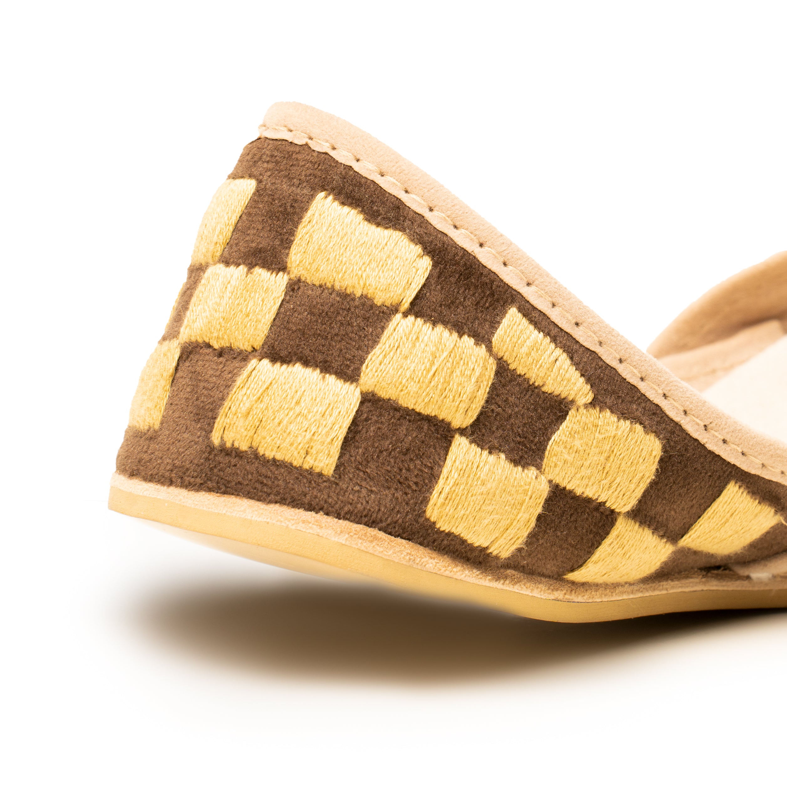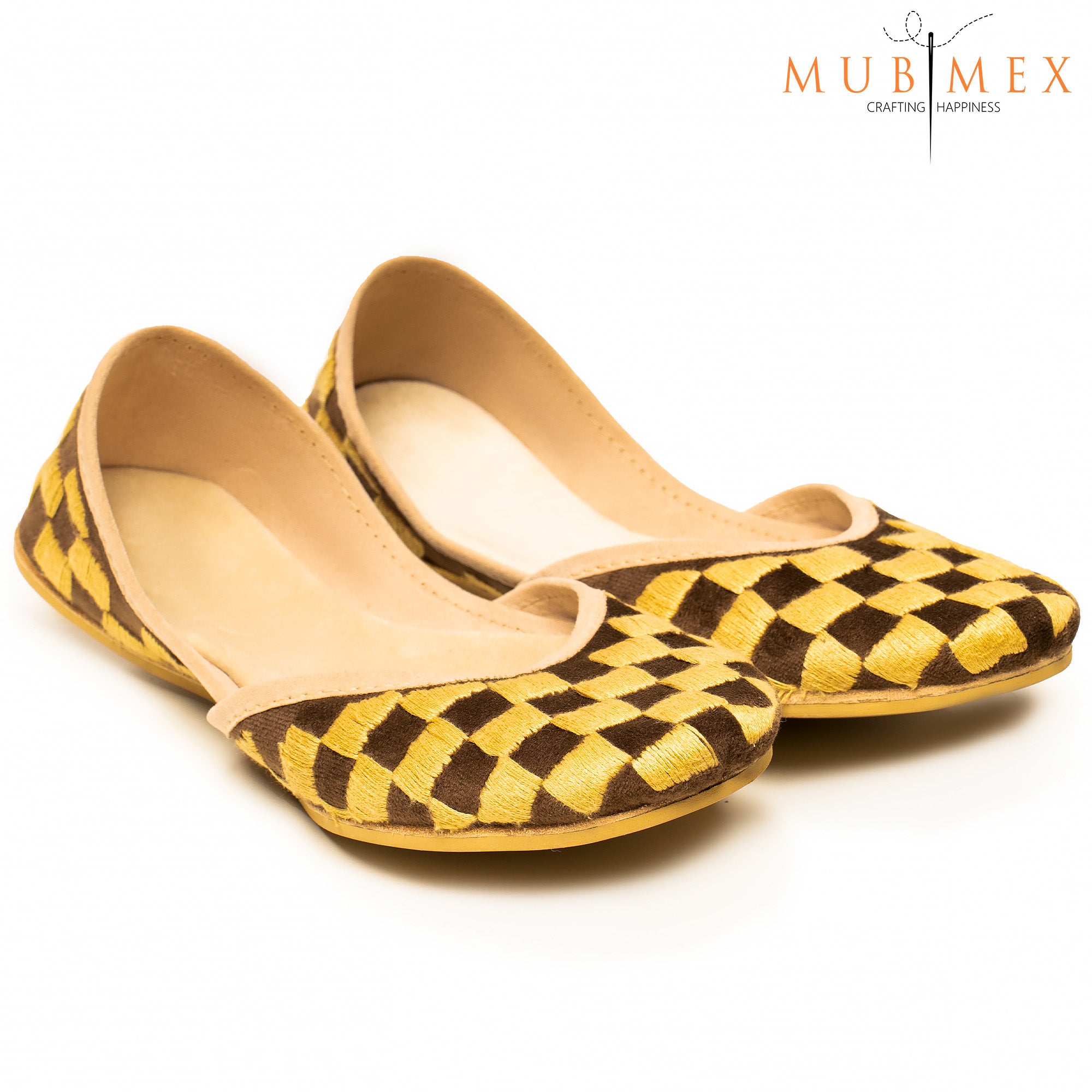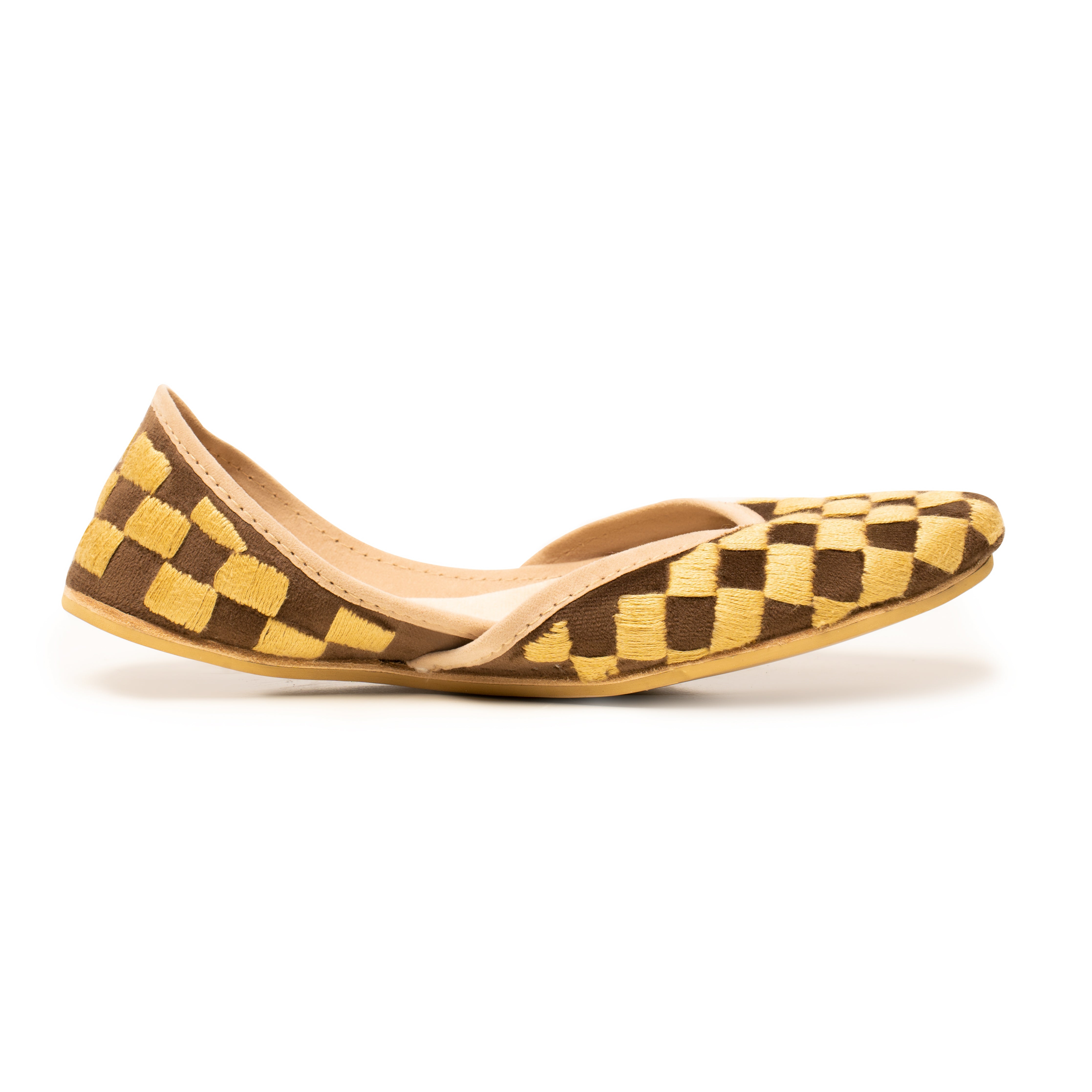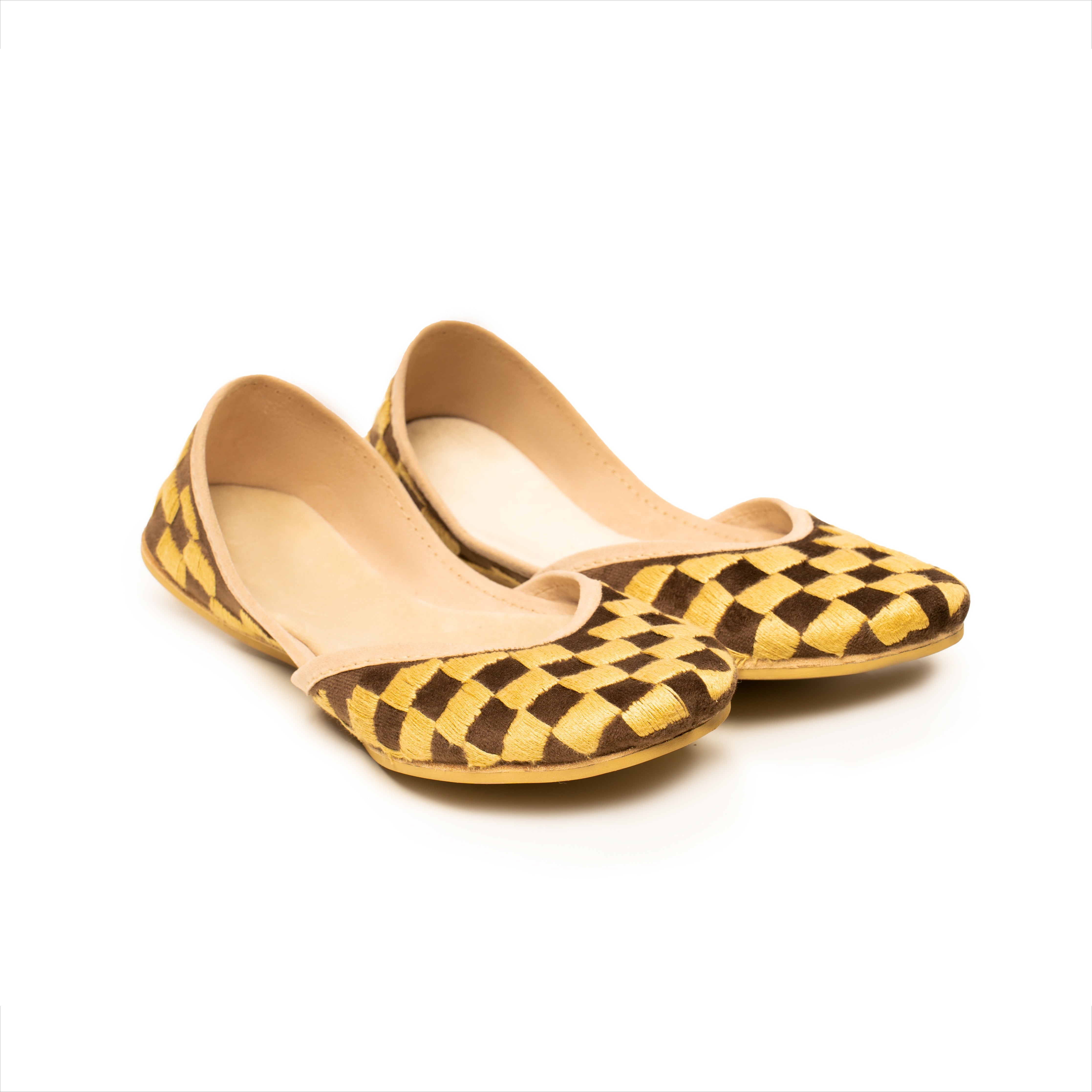 Alluring khussa meticulously hand embroidered in high velvet, embellished with ravishing brown square design. The strong combination of Gold and Brown shades creates a visually appealing pattern that makes it elegant and striking. Designed with great care, Khussa exhibits impeccable craftsmanship and attention to detail. The soft velvet material not only adds luxury but also provides ultimate comfort to your feet. Step into the world of "Chess-Gold" and make a statement with this fusion of fine design and fine art.