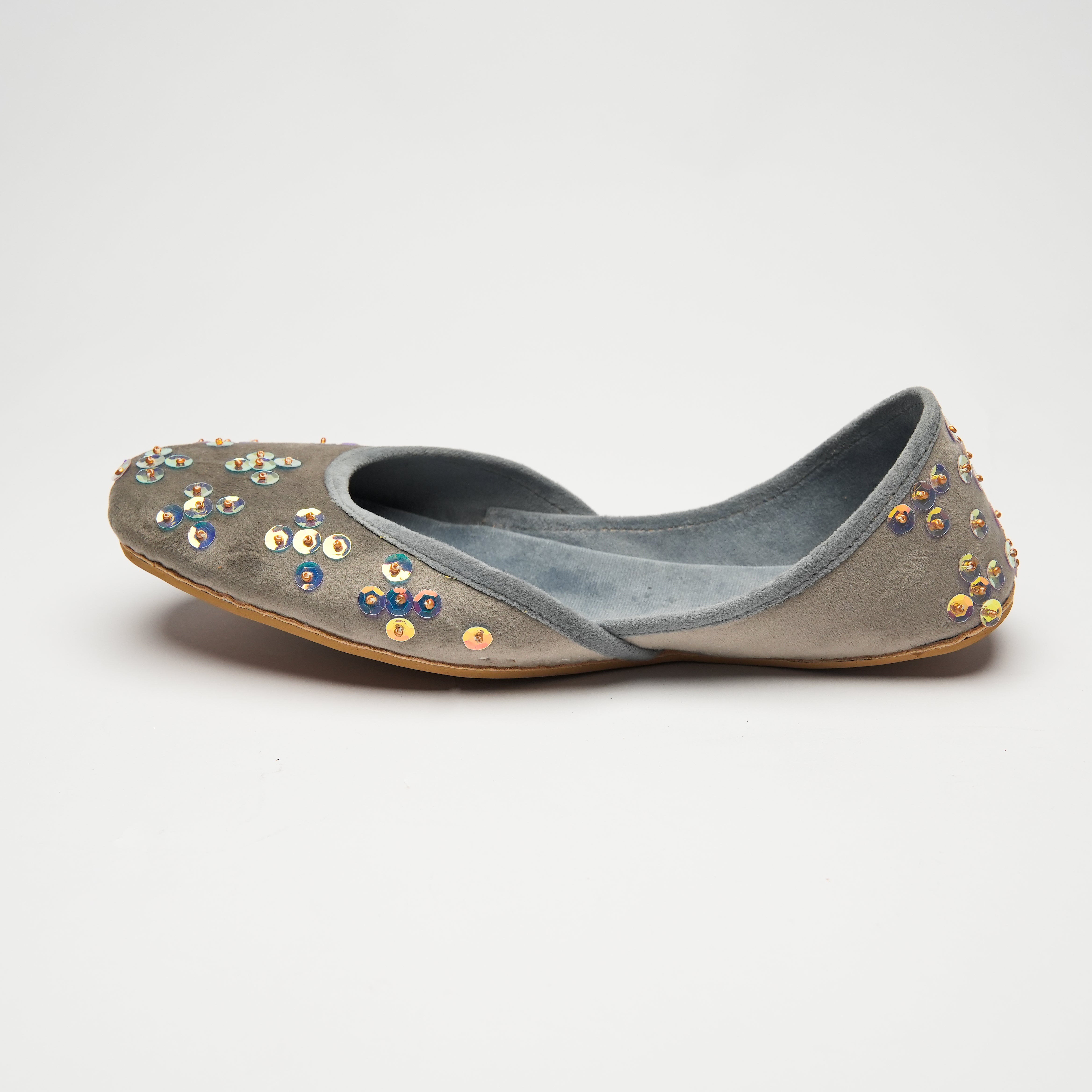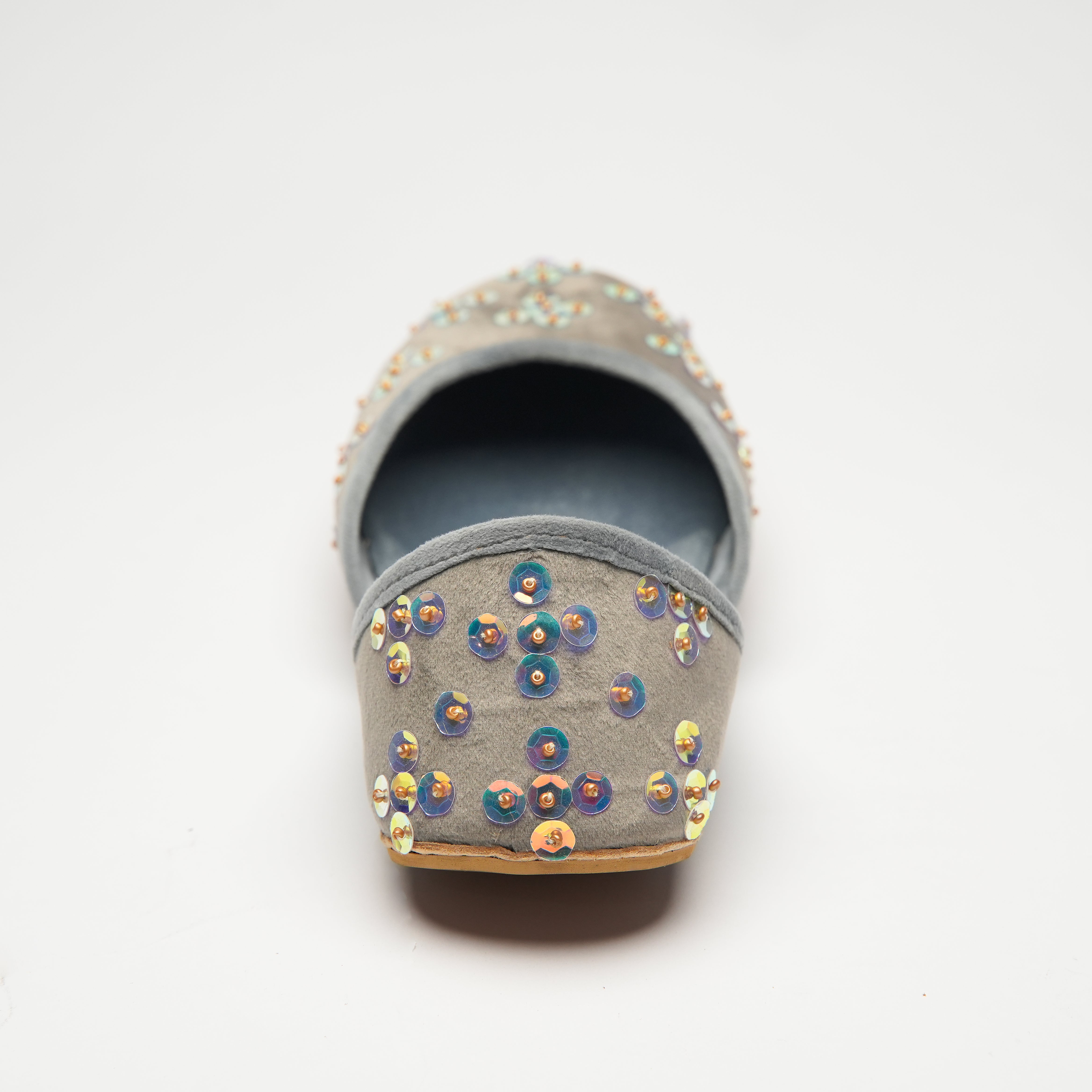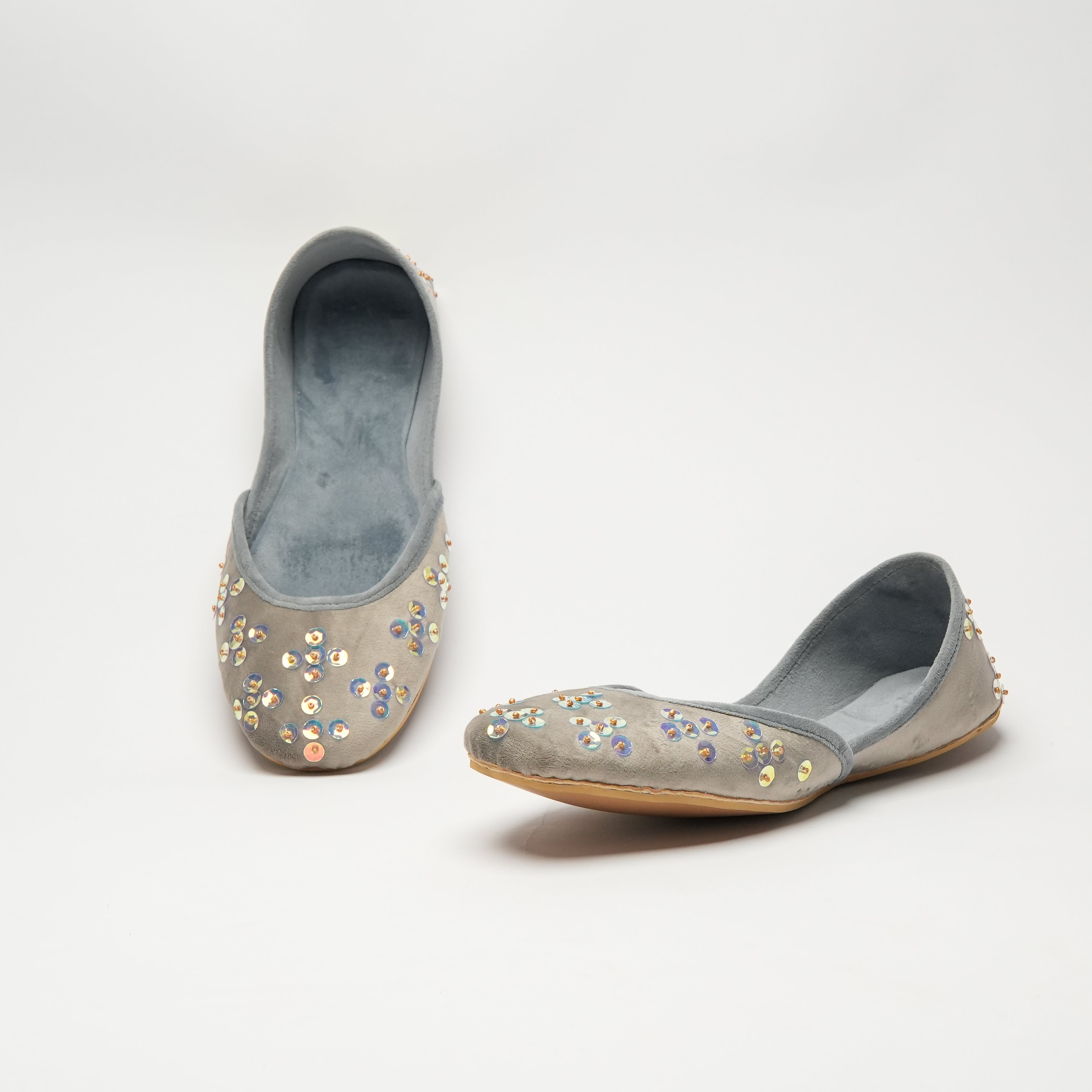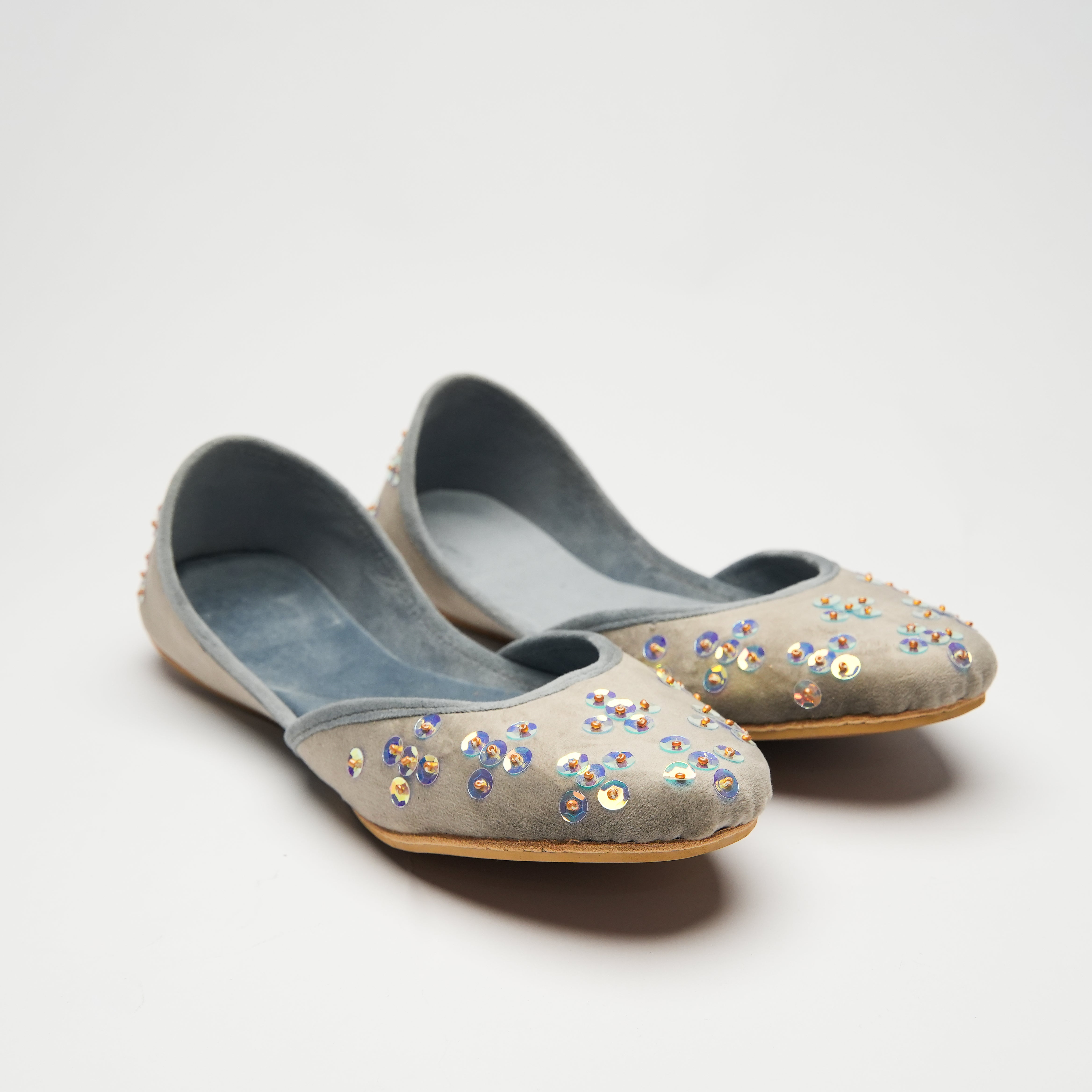 Jasmine is a simple yet elegant Khussa with soft light grey velvet base all over the Khussa including the inserts. Jasmine has been embellished in symmetrical flowers all over the front of the Khussa. A combination of one irredecent sequins with a small golden bead on top has been used to represent one petal. The core of the flower has the same design element with two petals on each side of it. The irredecent sequins with a light translucent bead adds to the softness of the light grey, enhancing the beauty of Jasmine.