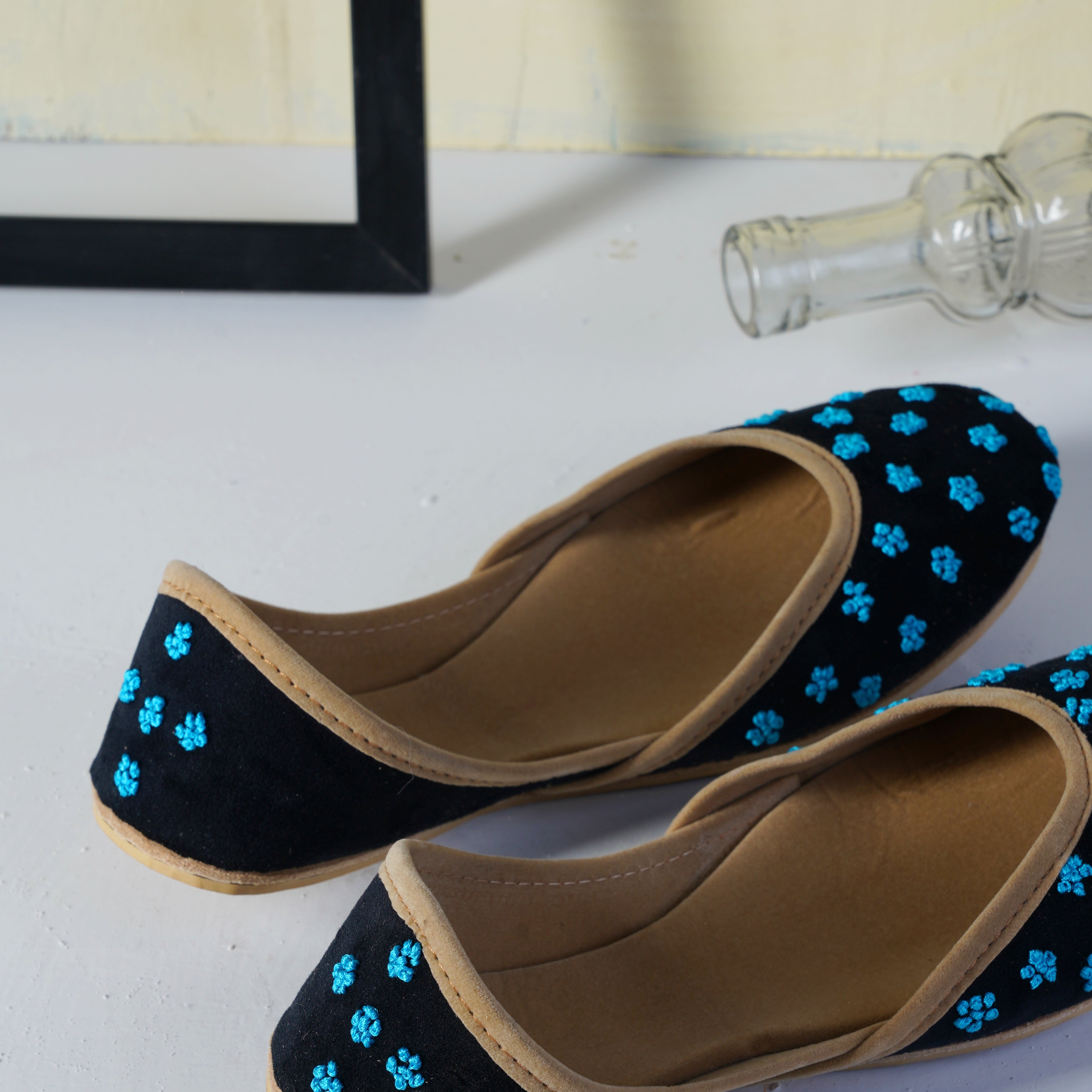 Mehak is a solid black Khussa with white French knot embroidery. It is primarily inspired by "Raat ki rani - Jasmine". The simple yet symbolic design is perfect for every occasion