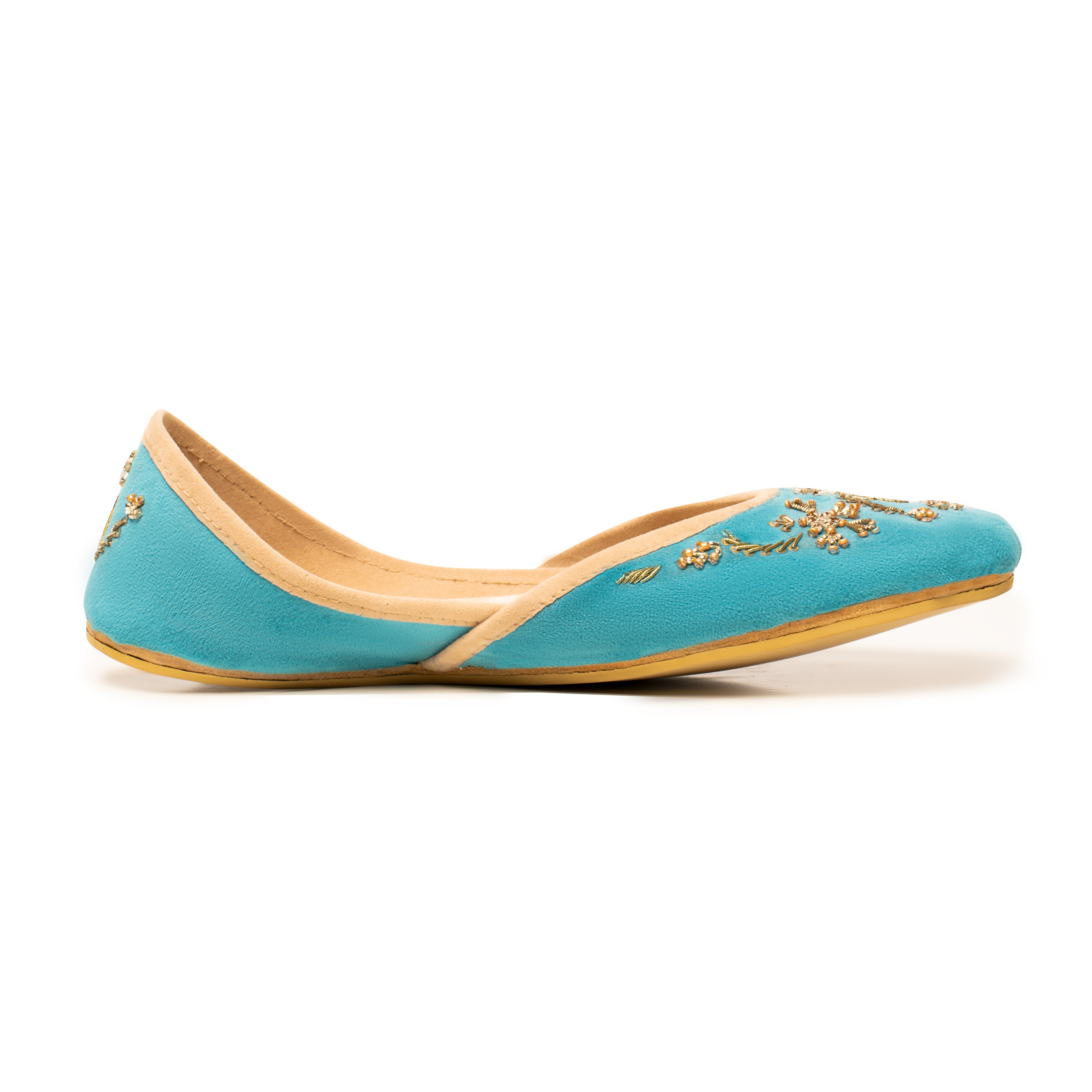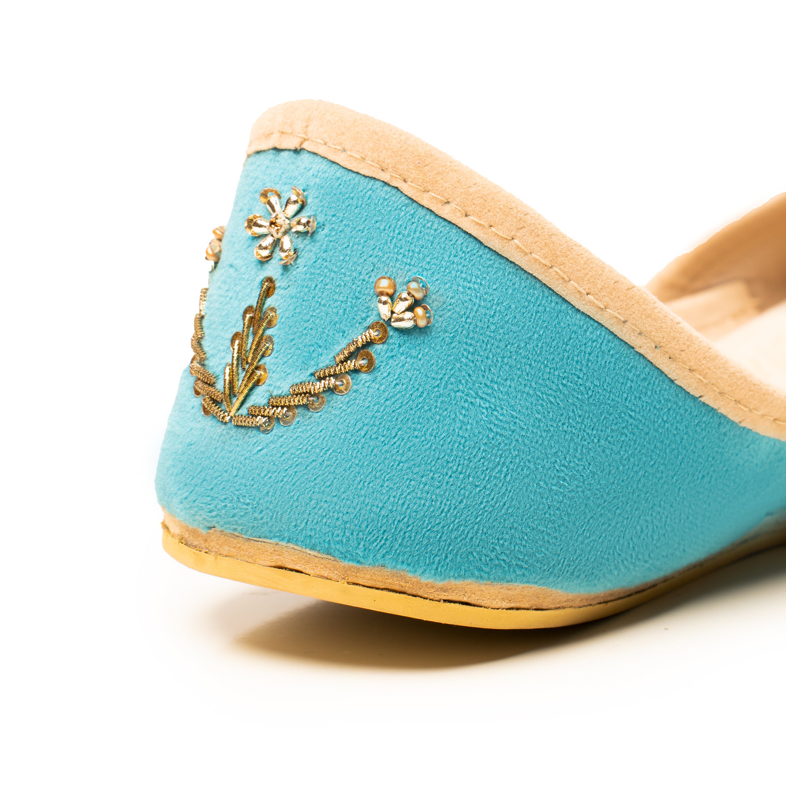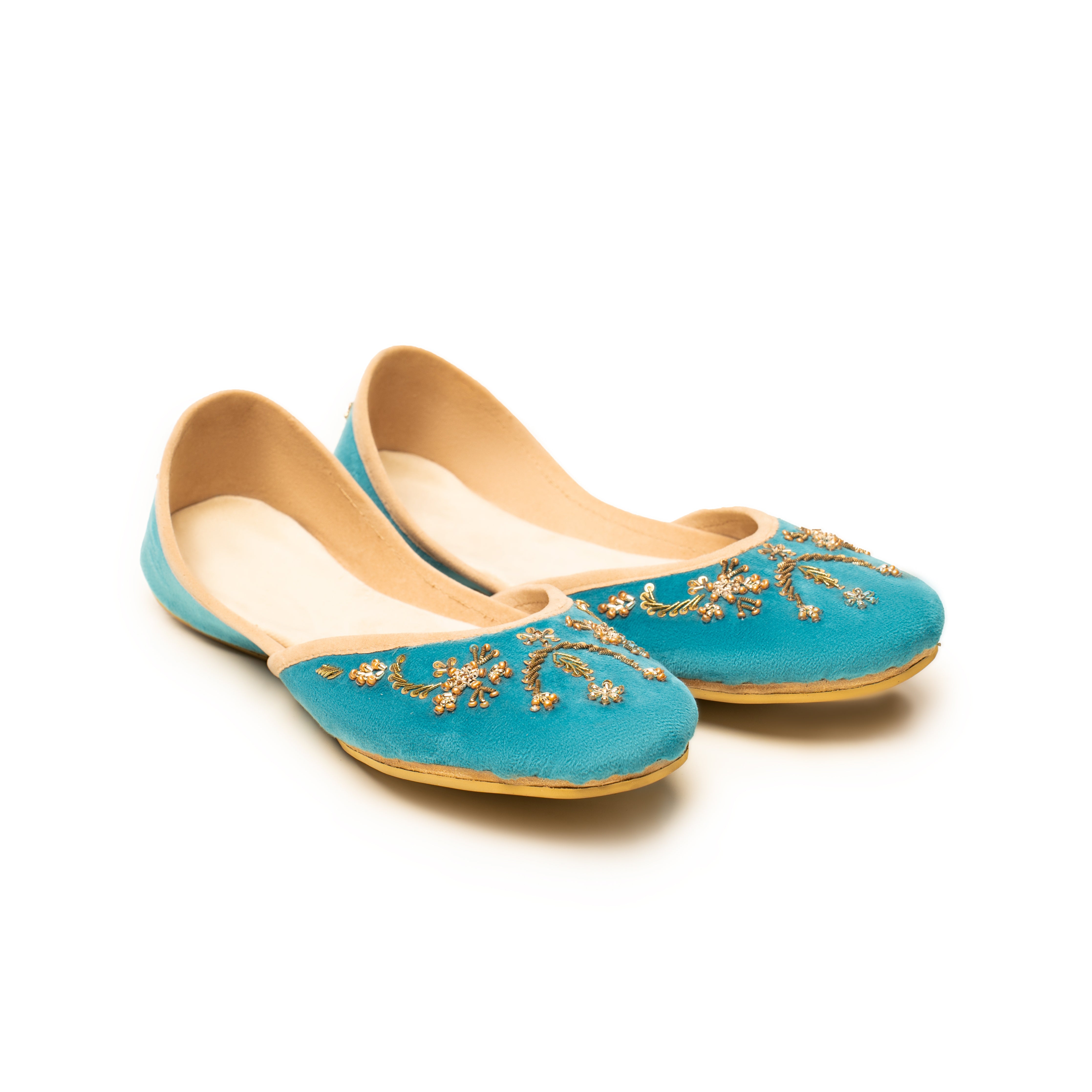 Introducing the mesmerizing Aurelia Nilofar Jewel Khussa! This exquisite piece of art for your feet is crafted in a captivating shade of Ferozi. These shoes are sure to make a statement. Adorned with dazzling embellishments, delicately handcrafted with precision, showcases shimmering gems and intricate designs, adding a touch of regal splendor. The Ferozi hue beautifully complements a range of outfits, from traditional attire to contemporary fashion. Whether you're attending a festive occasion, a grand celebration, or simply seeking to add a touch of glamour to your everyday attire, the Aurelia Nilofar Jewel Khussa will be your perfect companion.