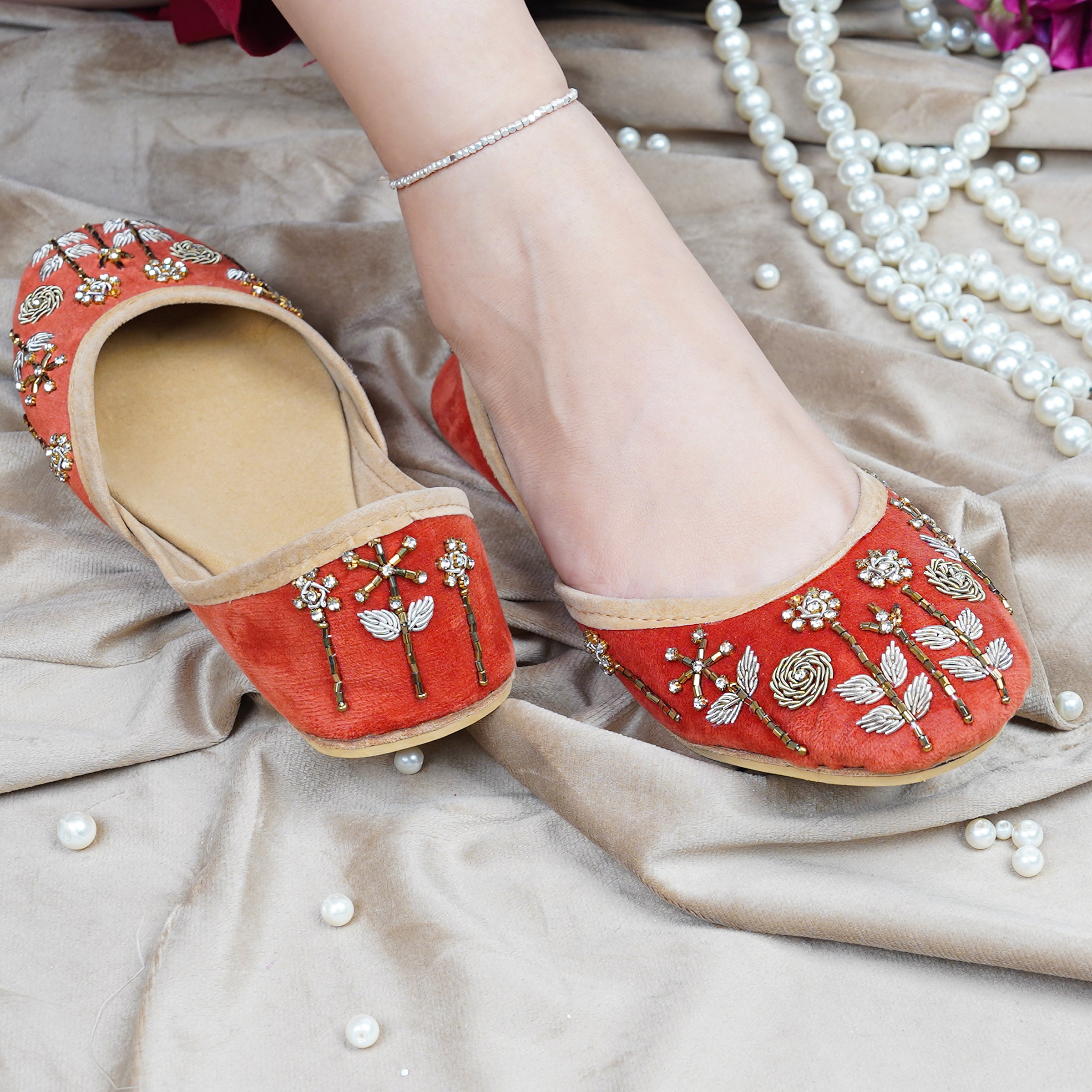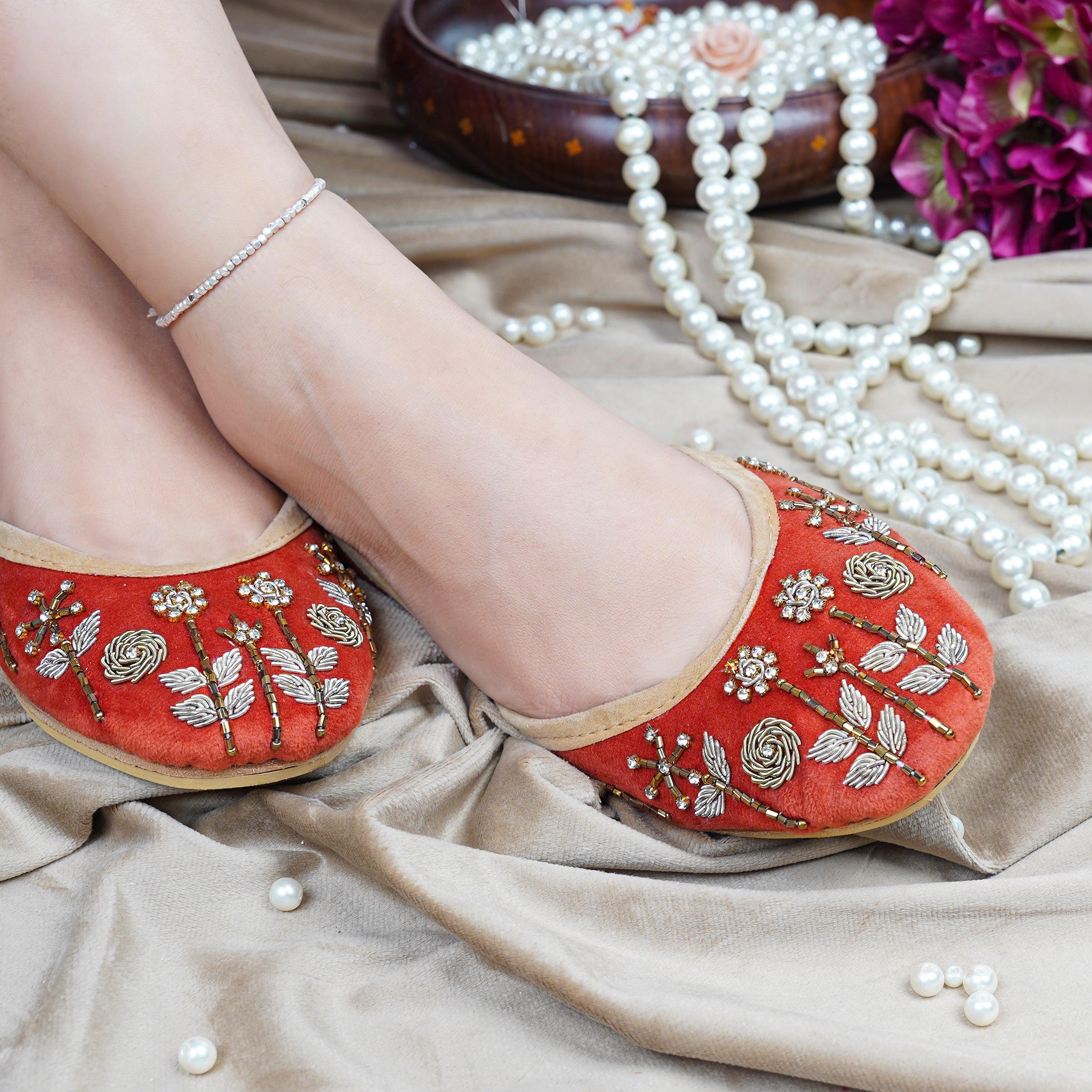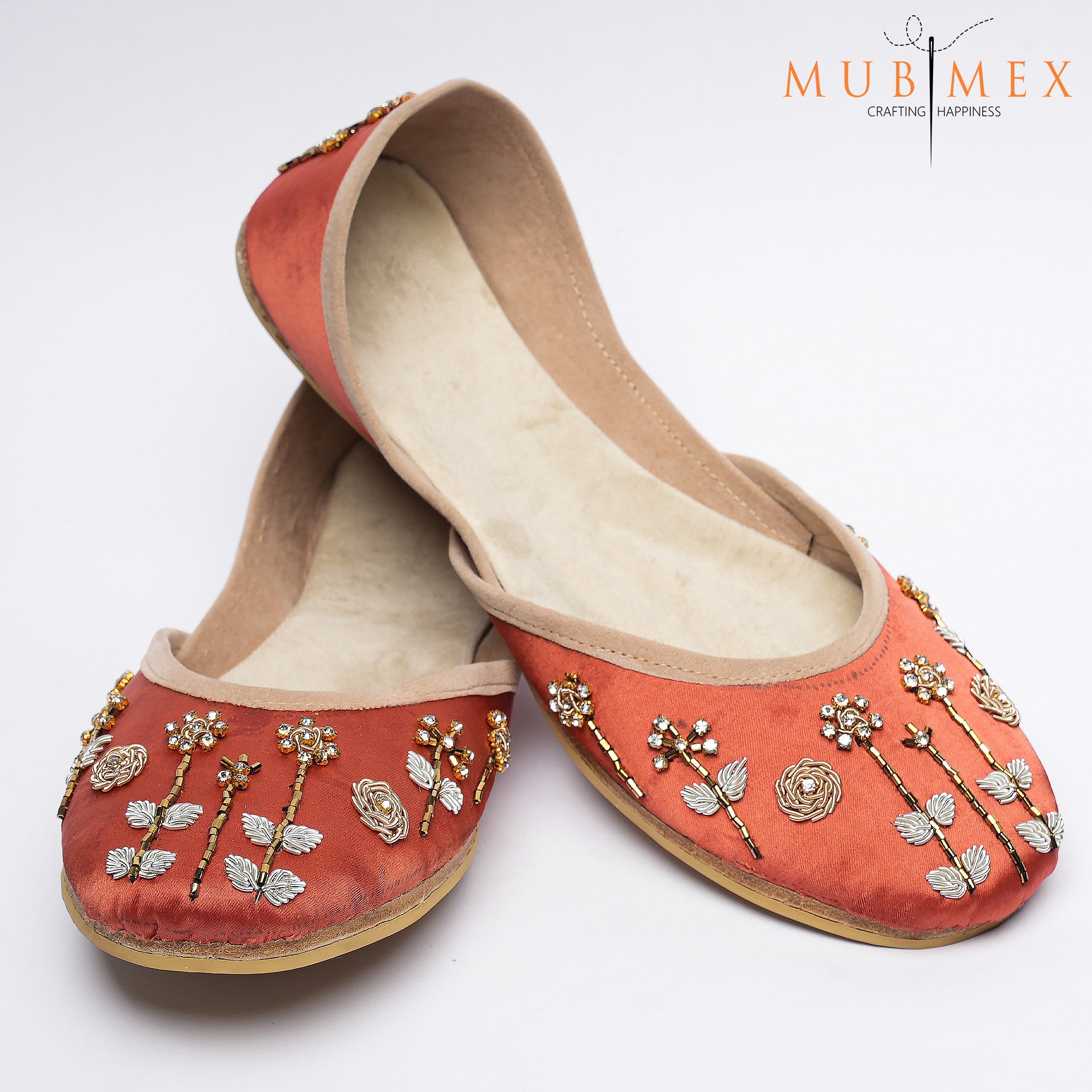Crafted with top-quality materials, it is designed for all-purpose wear, ideal for any occasion or everyday use. The outsole is fashioned from premium rubber, ensuring not only comfortable walking but also slip resistance, providing added safety and peace of mind. This khussa/ Ballet flat is built to last, fashioned from pure hand processed leather that will withstand the test of time. The inner sole features a luxurious velvet lining, making it incredibly comfortable and snug for your feet.