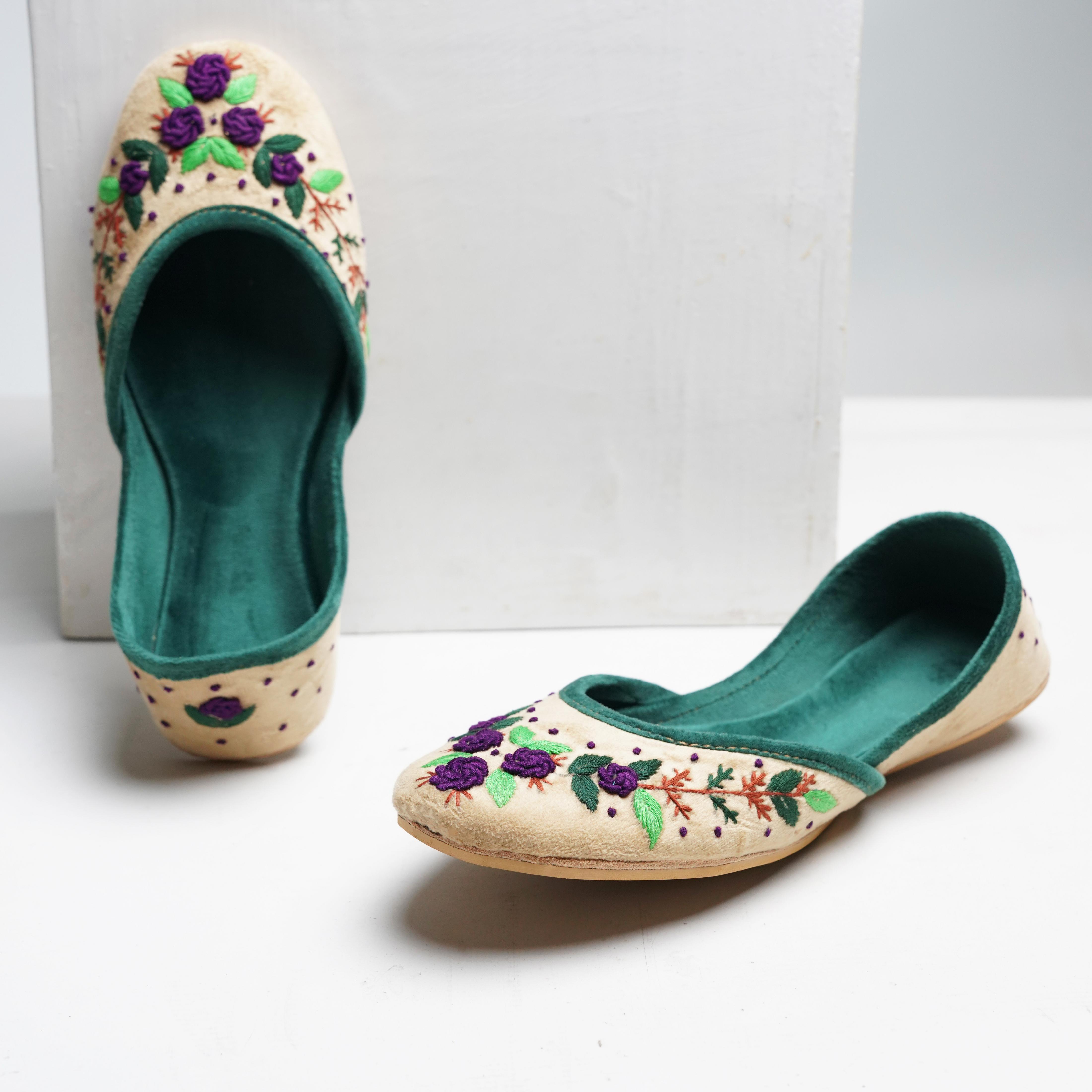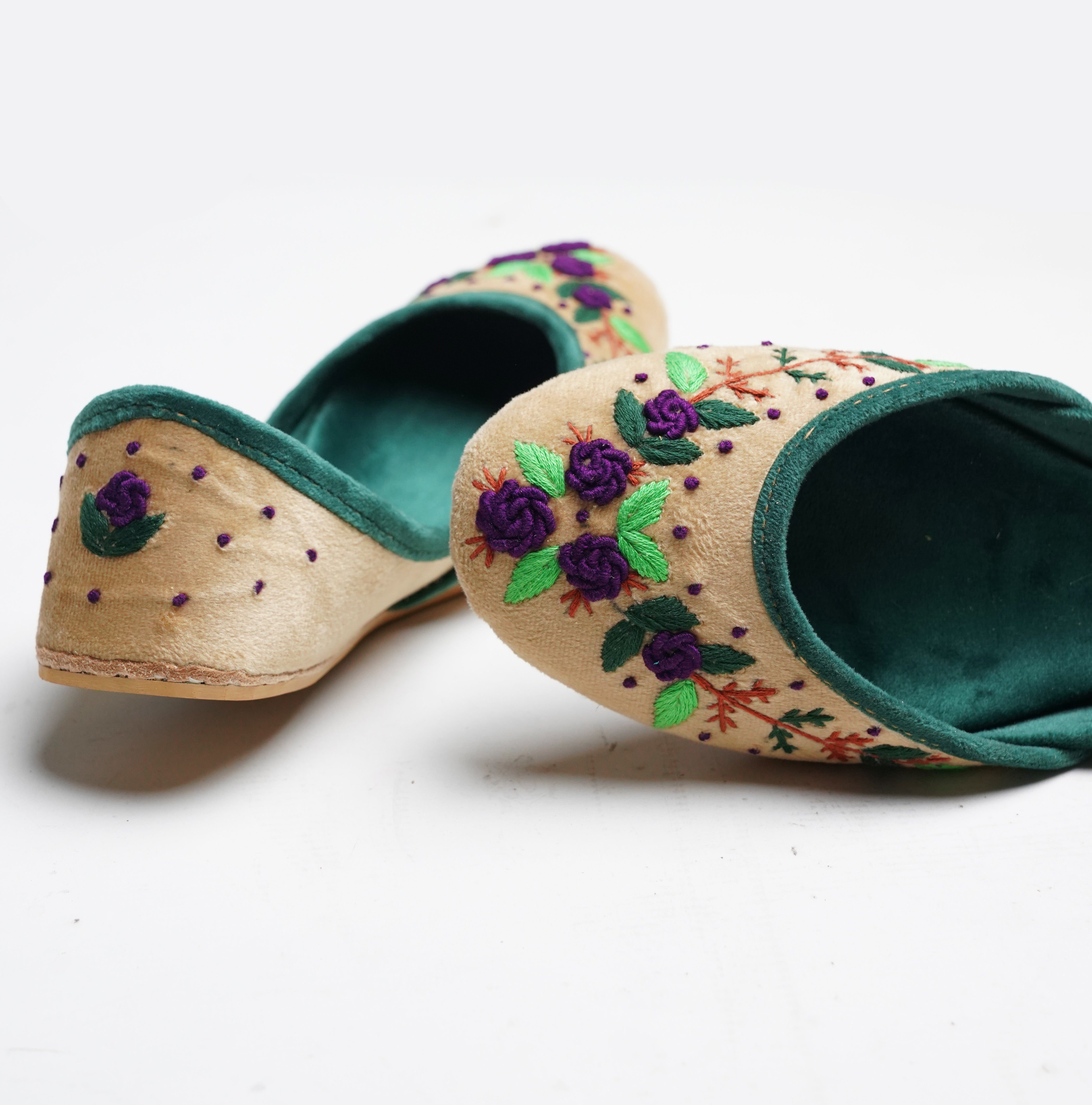 Crafted with top-quality materials, it is designed for all-purpose wear, ideal for any occasion or everyday use. The outsole is fashioned from premium rubber, ensuring not only comfortable walking but also slip resistance, providing added safety and peace of mind. This khussa/ Ballet flat is built to last, fashioned from pure hand processed leather that will withstand the test of time. The inner sole features a luxurious velvet lining, making it incredibly comfortable and snug for your feet.