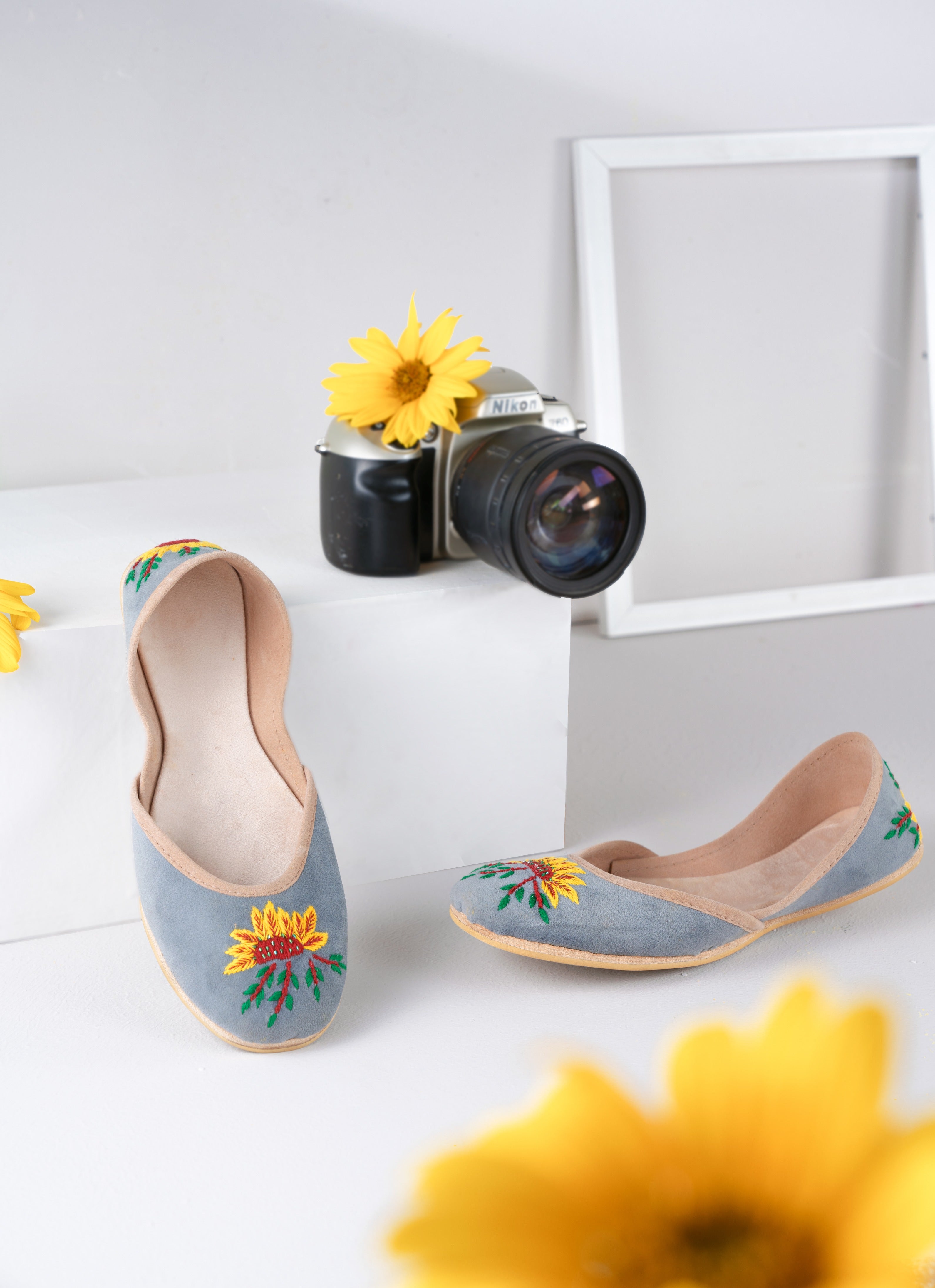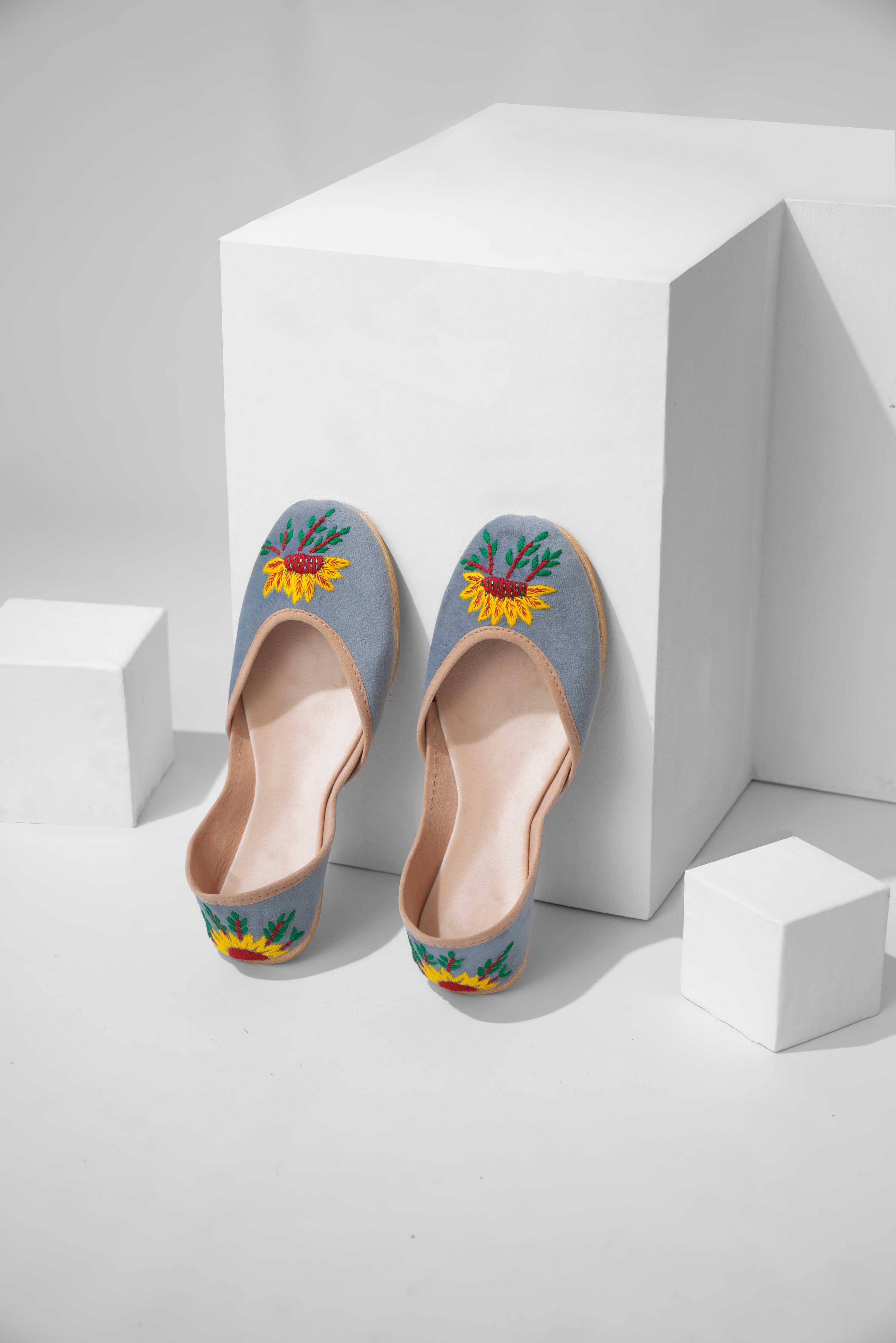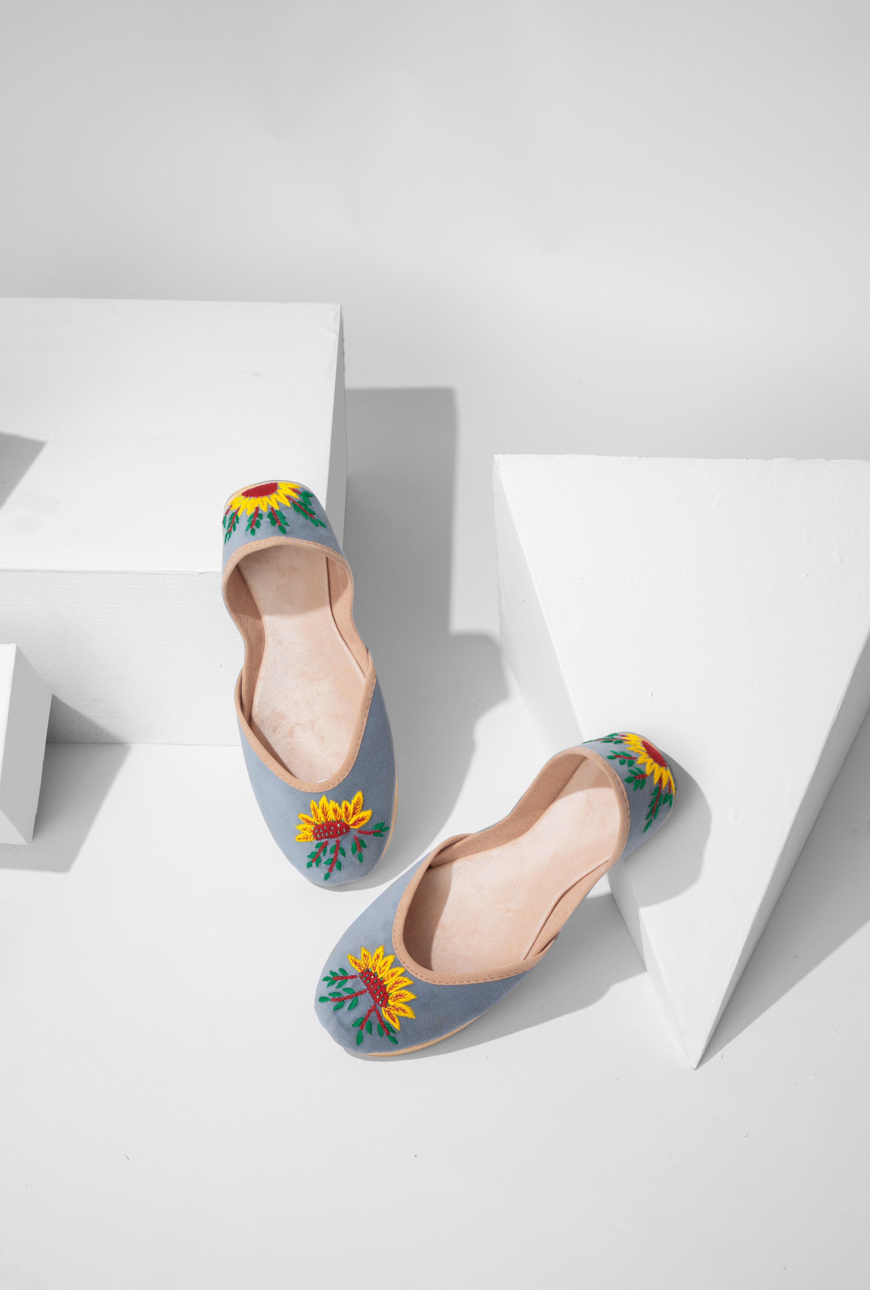 The exquisite details of these khussas are immediately apparent, even from a distance. The vibrant sunflower motif is delicately hand-embroidered using the finest threads, creating a stunning contrast against the rich sky-blue base. The embroidery work is precise and intricate, with every stitch contributing to the overall beauty and opulence of the design. With their bold, opulent, and composed design, these khussas are sure to turn heads and make a statement wherever you go.