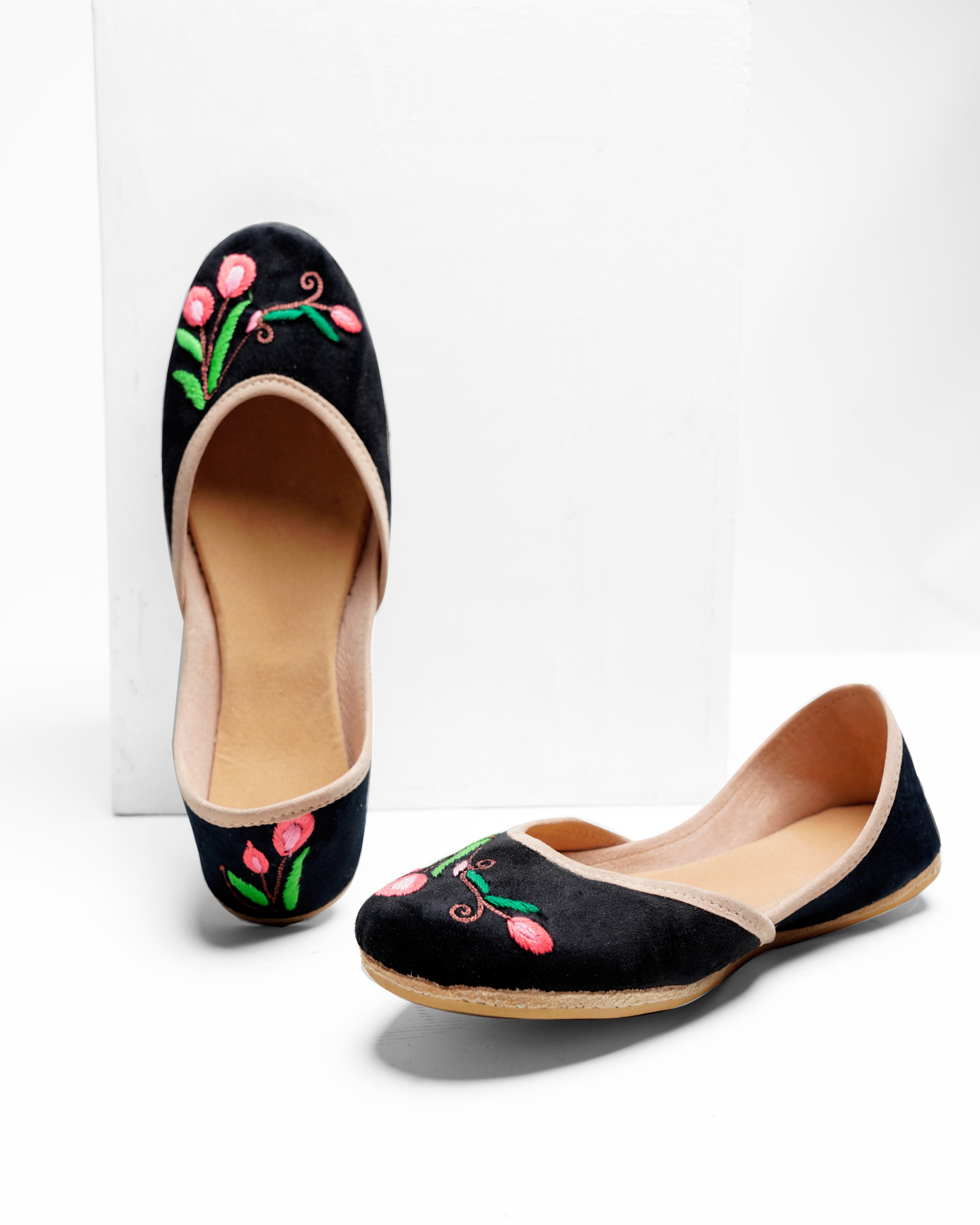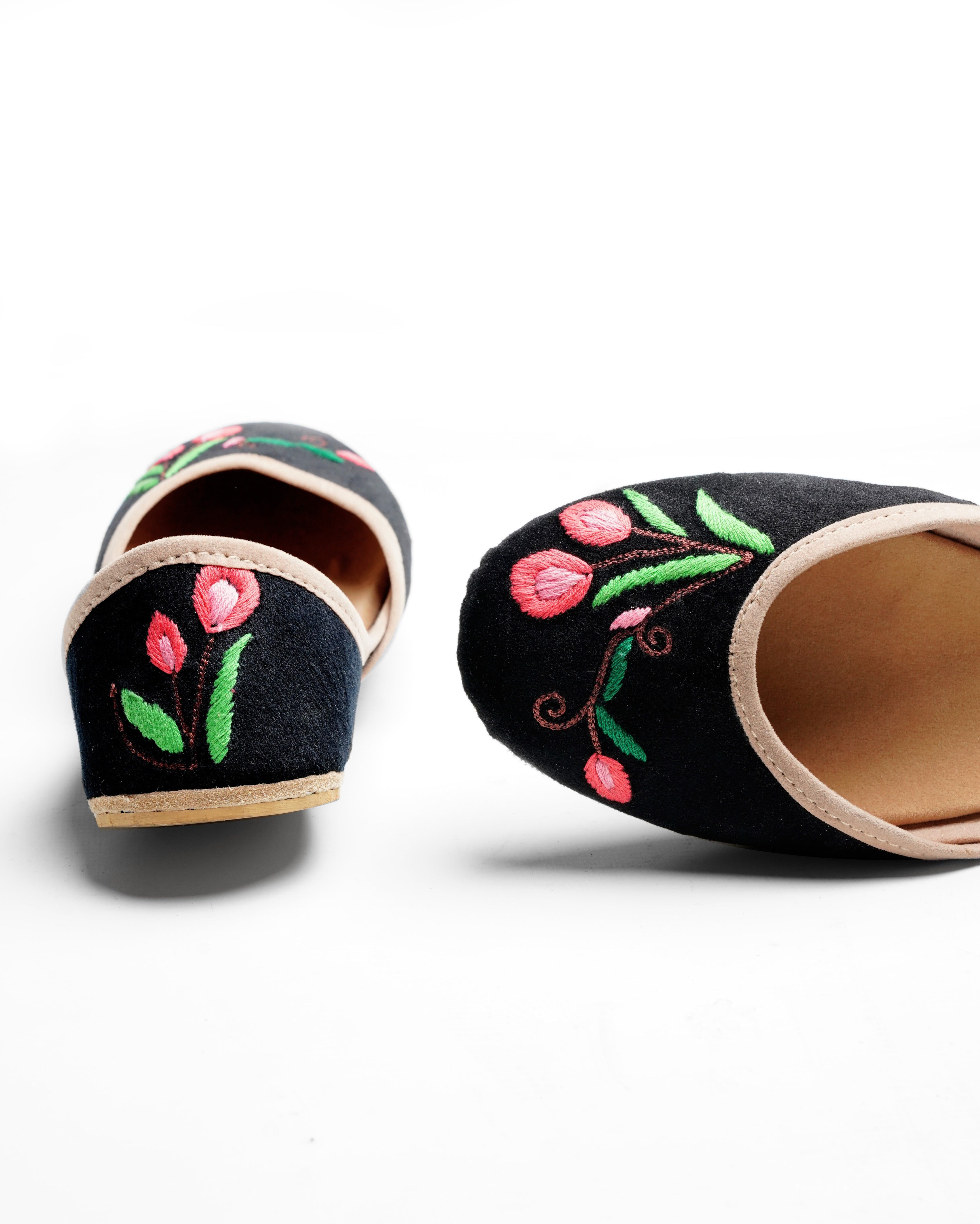 This gorgeous Khussa in black valvet is a true work of art that embodies the perfect blend of minimalism and festivity. The understated yet elegant design features delicate floral embroidery on both the front and back of the shoe. The embroidery is precise and refined, with every stitch contributing to the overall beauty and harmony of the design.