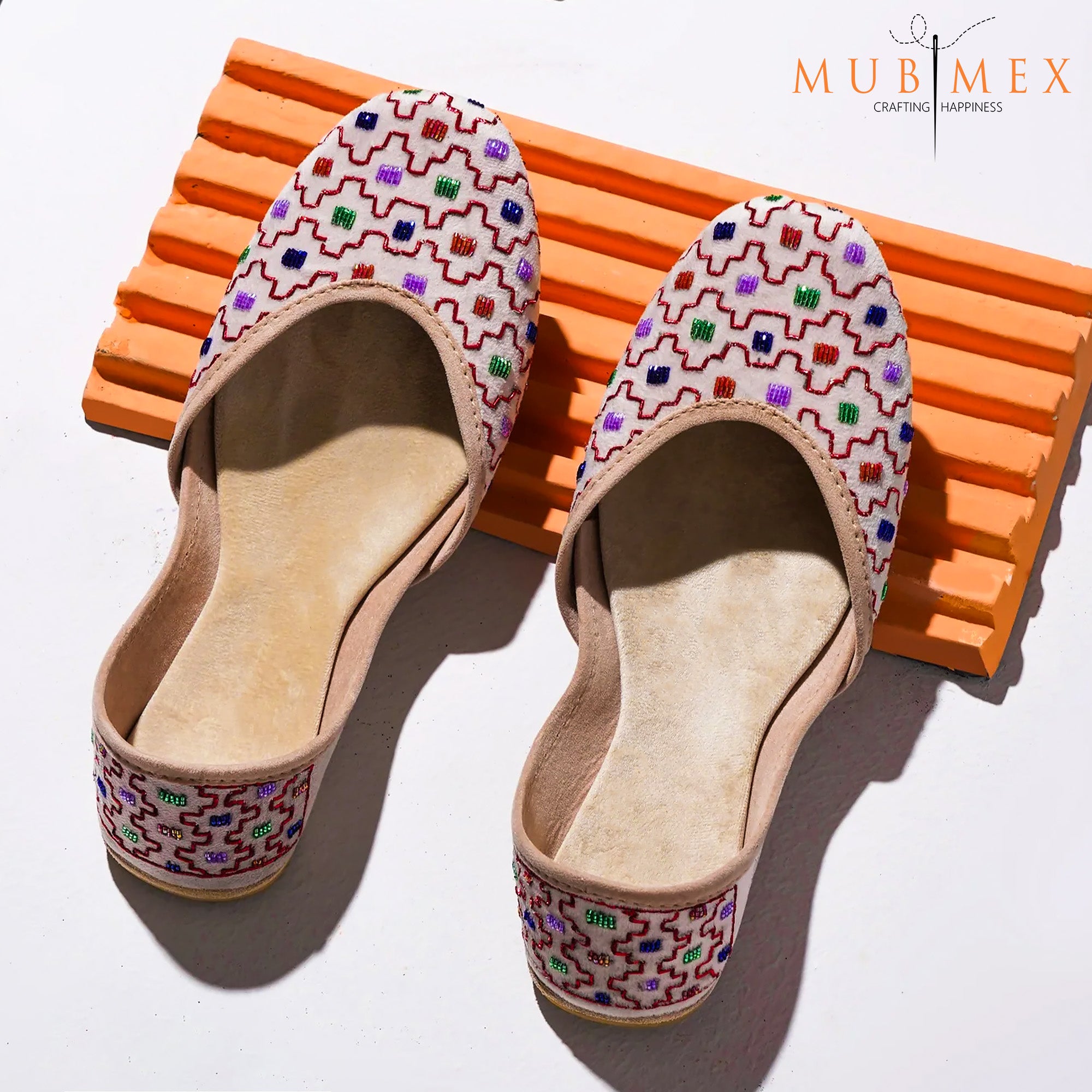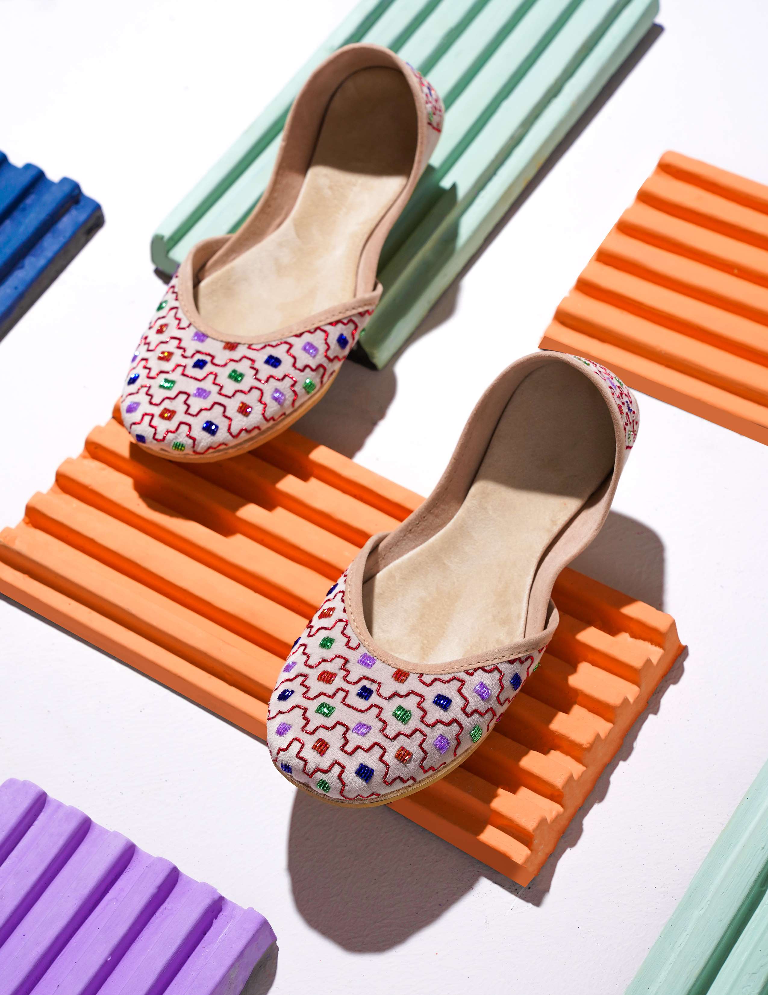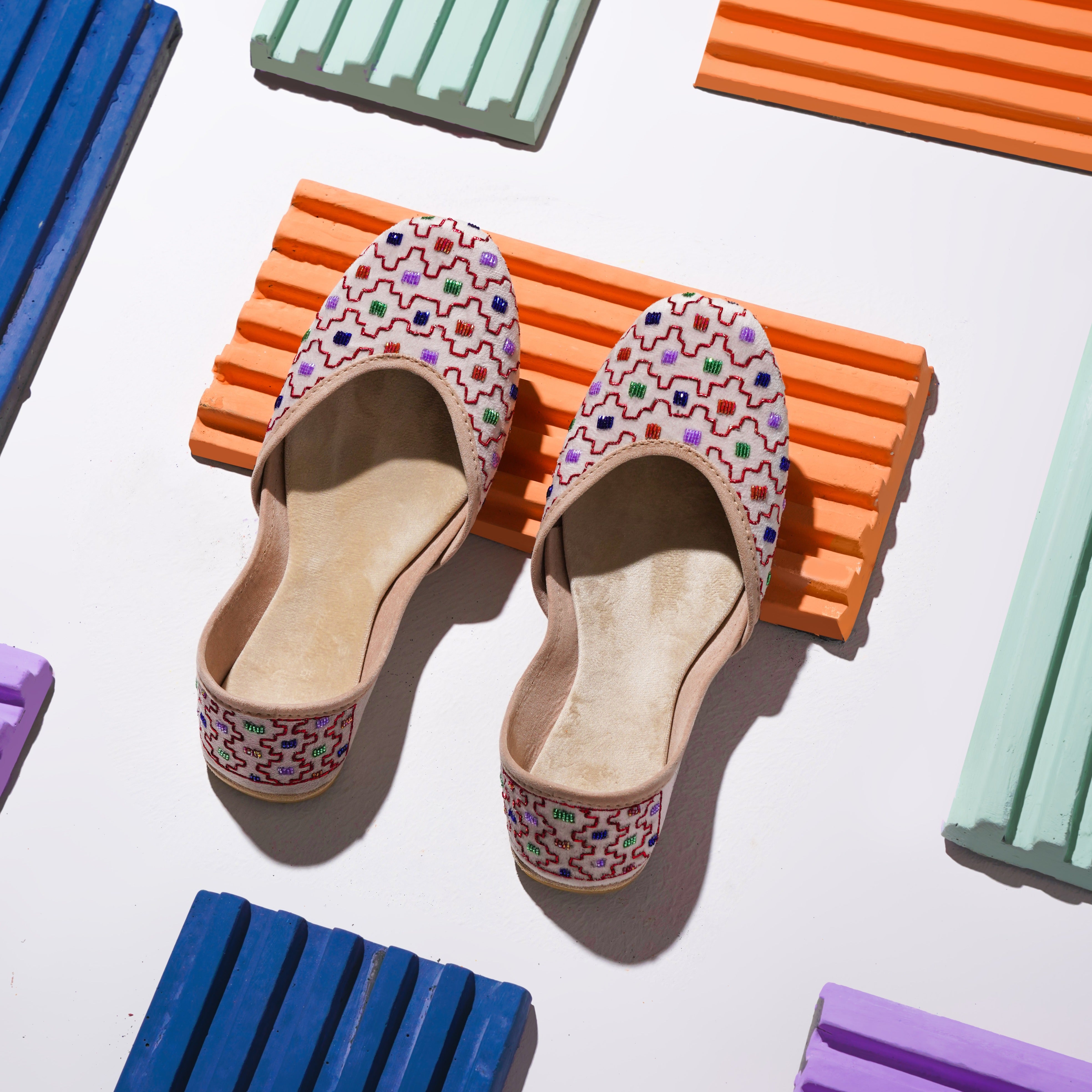 Off white velvet base with delicate handwork in a creeper pattern, accents colored abstracted pattern work. Minimalistic ornamentation makes a statement with a chic base and amusing blooming garden pattern. Truly, a perfect summer essential pair to carry this season. Created by skilled artisans with a passion for excellence, Zardozi is a testament to the time-honored art of traditional shoemaking. From the painstaking selection of the finest materials to the intricate hand-sewing of beautiful designs, Zardozi a true work of art that will elevate any outfit.
