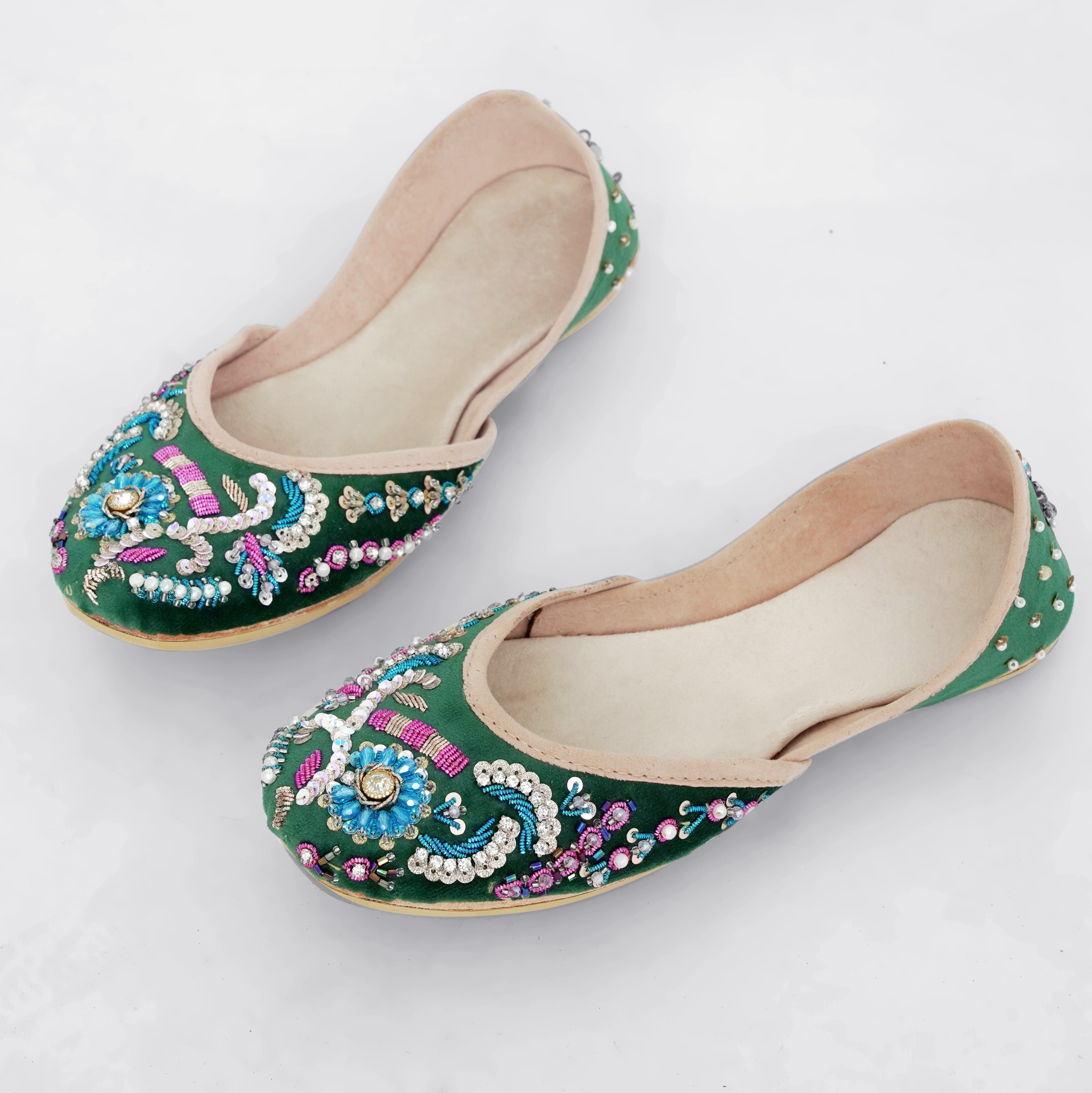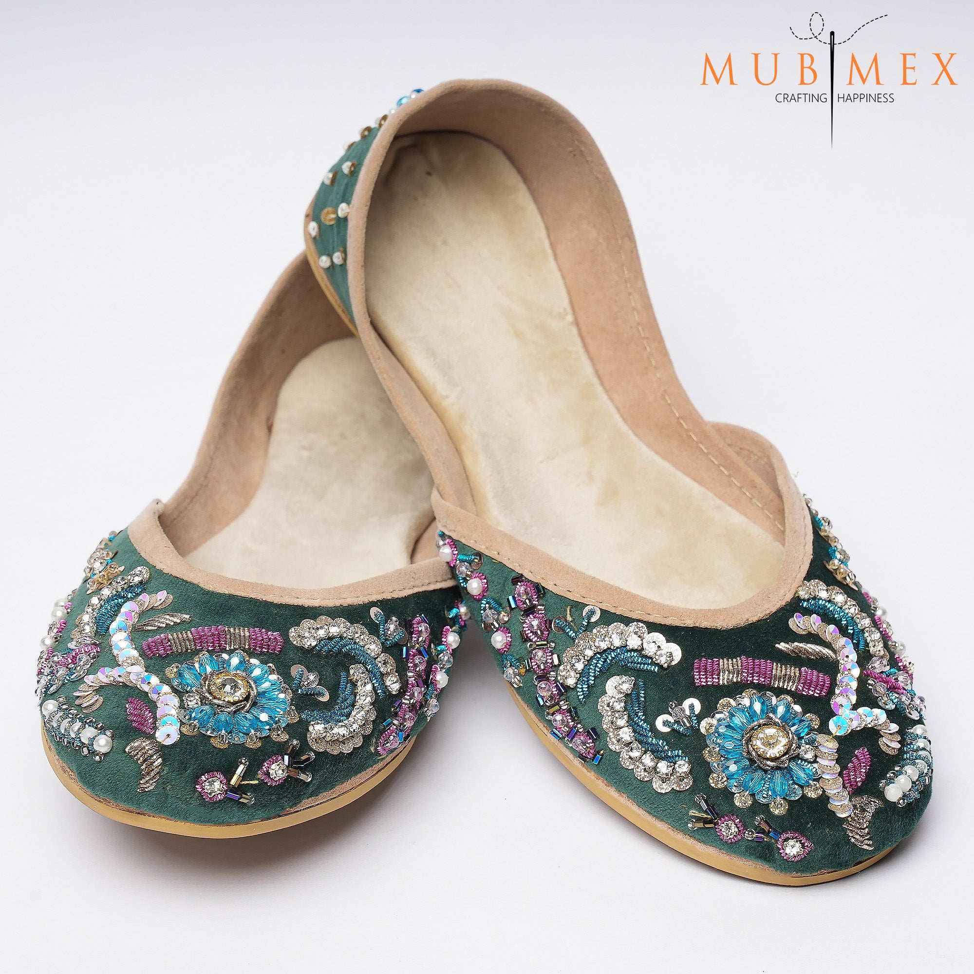 Heer is a fresh forest green Khussa embellished with beaded sequins work all over it. Floral vines in the front of the Khussa are adding to the forest vibe with bead and sequins work along with stones. White, blue and pink colors perfectly compliment the forest green velvet base. Our team of Craftsmen spent over 40 hours designing and crafting this piece for you to enjoy.