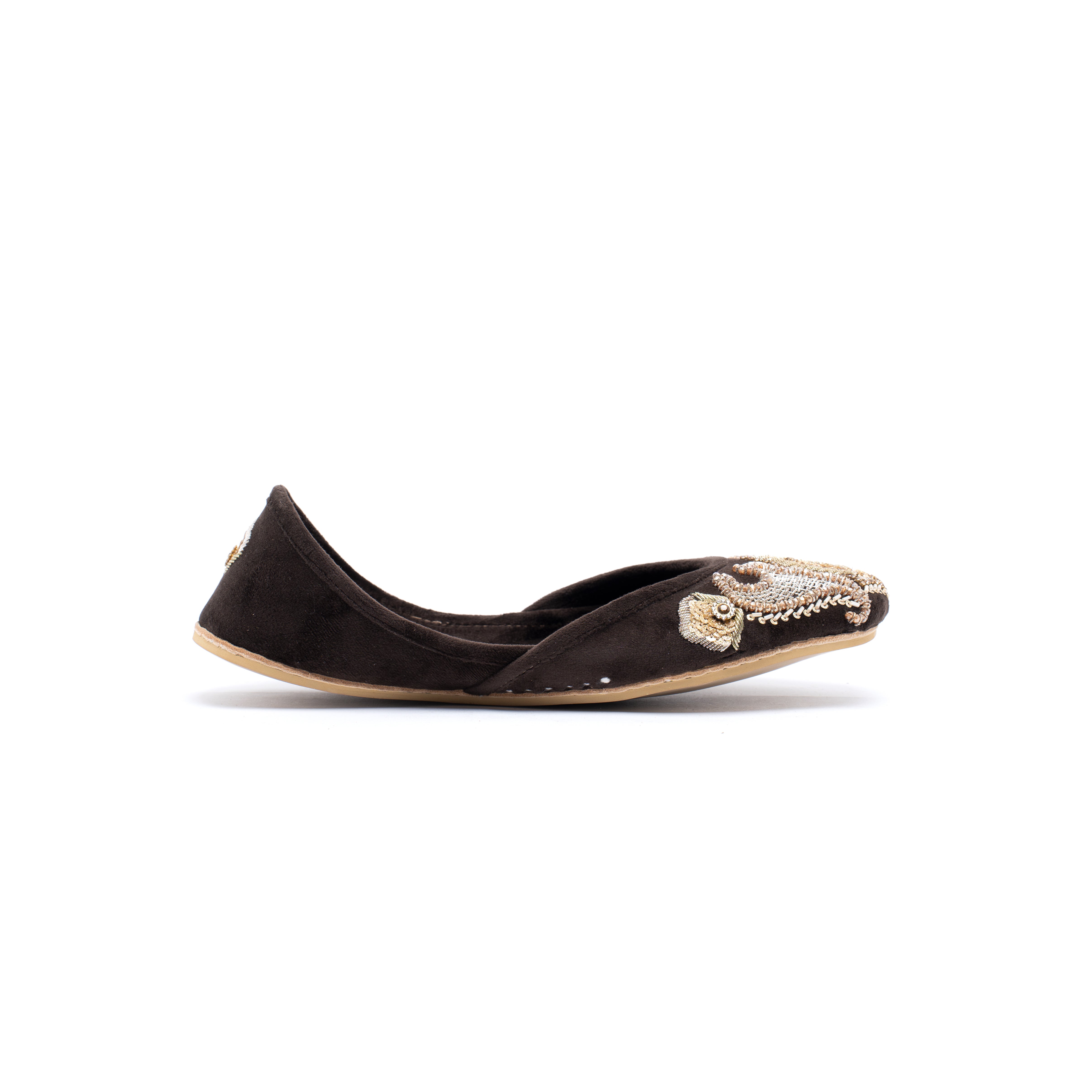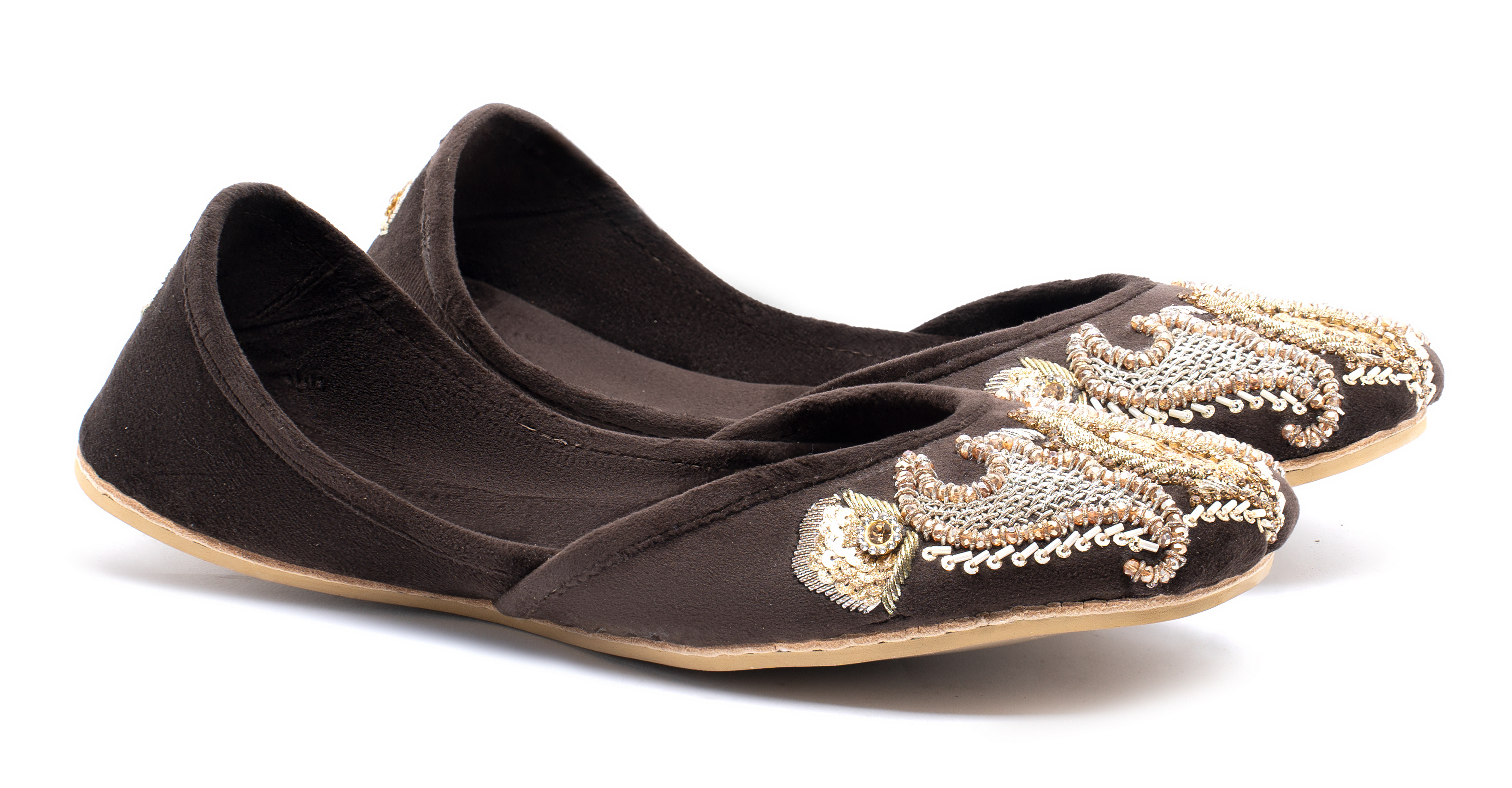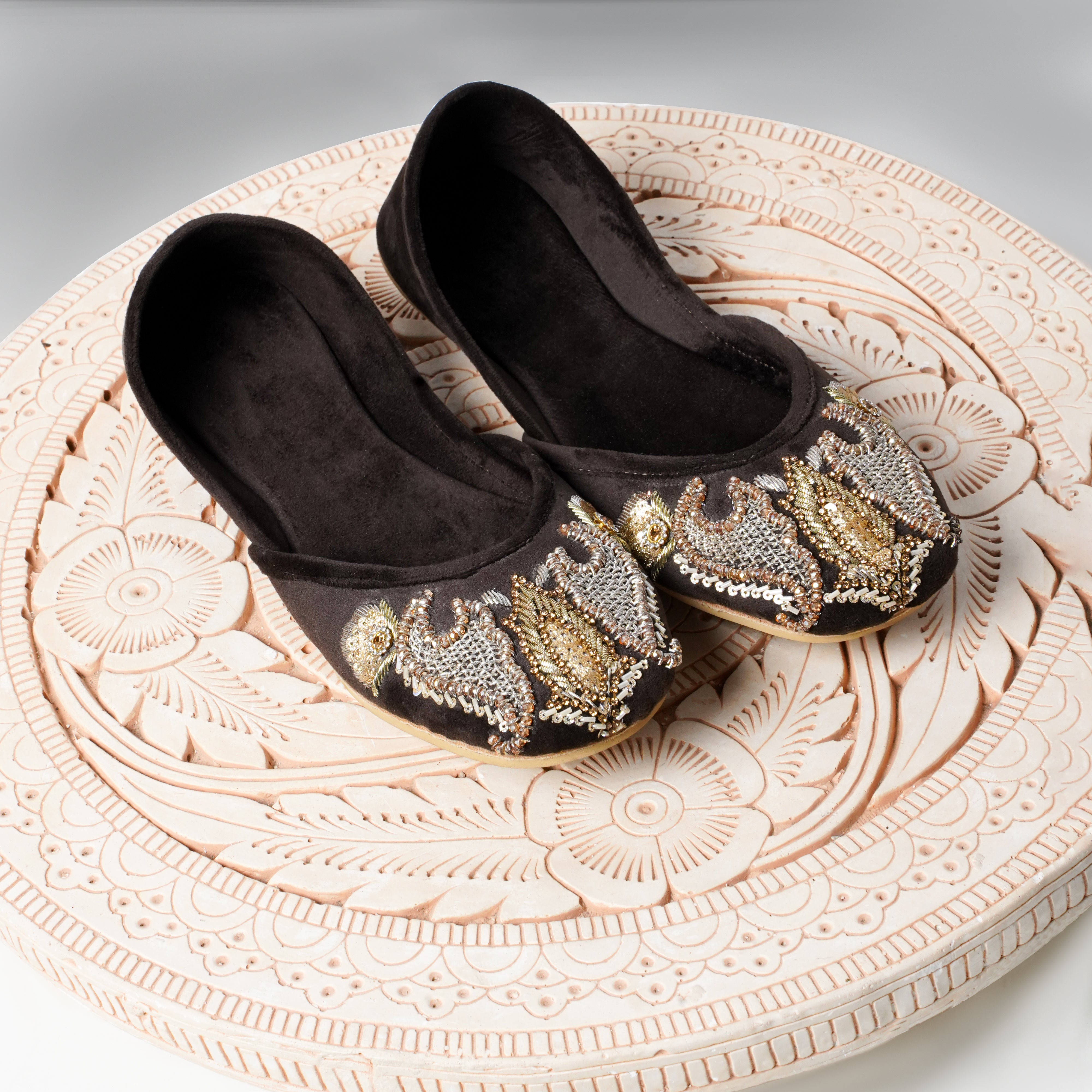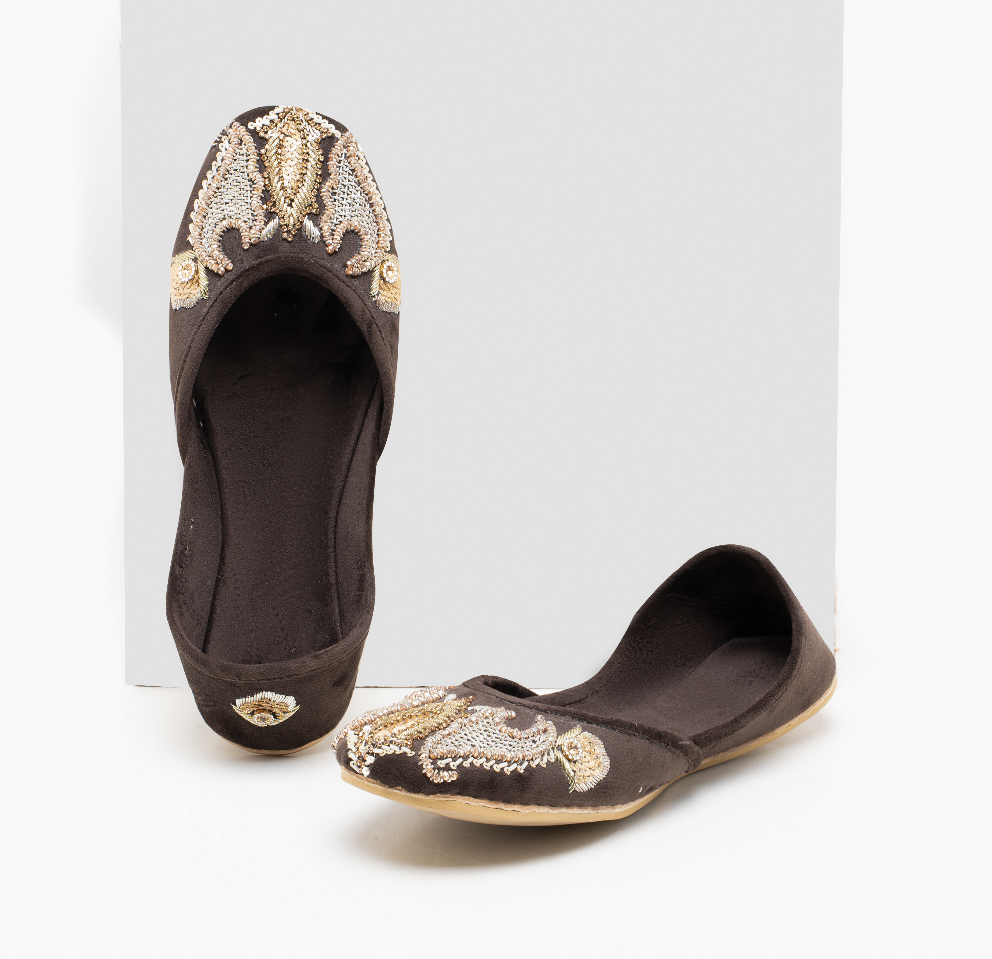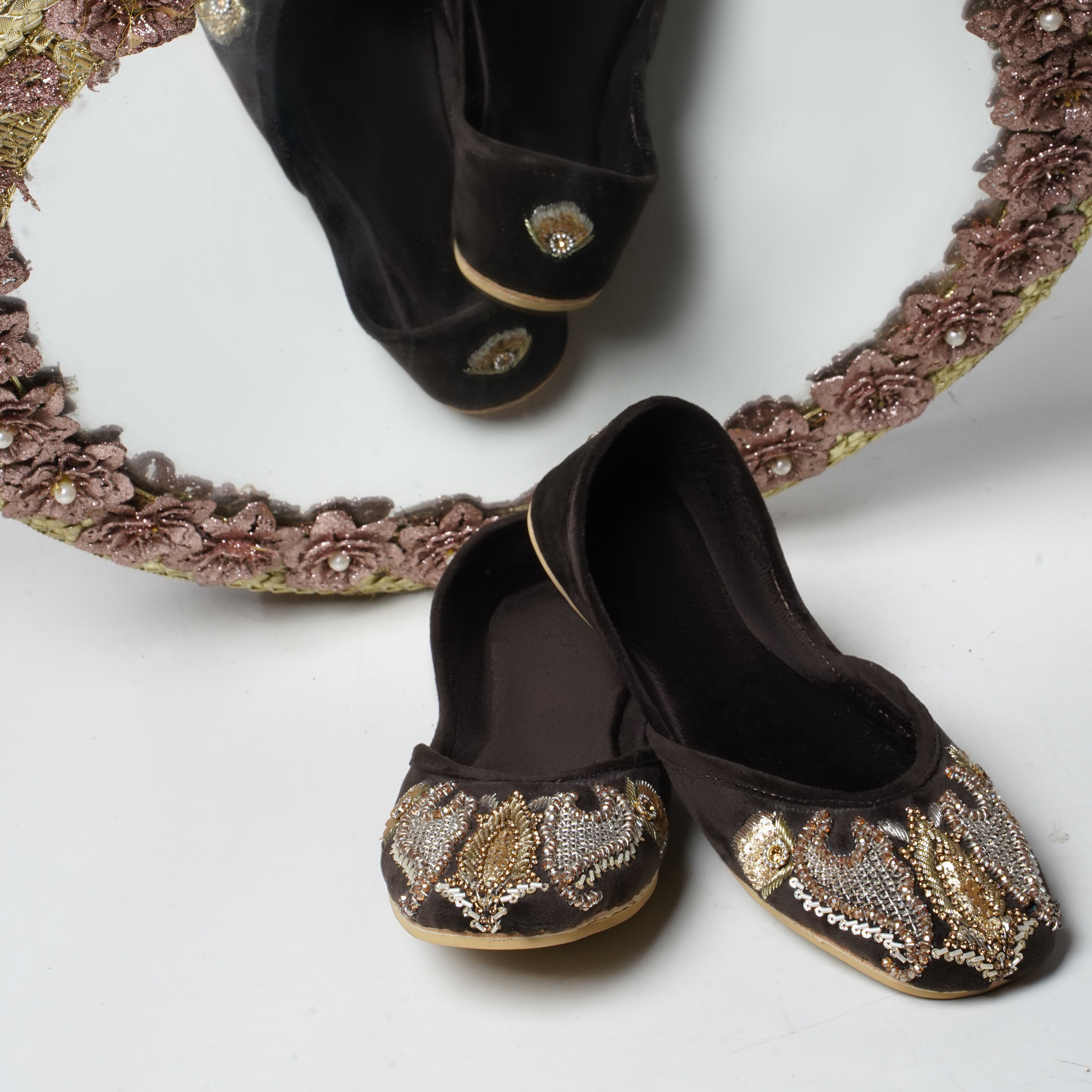 Sultanat Is a one of a kind Khussa consisting of dark brown velvet base embellished in shades of golden and silver. Bright golden has been used to fill in the center motif with beads and sequins used in various shade of golden. Iridescent white beads has been used on the end of the motif to further glorify the gold hues used. Two side motifs have been embellished along with the center motif which consist of silver zari  work along with light golden glass beads. The silver zari work has been done in a weaving manner with horizontal and vertical lines of zari work has been weaved together.  Along with this silver zari work has been done to further enhance