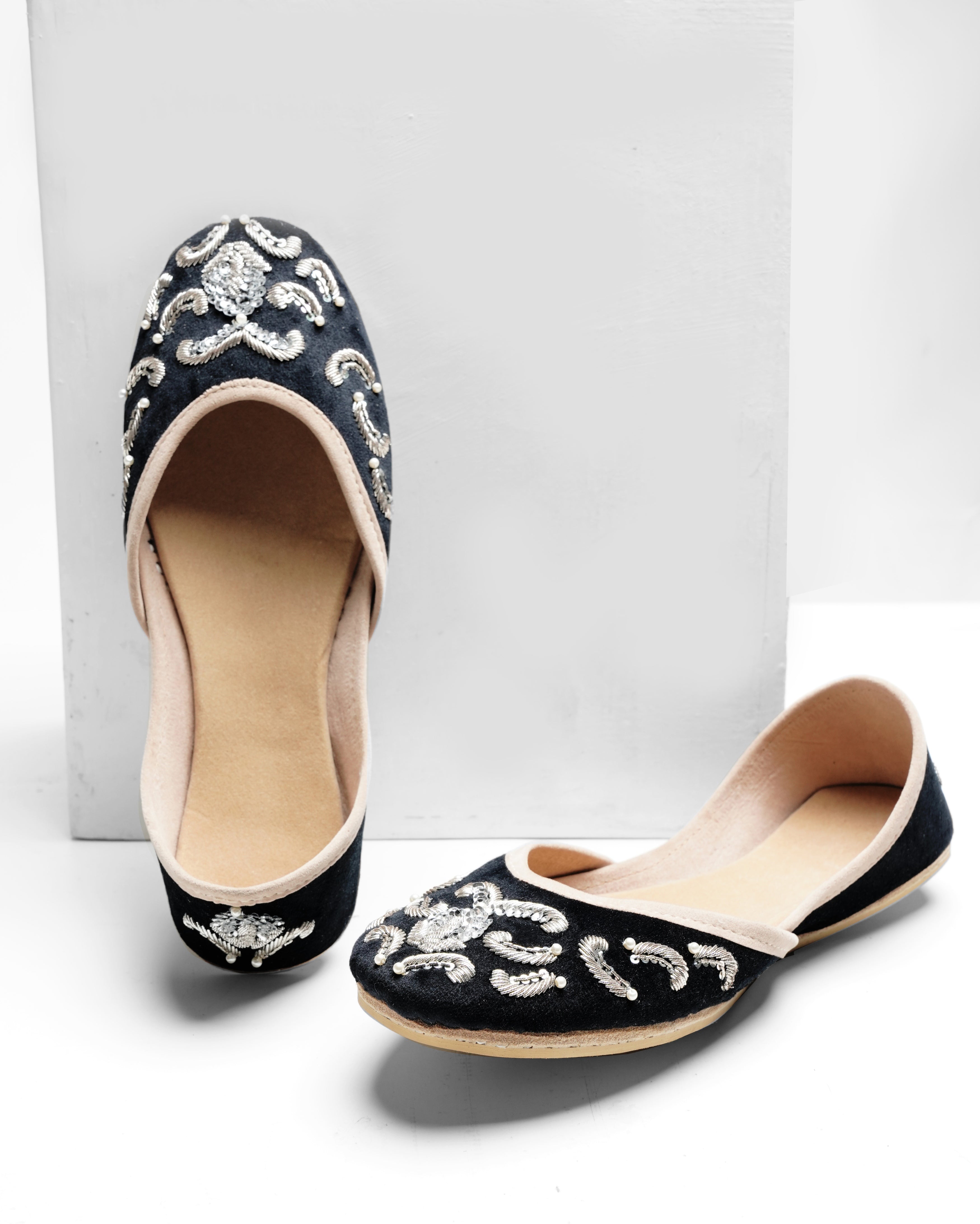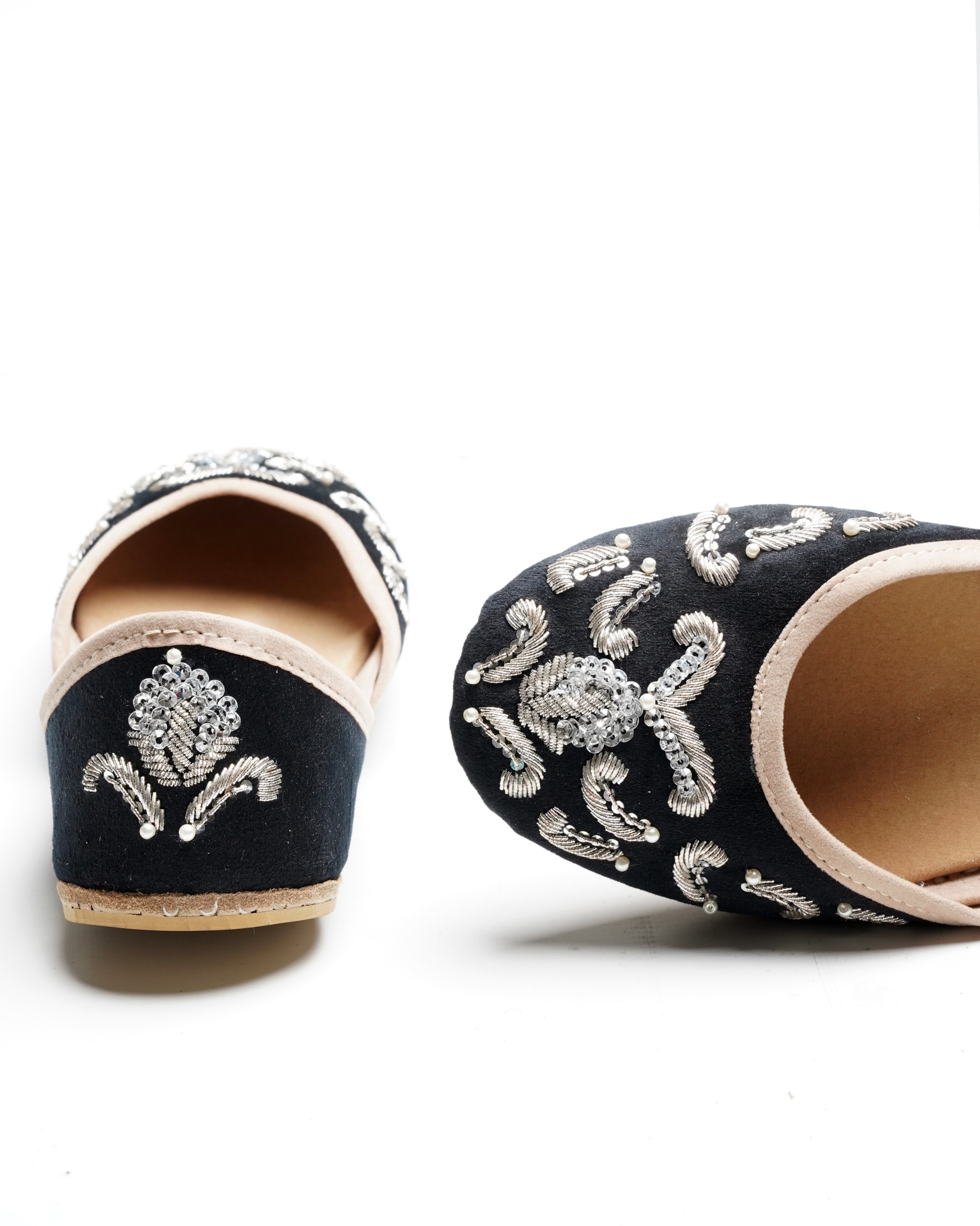 Chandni is a solid black Khussa that has embellishments in the front of the Khussa and one motif at the back. Chandni consists of bright silver dabka work along with silver sequins, white beads and linear silver beads.