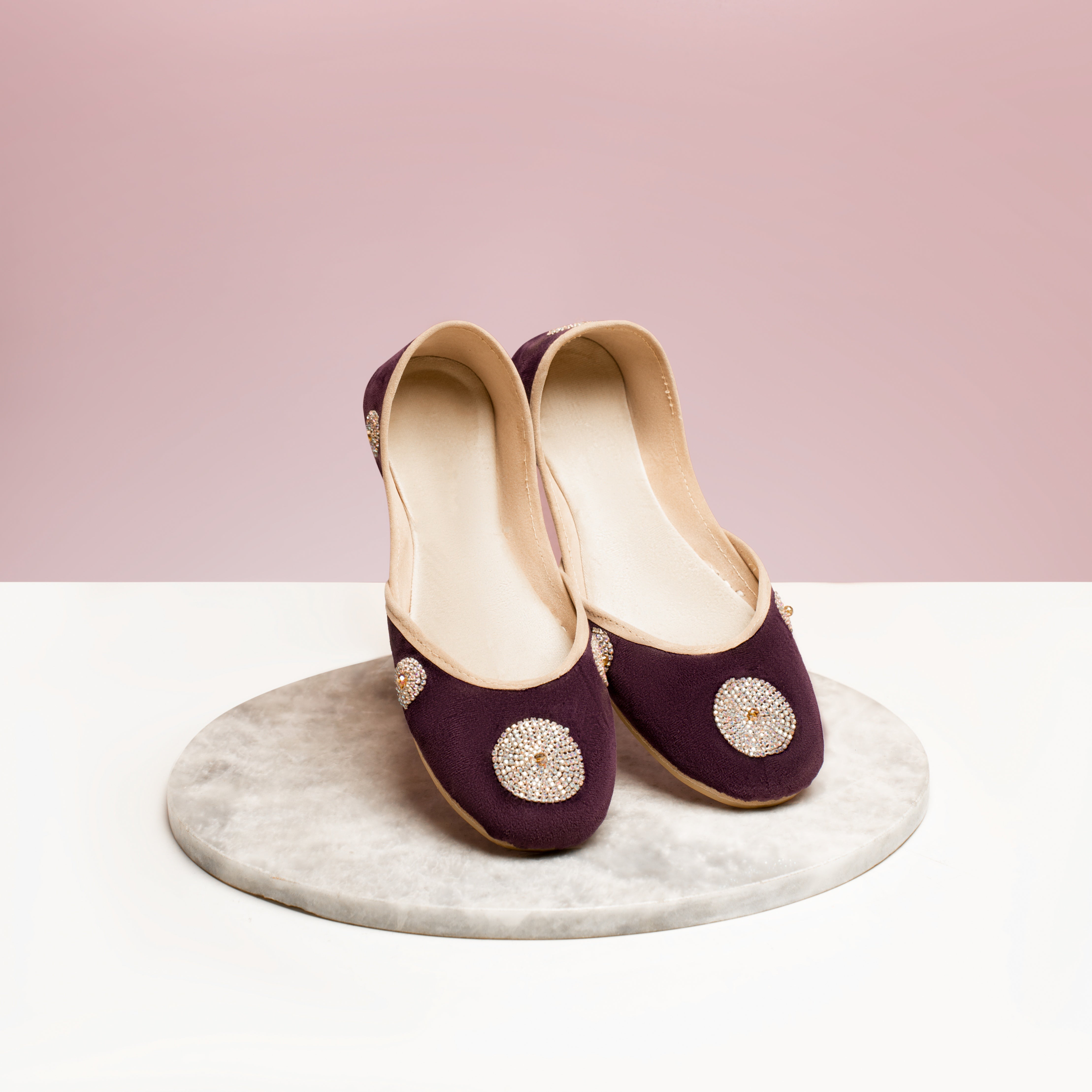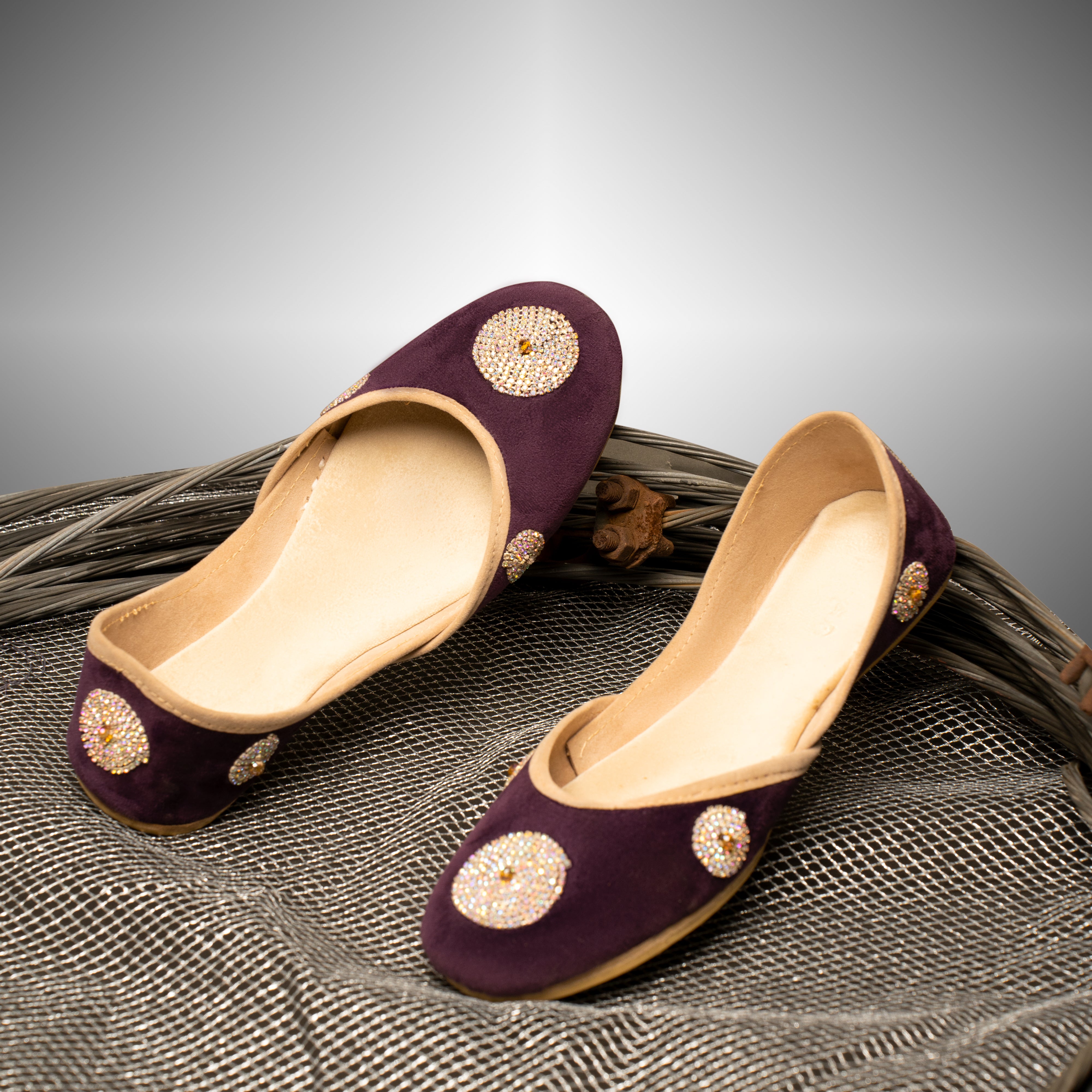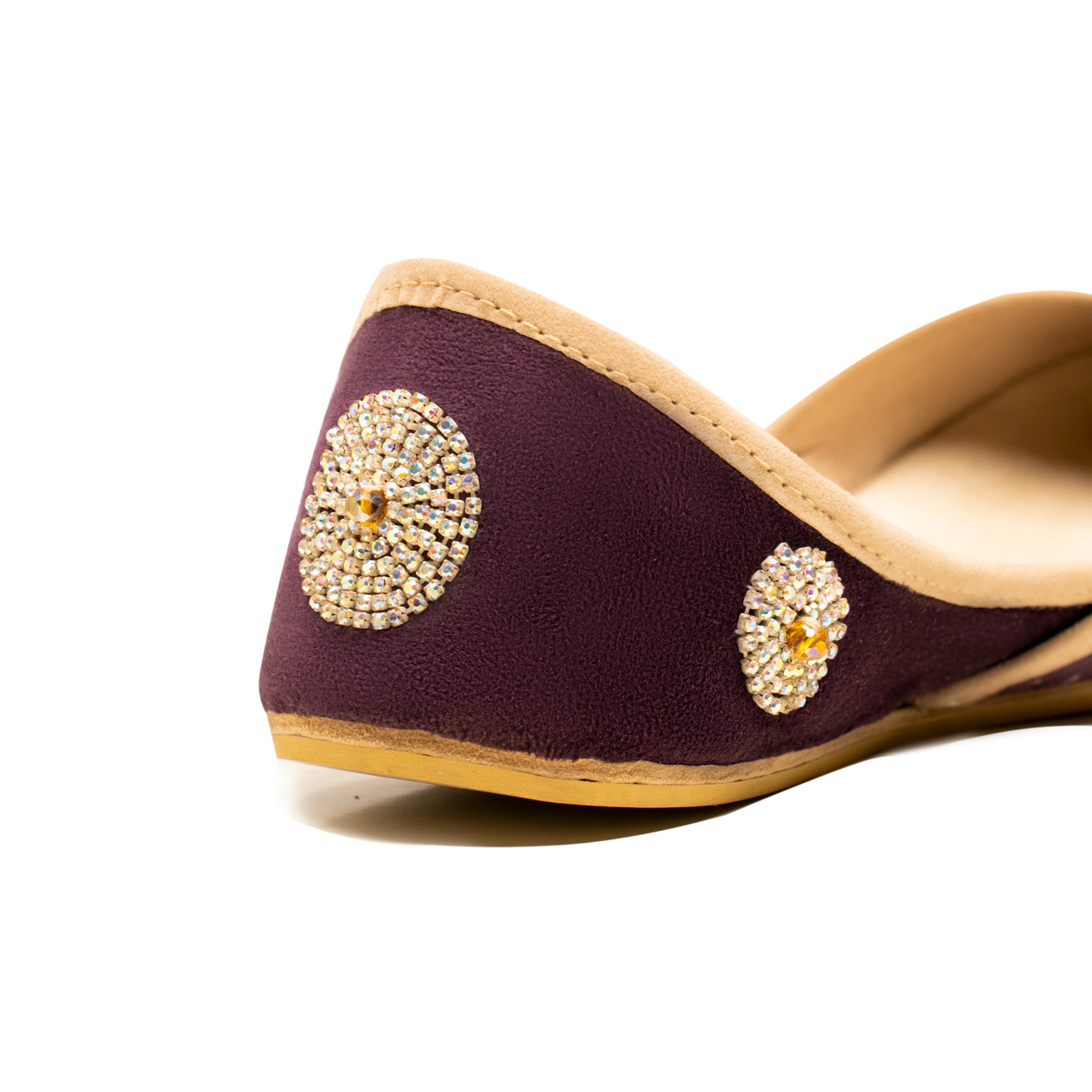 Introducing our exquisite Deep Burgundy Khussa adorned with meticulously hand-cut stones embellishment, a true masterpiece of craftsmanship and elegance.
