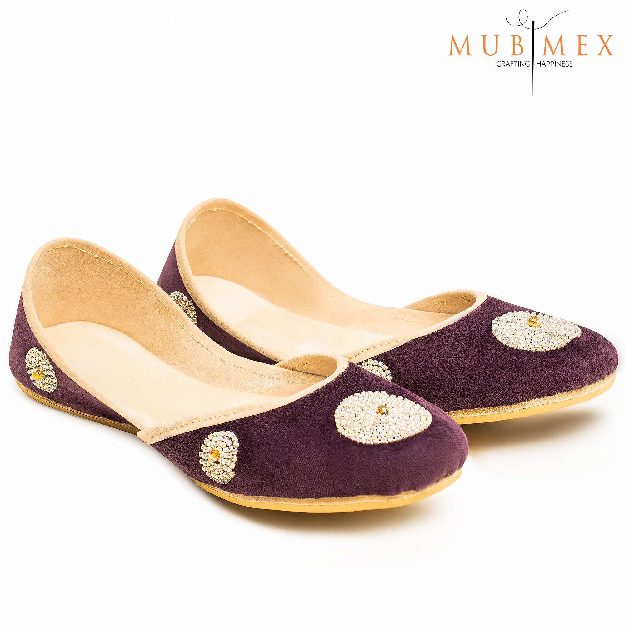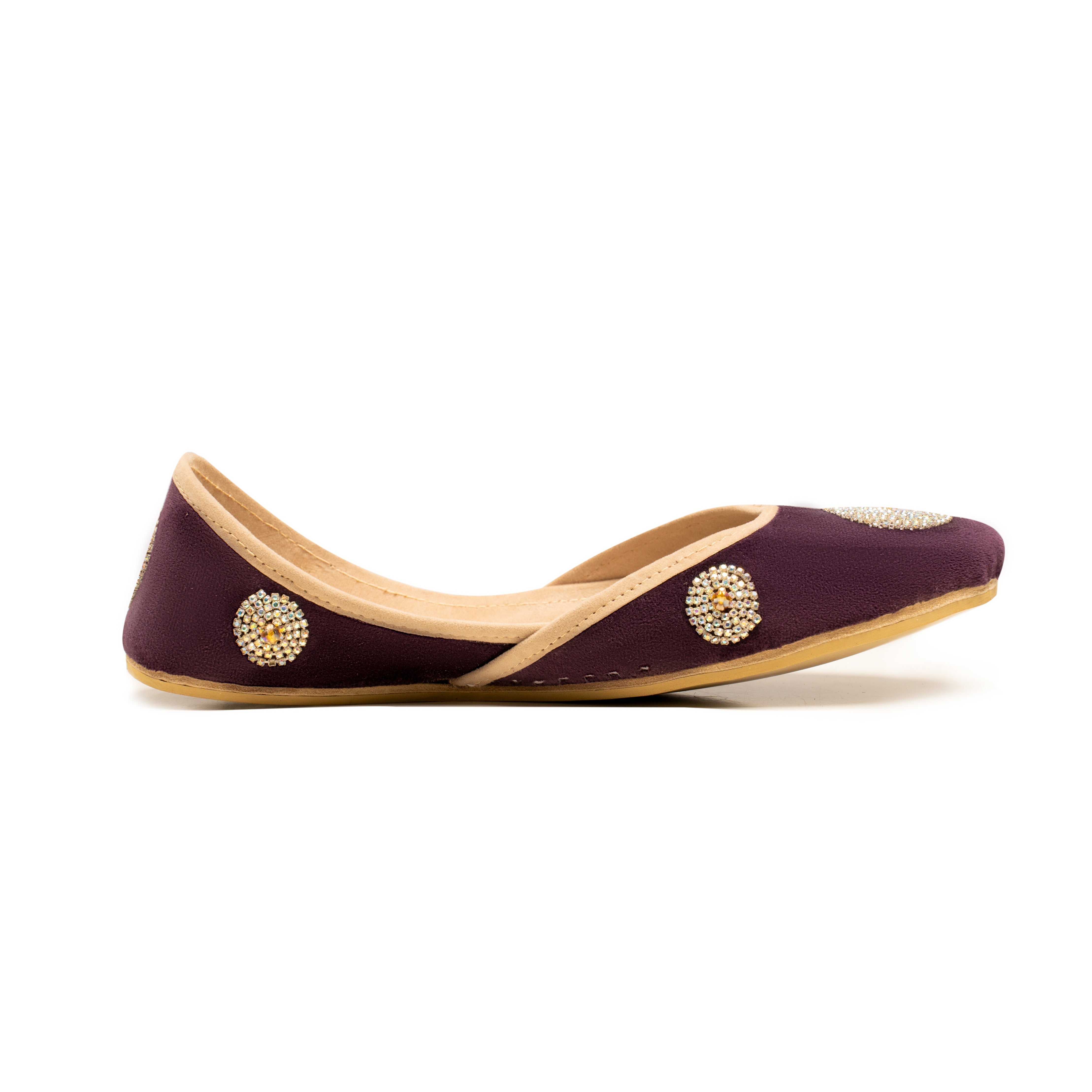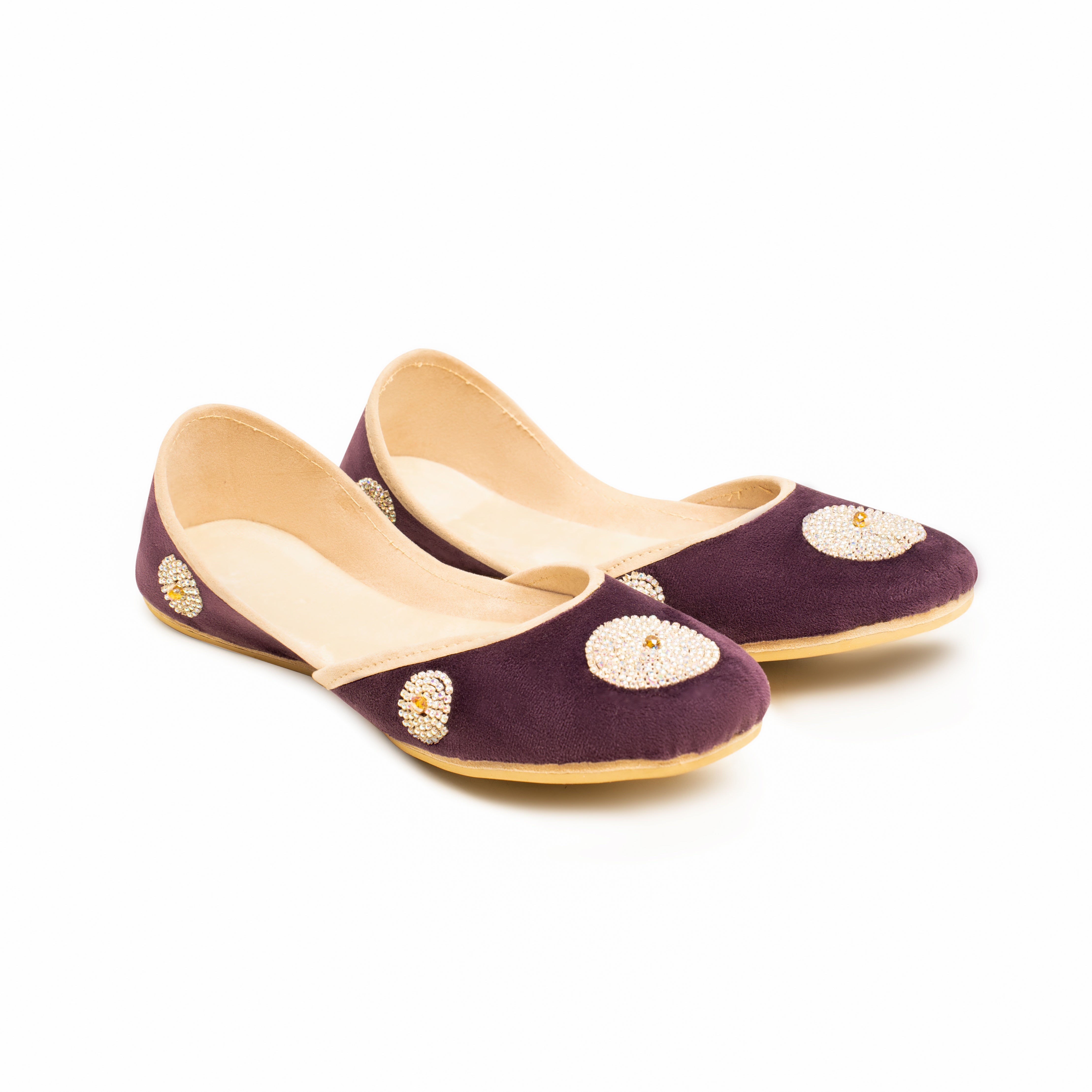 Introducing our exquisite Deep Burgundy Khussa adorned with meticulously hand-cut stones embellishment, a true masterpiece of craftsmanship and elegance.