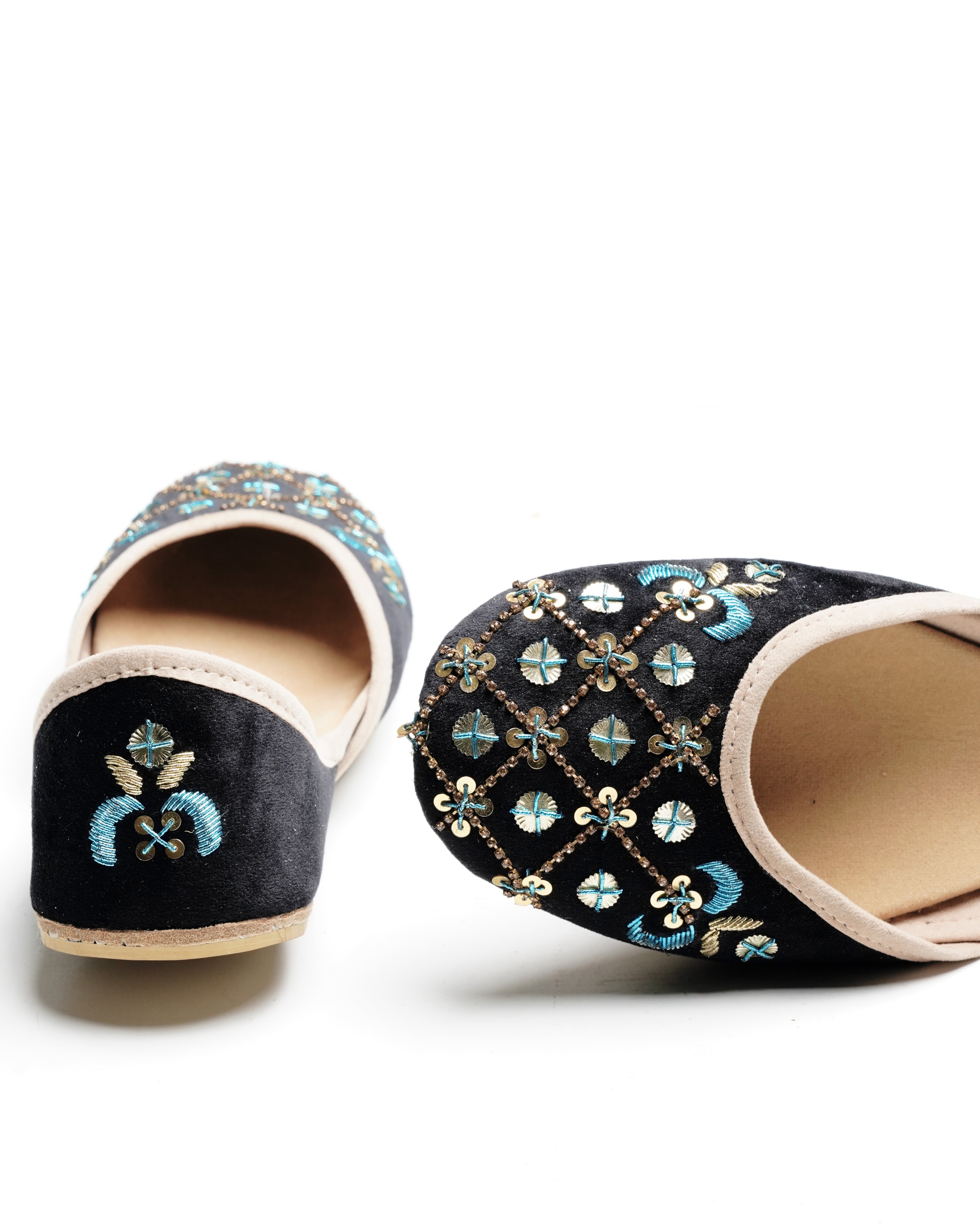 Didaar is a simple yet elegant black Khussa with symmetrical stone and sequins work in the front of the Khussa. Gold and ocean blue color has been used along with copper to add dimension along with dabka work in the floral designs.