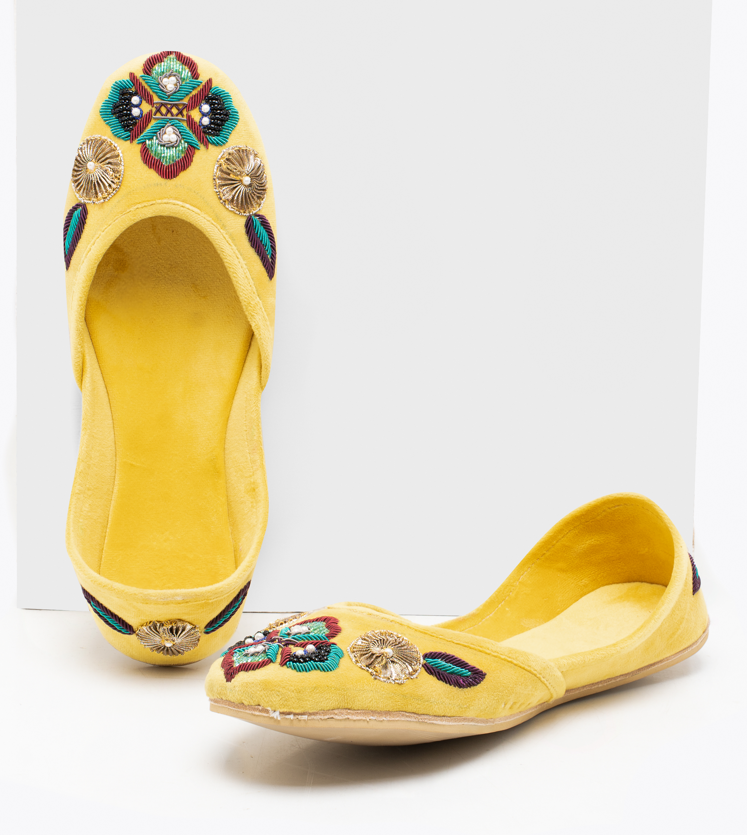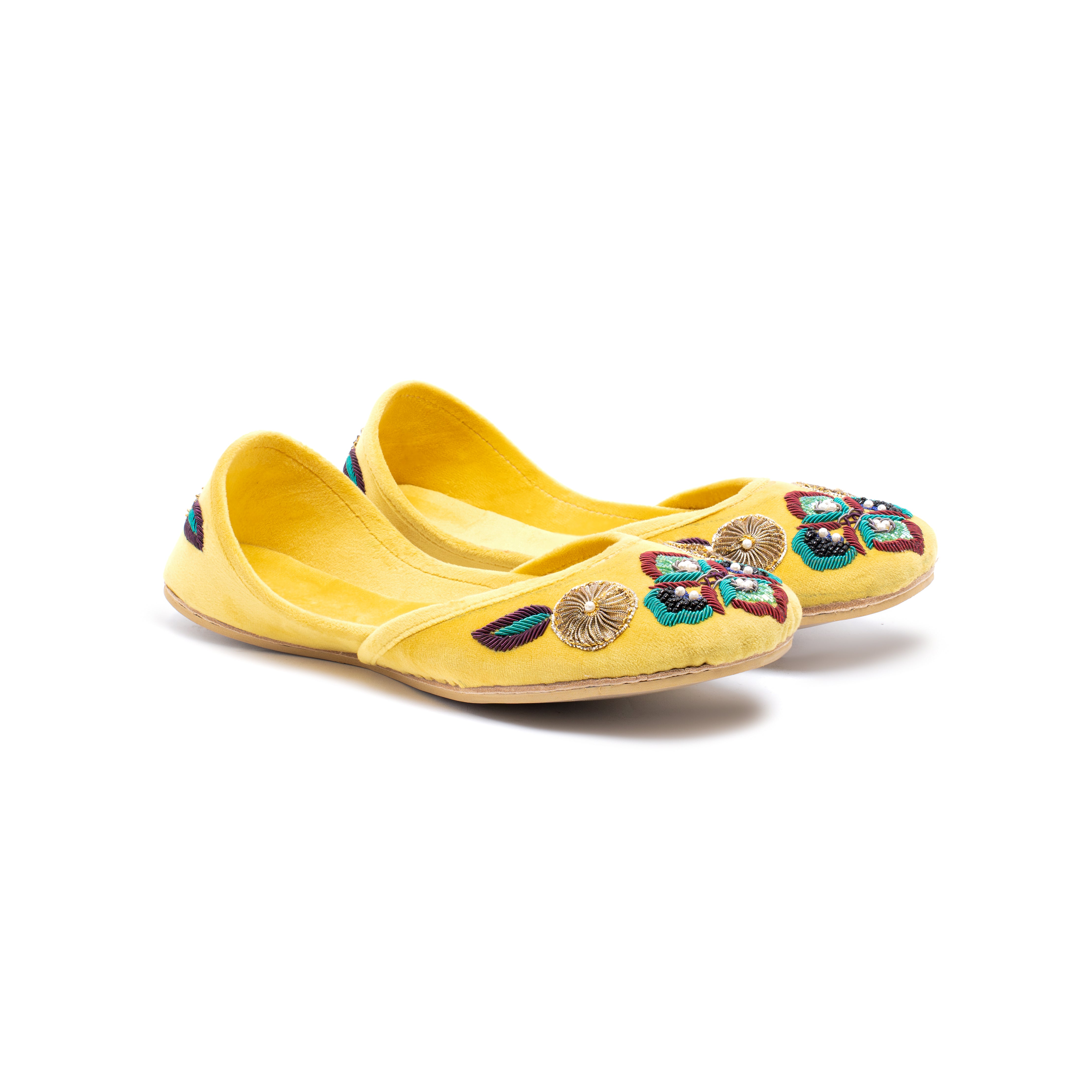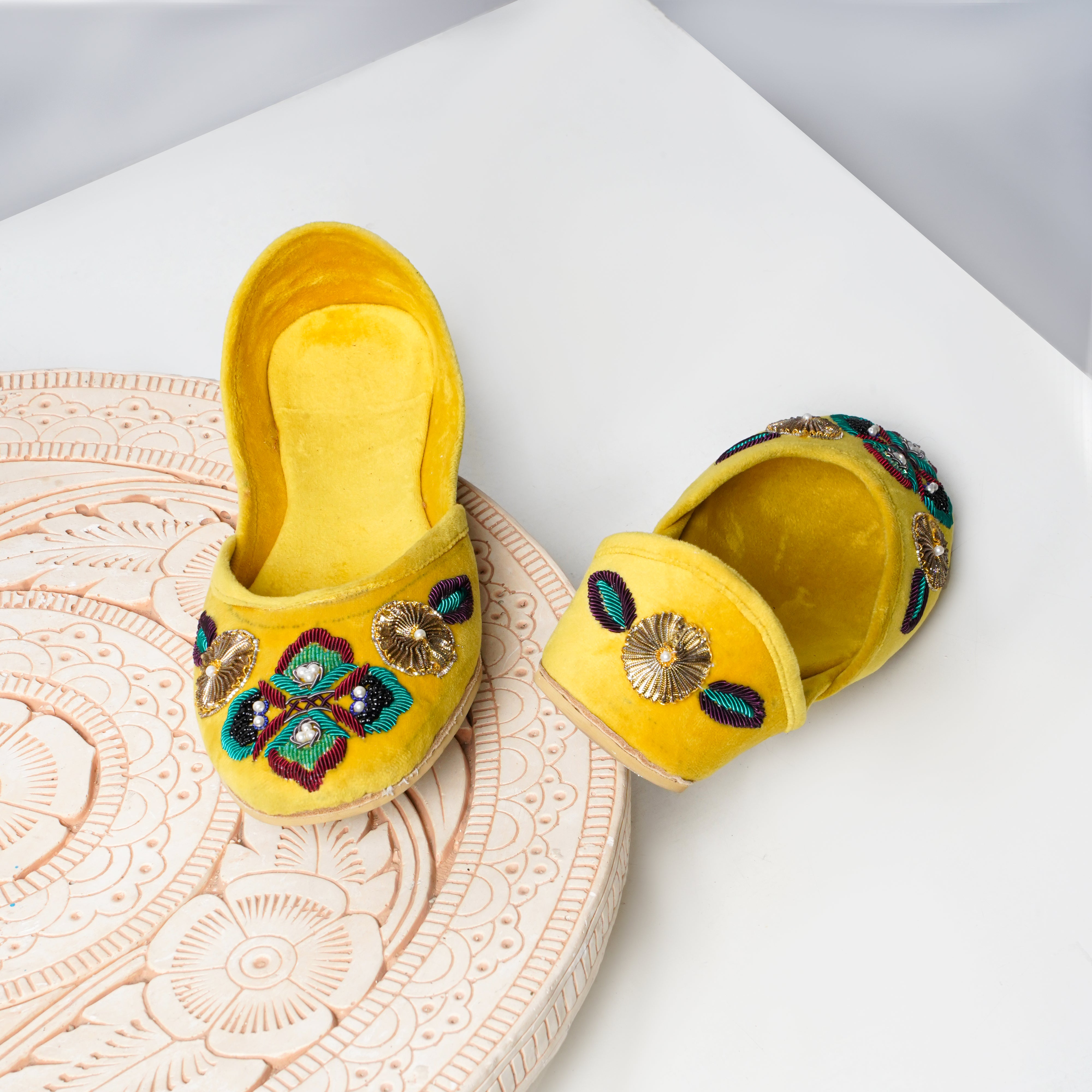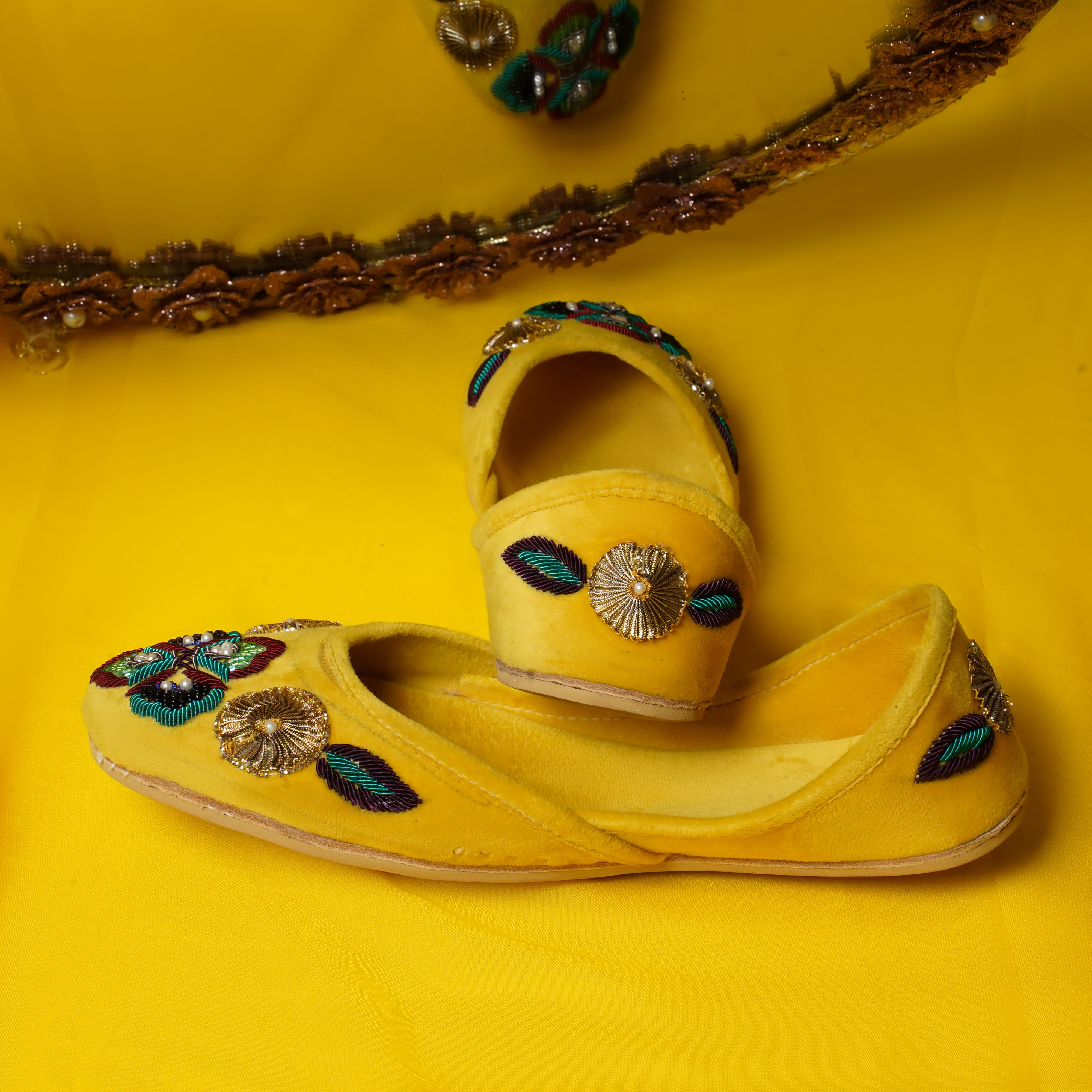 Gulistan is a vibrant Khussa consisting of a bright yellow velvet base embellished with a central clover design in the front of the Khussa. Zari work in teal, oxidised red and gold have been done to embellish the center along with black bead work and white pearl. Zari work on deep purple has been done on the complimenting leaf design along with golden gota work on the sides.