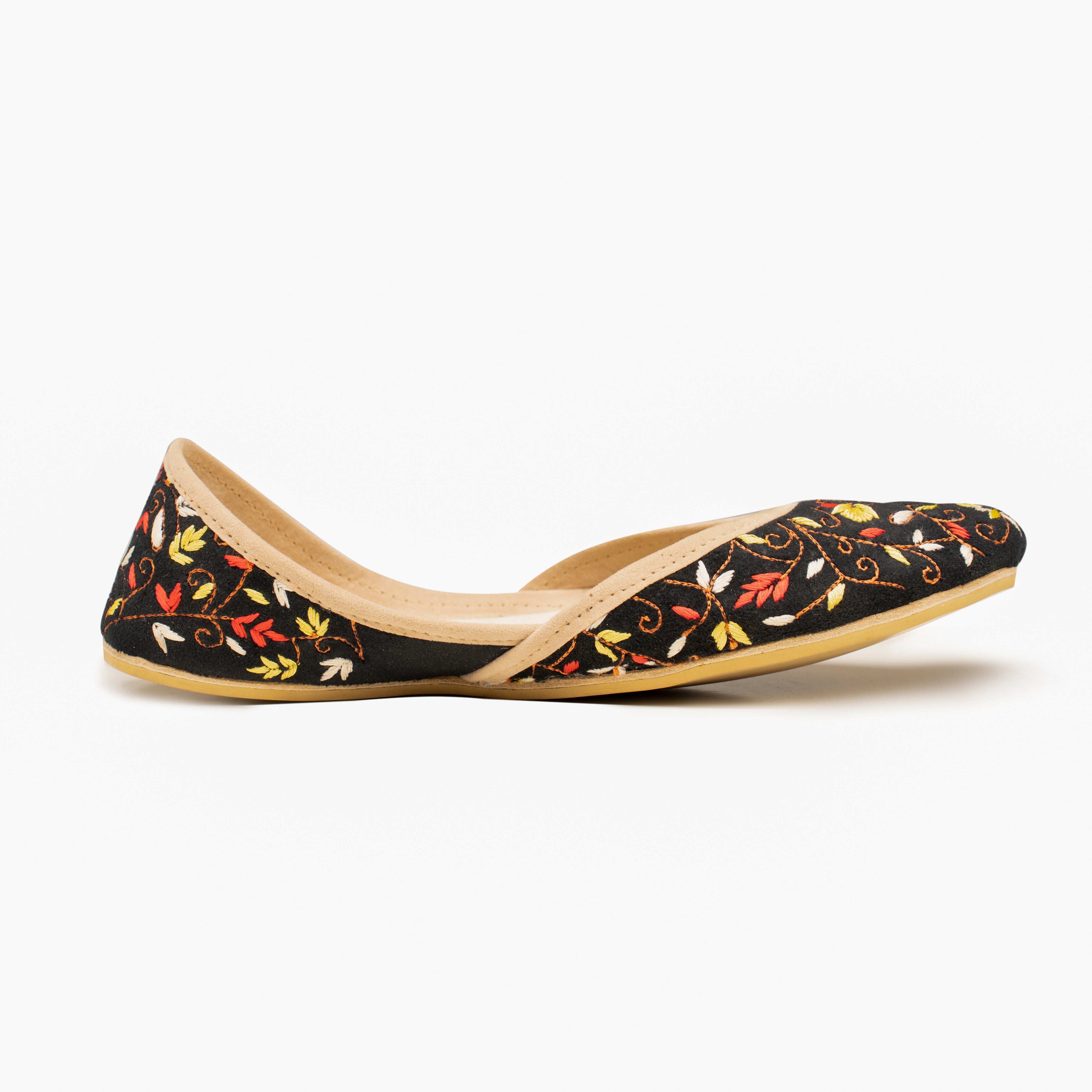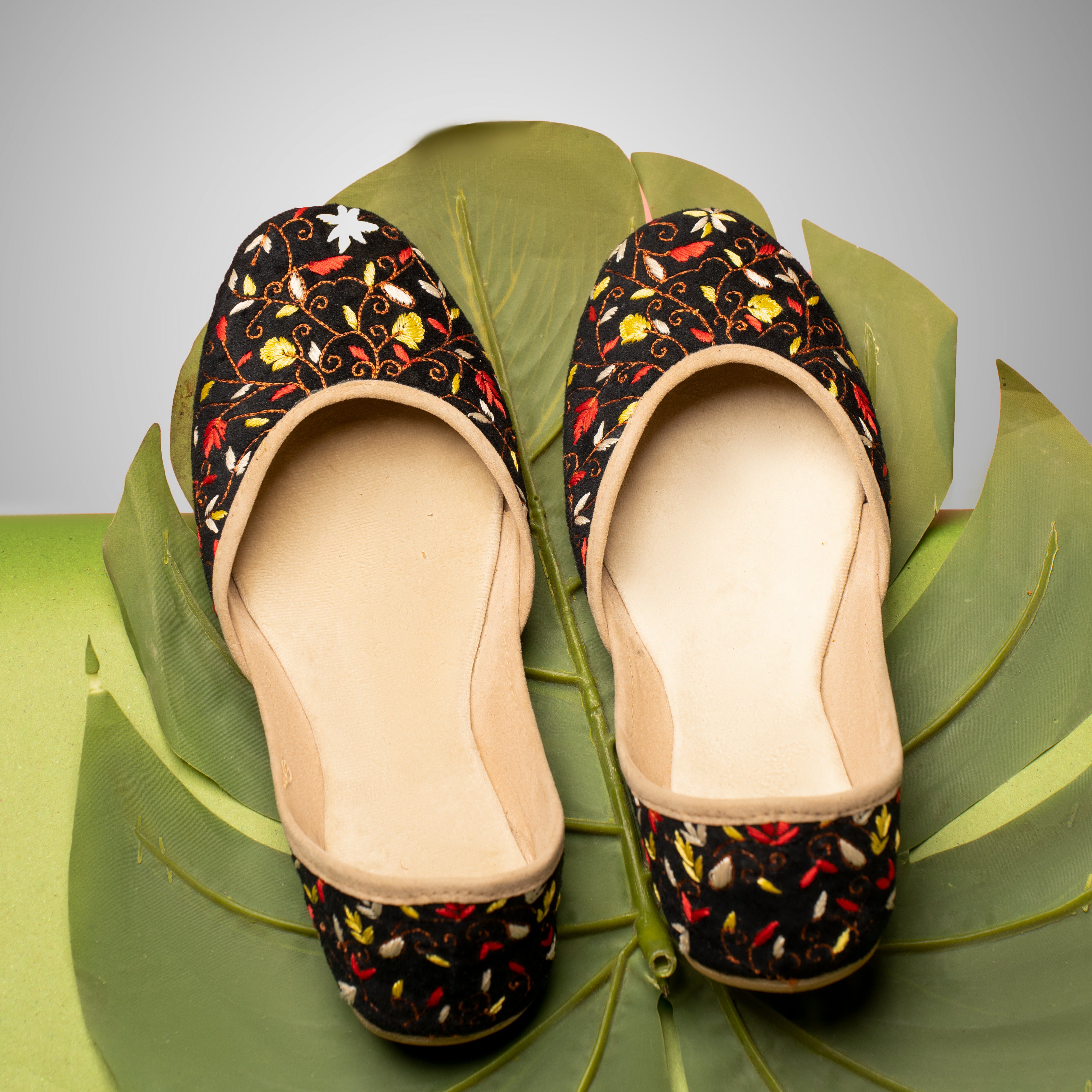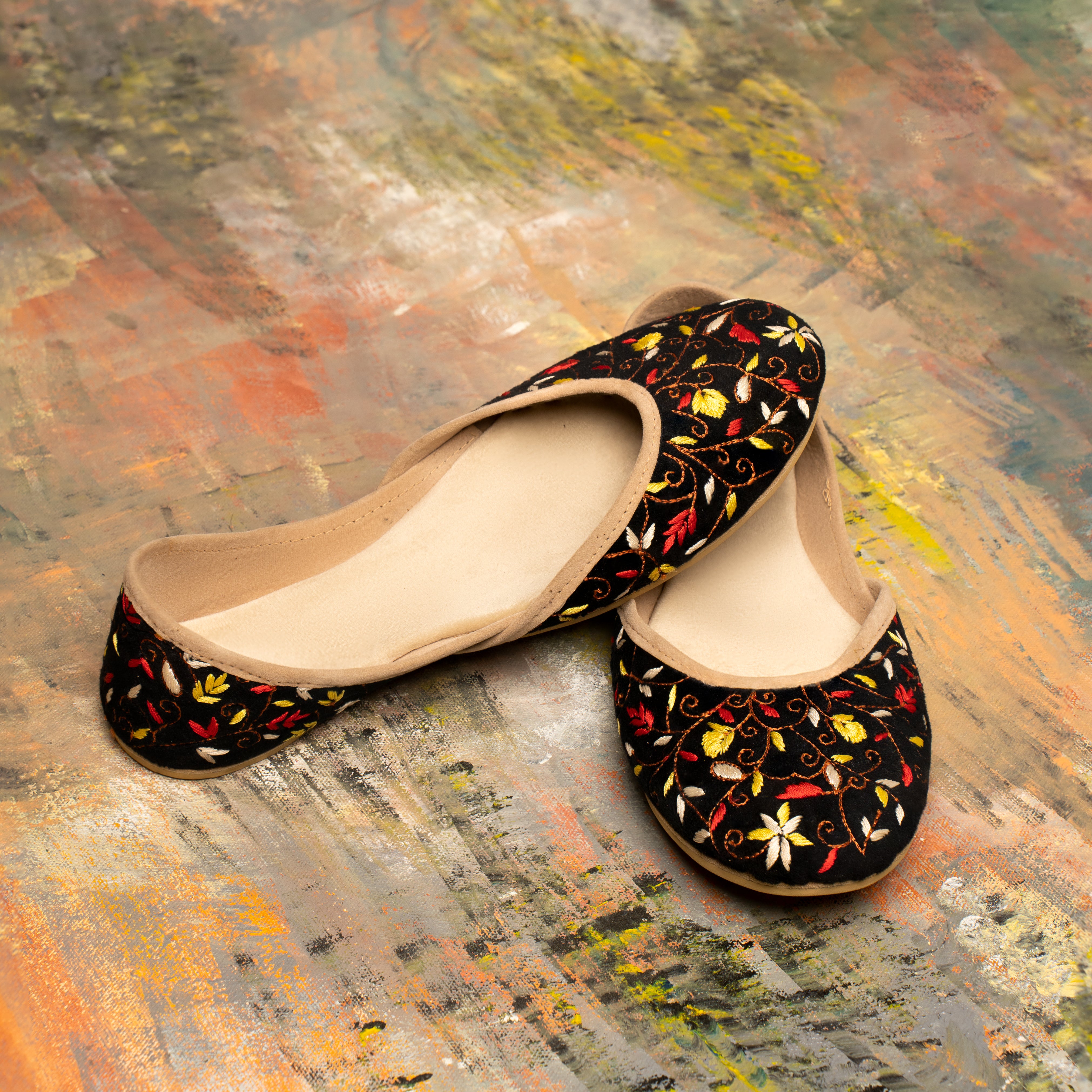 Delicate yet intricate embroidery of ‘phool’ crafted on a dark solid base, highlighted with orange and yellow embroidered leaves is treasure that’s a must have for your wardrobe! Inspired by the beautiful Kashmiri handicraft of 'Pashmina' our Khussa is an ode to the union of two of India's most treasured crafts- Jamadar and Jutti making. This pair promises to leave you and everyone around in an awe because of its elegant beauty that shines through a delicate design of leaves twined spreading across the khussa.