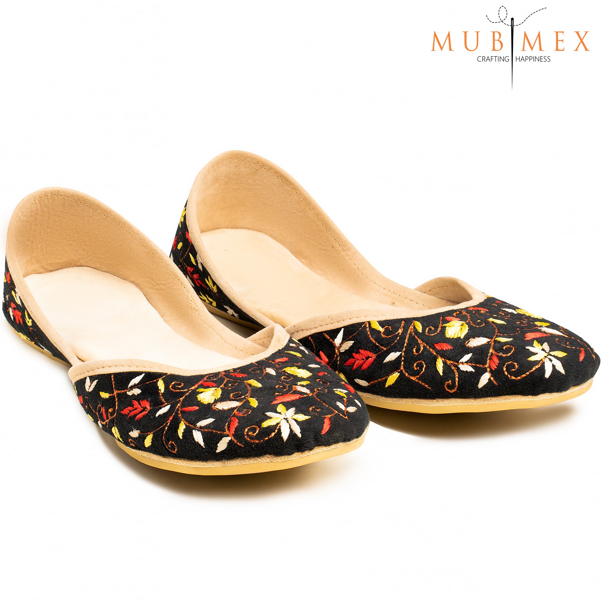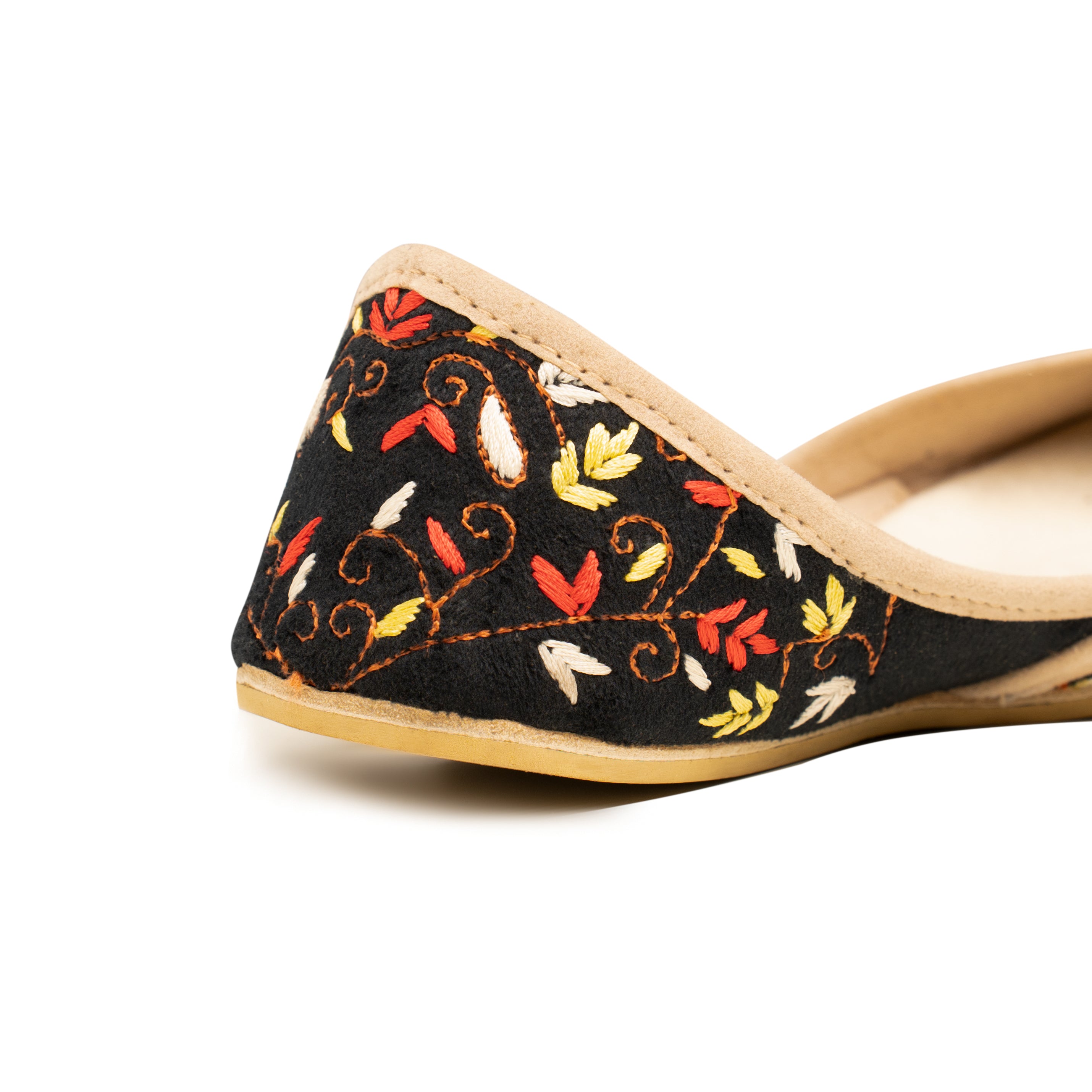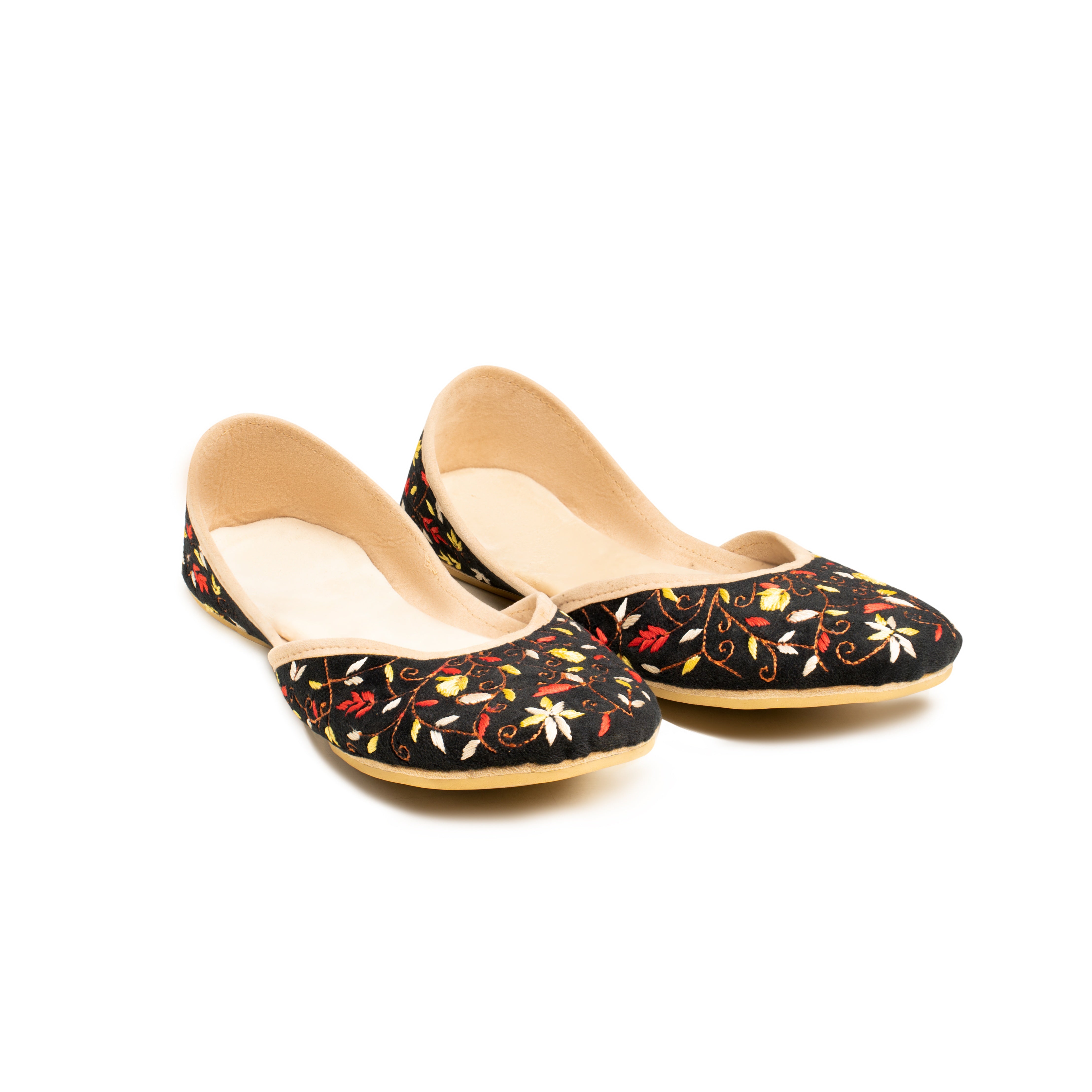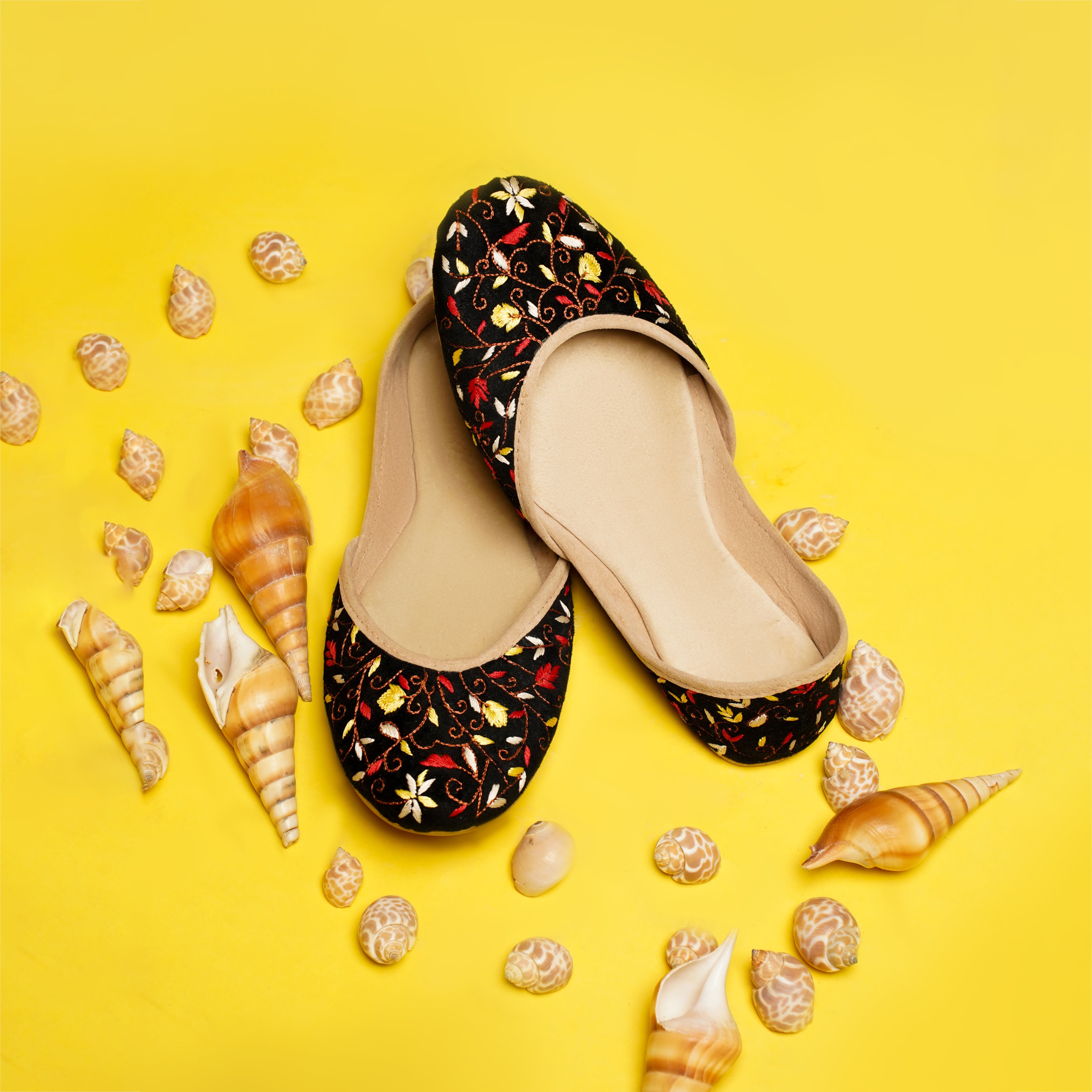 Delicate yet intricate embroidery of ‘phool’ crafted on a dark solid base, highlighted with orange and yellow embroidered leaves is treasure that’s a must have for your wardrobe! Inspired by the beautiful Kashmiri handicraft of 'Pashmina' our Khussa is an ode to the union of two of India's most treasured crafts- Jamadar and Jutti making. This pair promises to leave you and everyone around in an awe because of its elegant beauty that shines through a delicate design of leaves twined spreading across the khussa.
