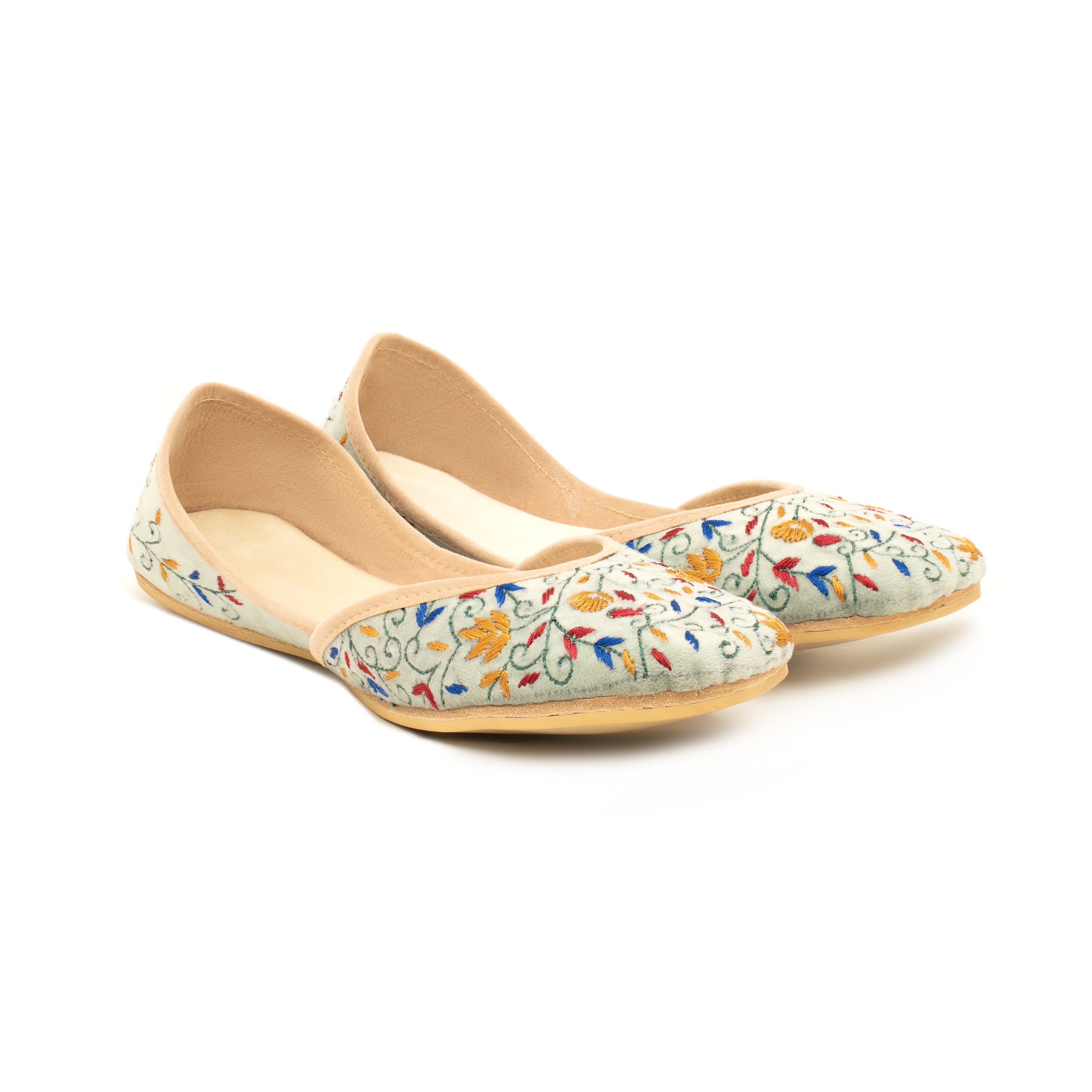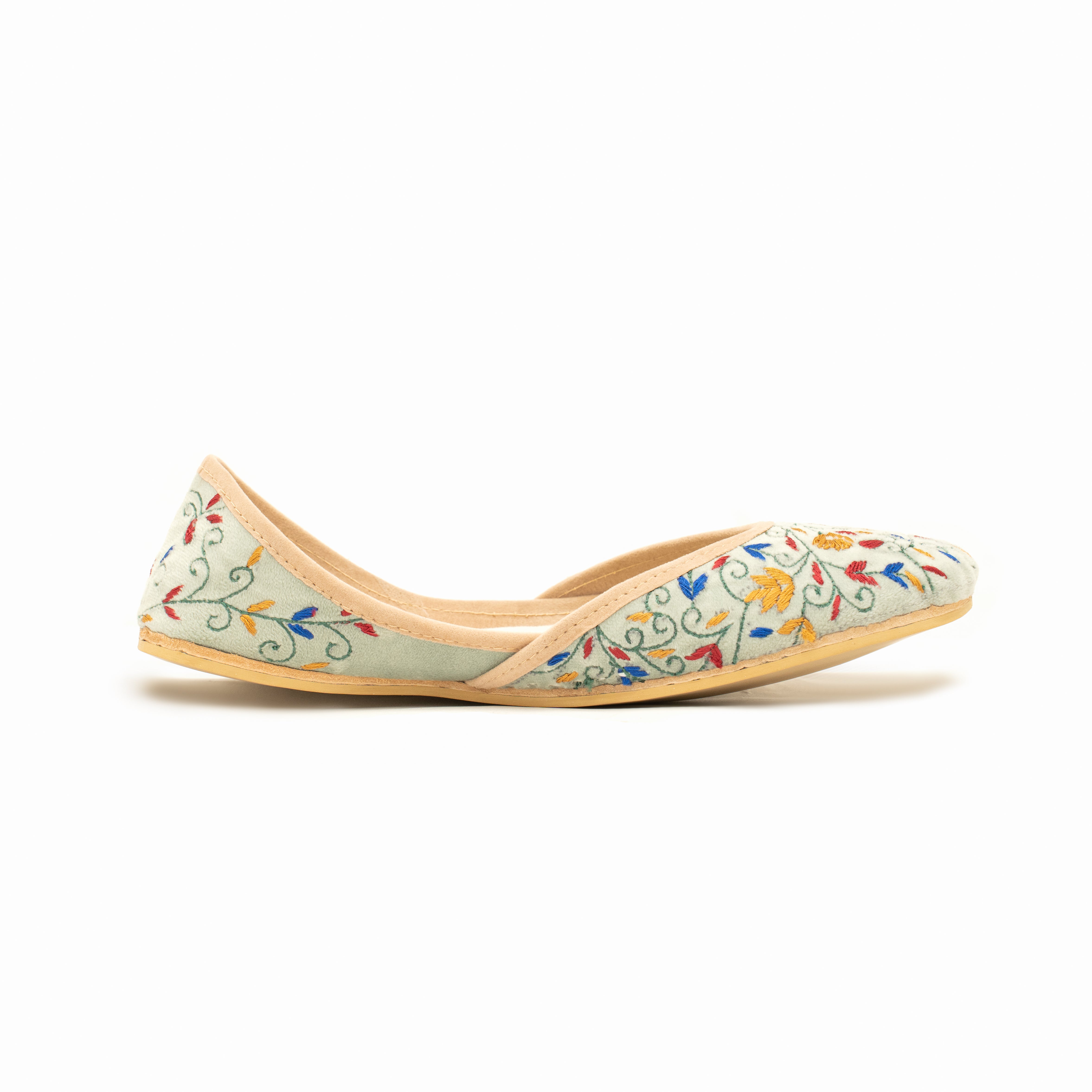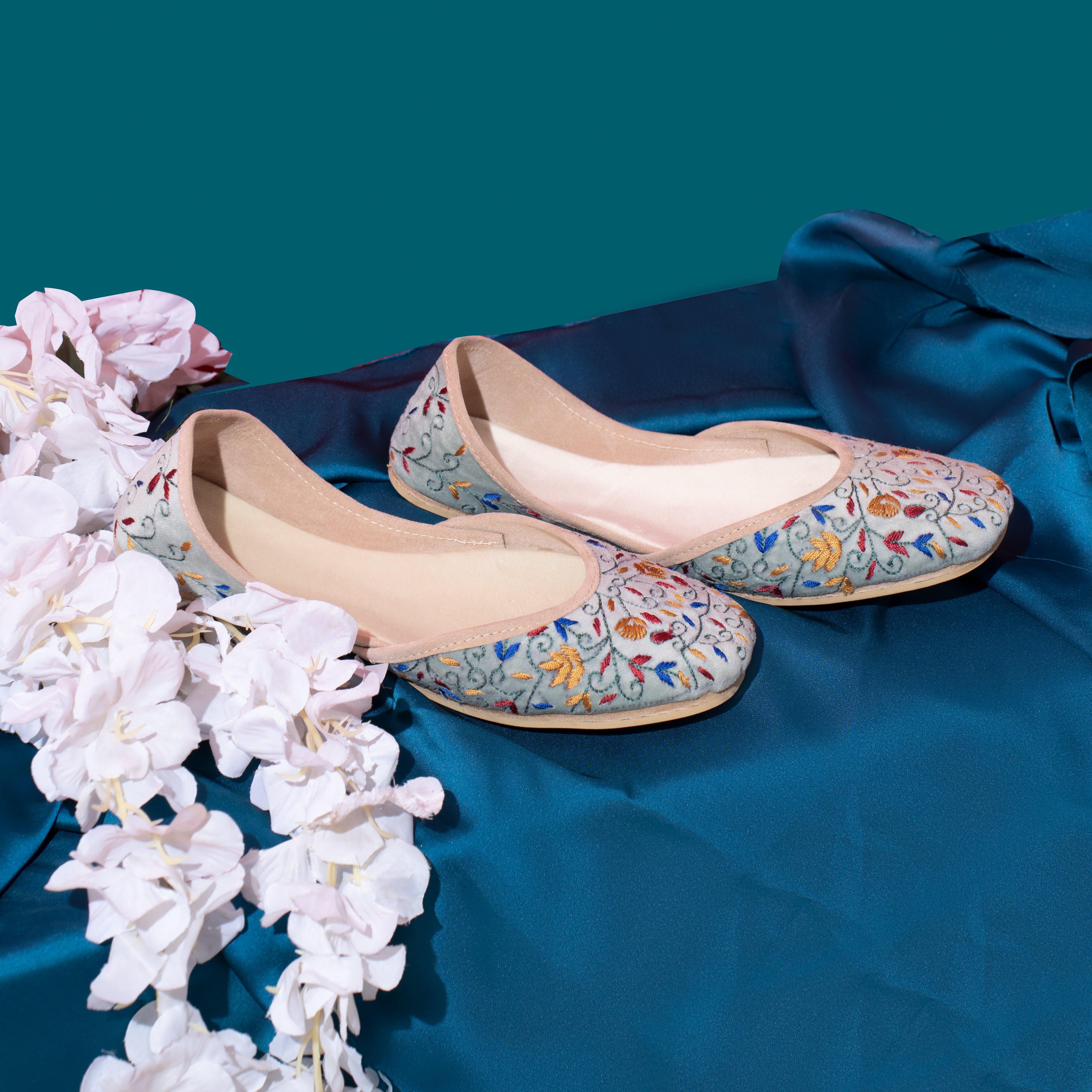 Delicate yet intricate embroidery of ‘phool’ crafted on a Pistachio Colored base, highlighted with orange and Blue embroidered leaves is treasure that’s a must have for your wardrobe! Inspired by the beautiful Kashmiri handicraft of 'Pashmina' our Khussa is an ode to the union of two of India's most treasured crafts- Jamadar and Jutti making. This pair promises to leave you and everyone around in an awe because of its elegant beauty that shines through a delicate design of leaves twined spreading across the khussa.