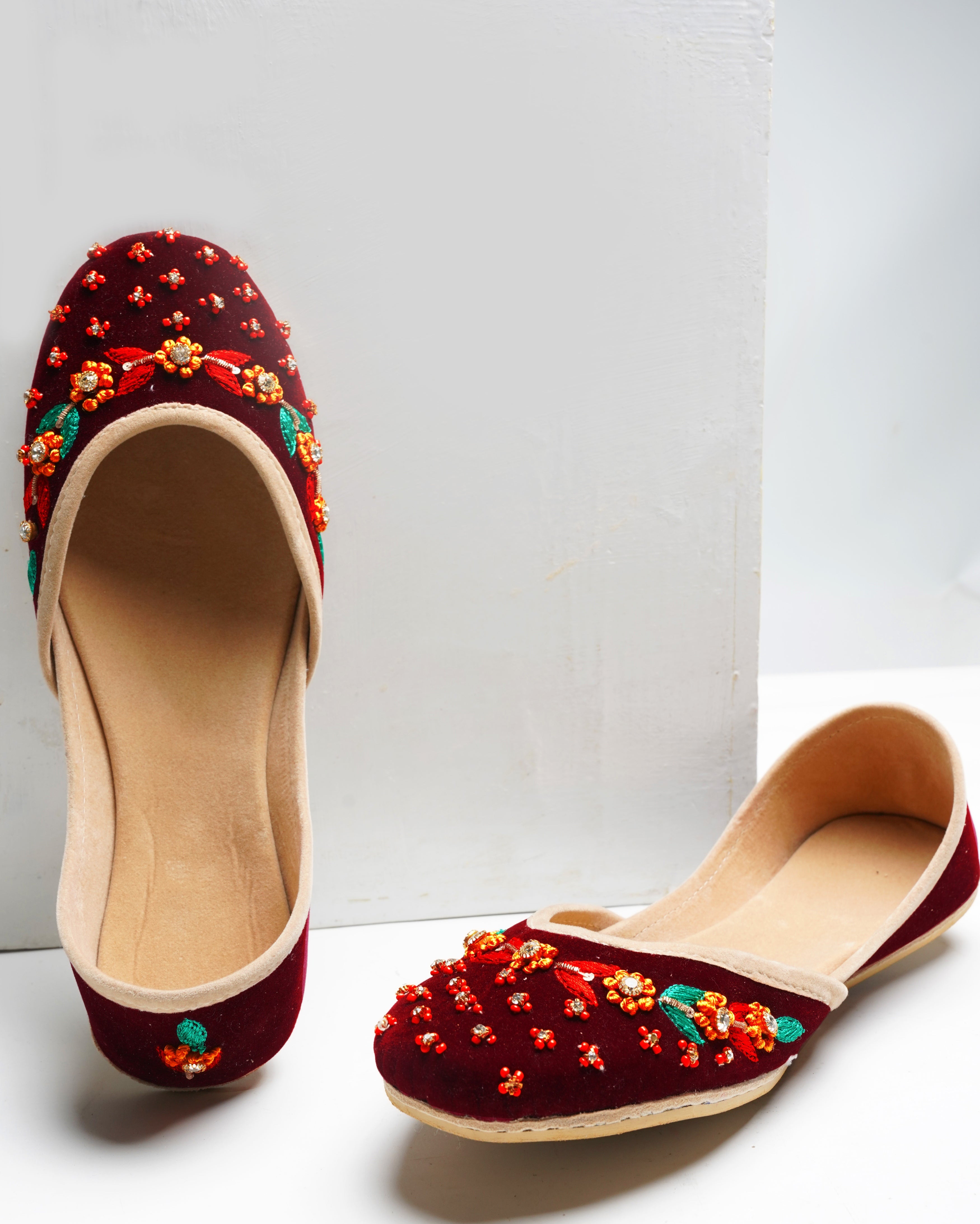 Layla is a deep dark maroon Khussa with embellishments such as French knots, stone work, beaded petals and embroidery adorning it. It displays a warm color palette with orange, red, yellow and green used over the dark maroon base.