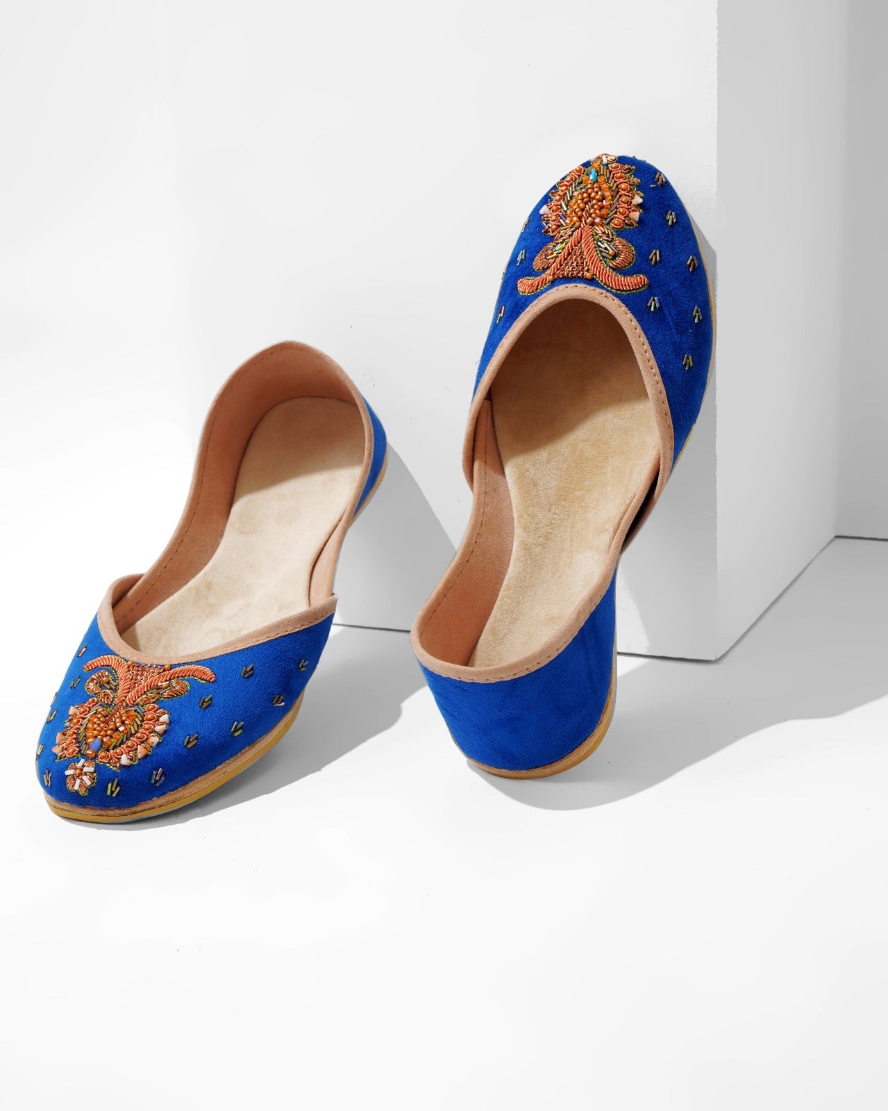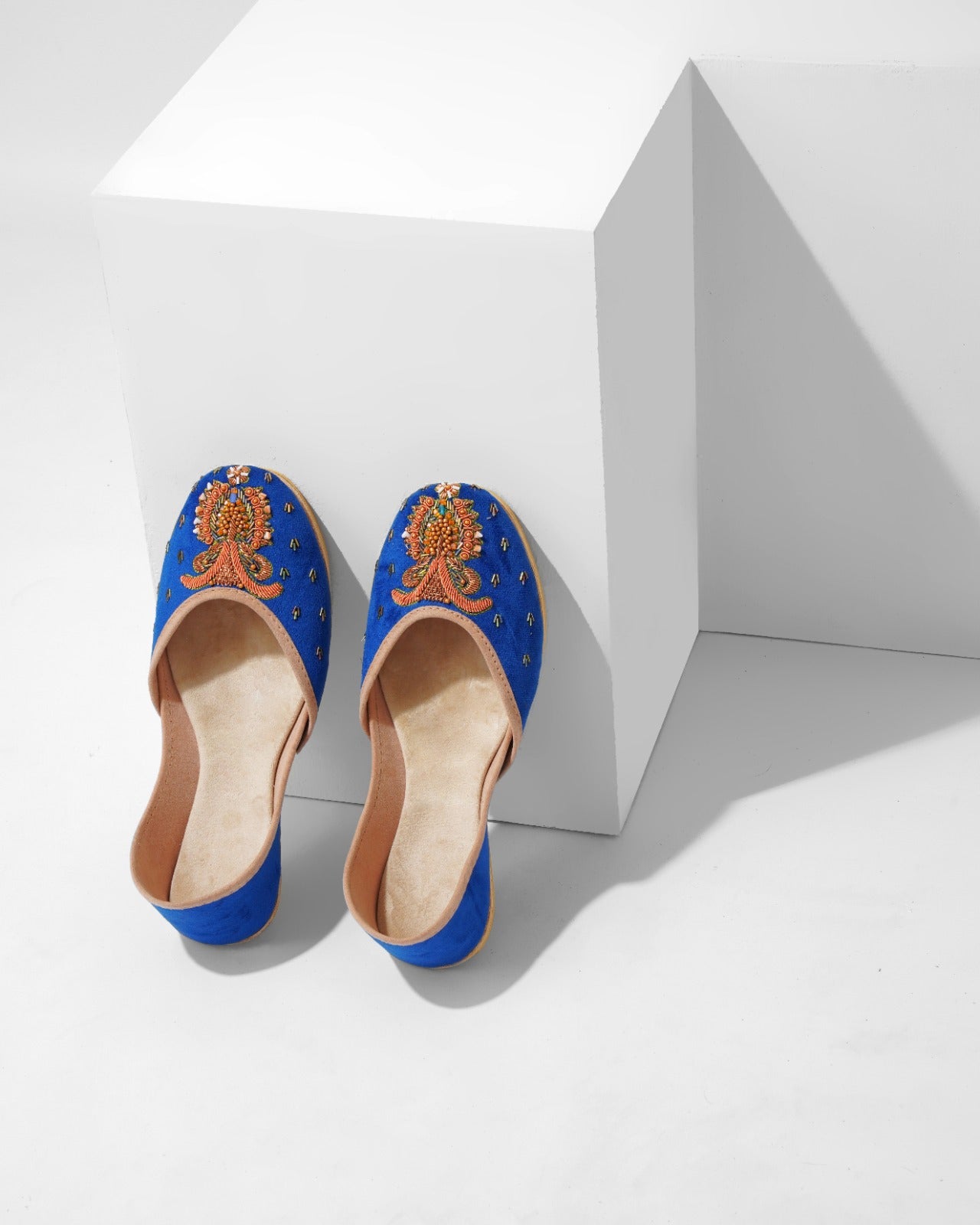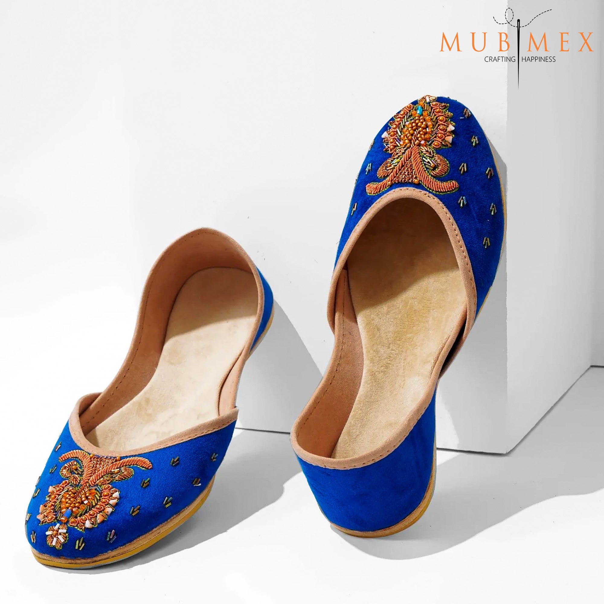 Intricate thread embroidery, fashioned from a spectrum of different colors, conjures up a floral pattern that weaves around the deep blue valvet base of the khussa. Fine dabka and knot embroidery elements dot the pattern and subtly enhance it. Mehr-O-Mah is the perfect khussa to be coupled with a soft, pastel outfit, to bring out the rich contrast. It’s like a halo of spun gold, incandescent with a love for life and pleasure. Mehr-O-Mah is Meticulously crafted by skilled artisans, and requires hours of expert workmanship to create. From selecting the finest quality leather to adding intricate designs and embellishments, every step in the process is a testament to the artisan's dedication to excellence.