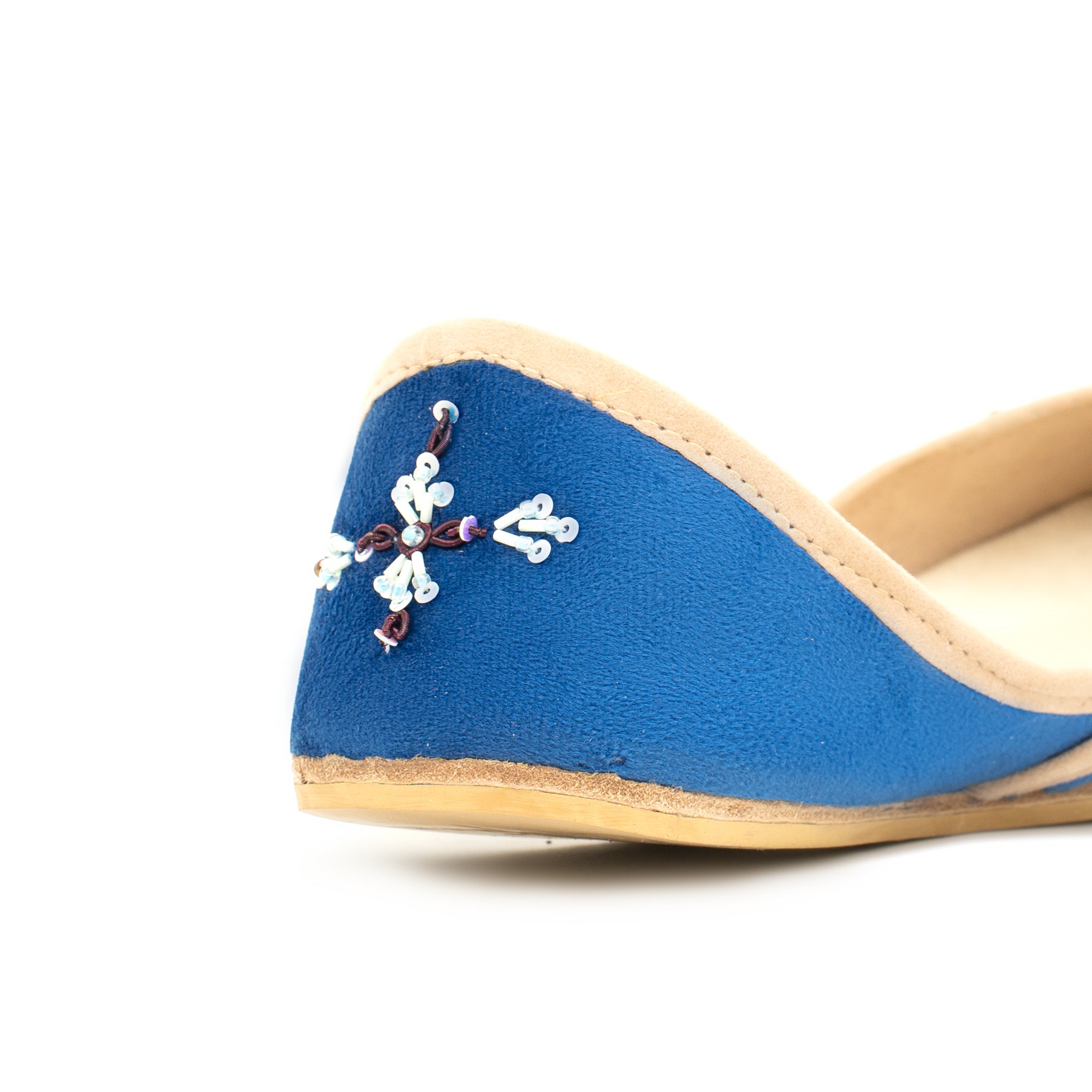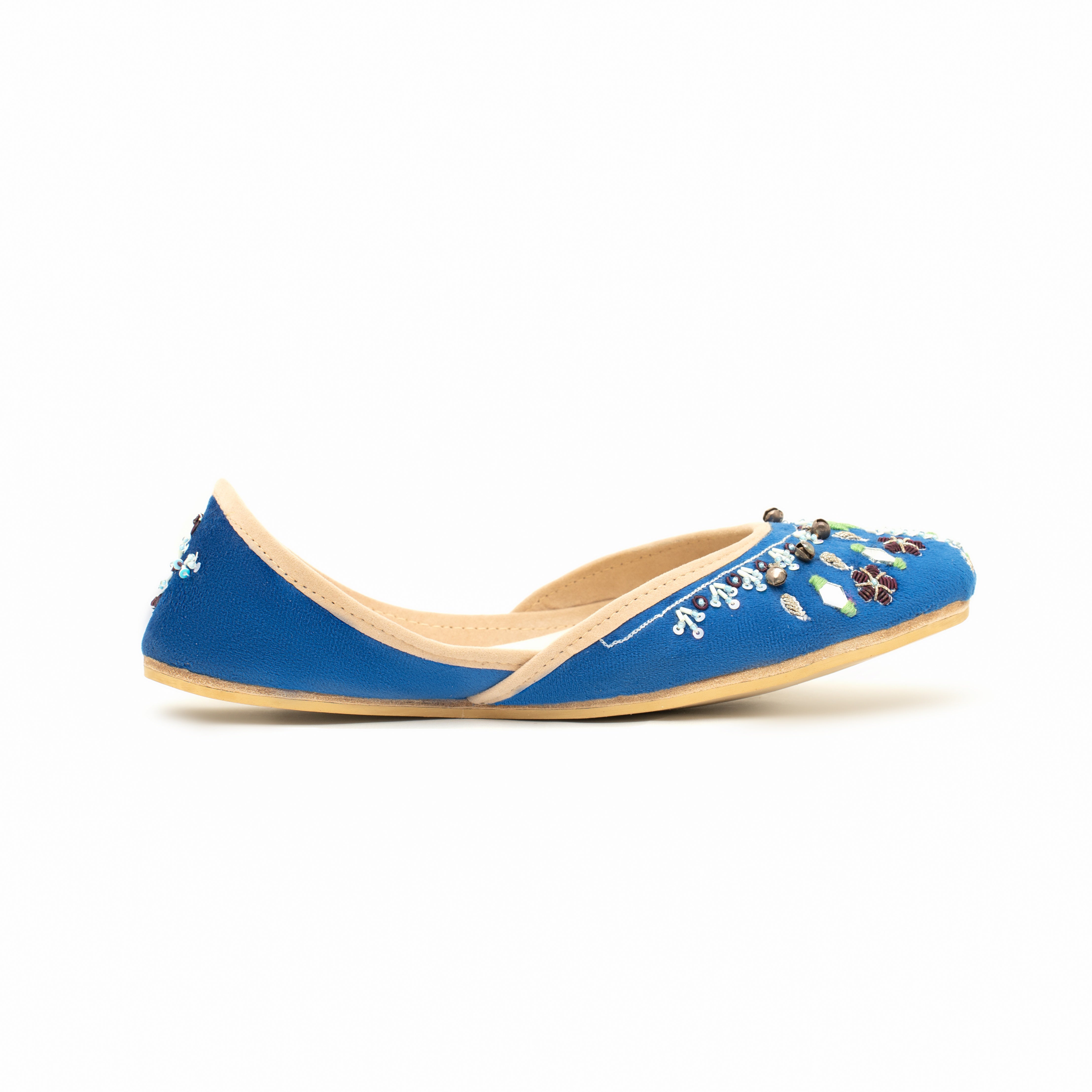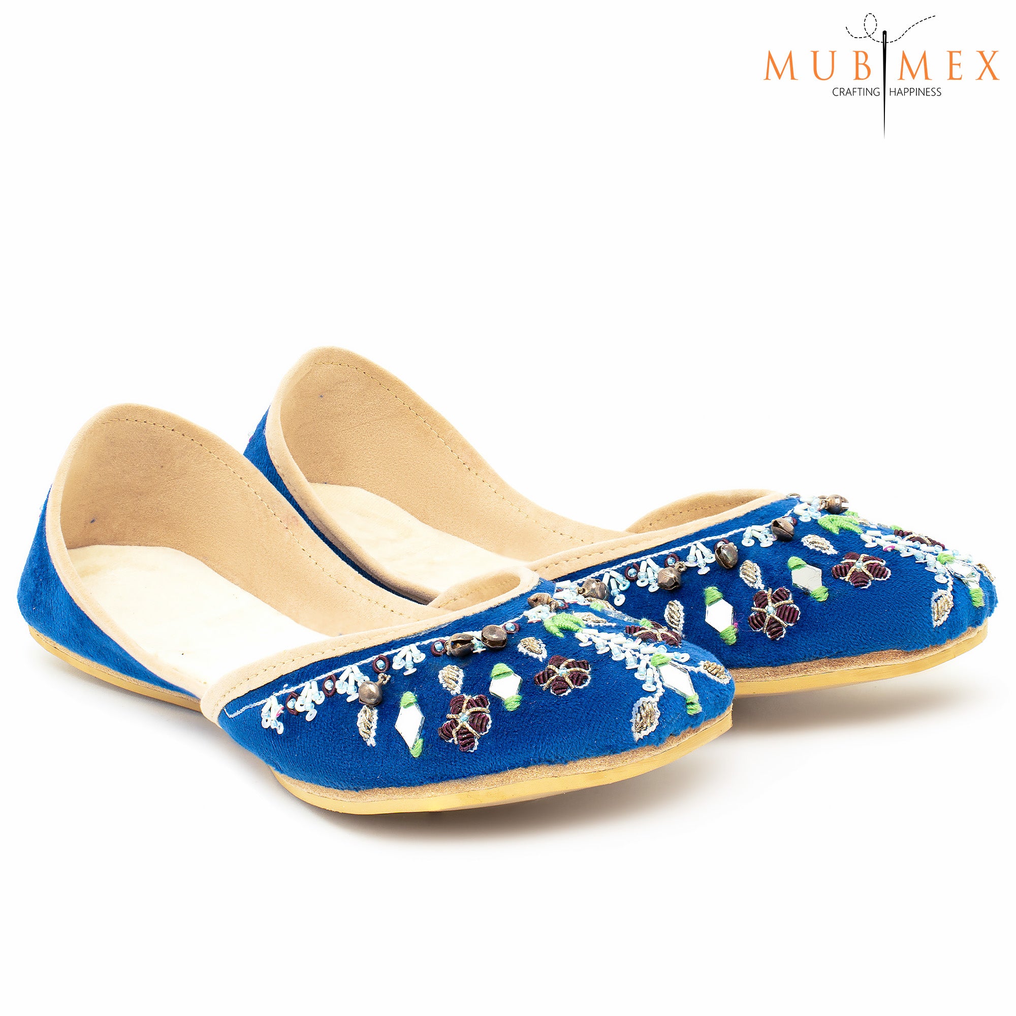It’s beautiful to look at, it pairs just perfectly with any outfit and its comfort promises a walk like on the clouds. This deep blue velvet khussa is an epitome of grace and beauty and undoubtedly a must have in every closet. It’s time to transport yourself to a world of intricate beauty and cultural finesse with these captivating blue khussas, a masterpiece of craftsmanship. Each pair is a labor of love, meticulously handcrafted by skilled artisans. The velvety soft blue base serves as a canvas for an enchanting symphony of hand-stitched flowers, each petal and leaf a testament to the artisans' artistry and attention to detail. The allure of these khussas is elevated to new heights with the addition of mesmerizing sheesha work in stunning green and rich brown tones. The sheesha, or mirror work, reflects light like sparkling jewels, casting a spellbinding aura with every glimmer. The intricate patterns create a mesmerizing mosaic of color and shine, turning each step into a graceful dance.