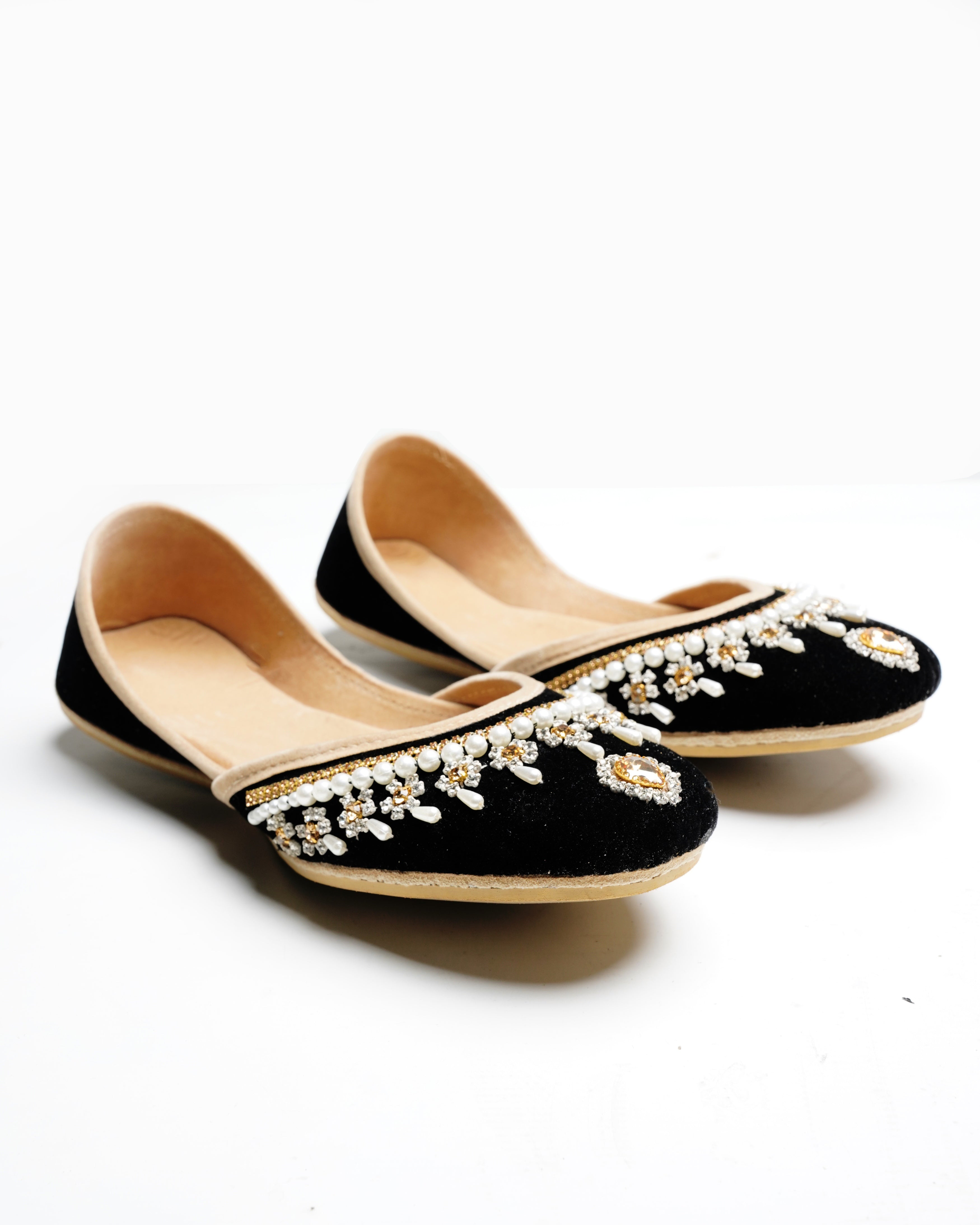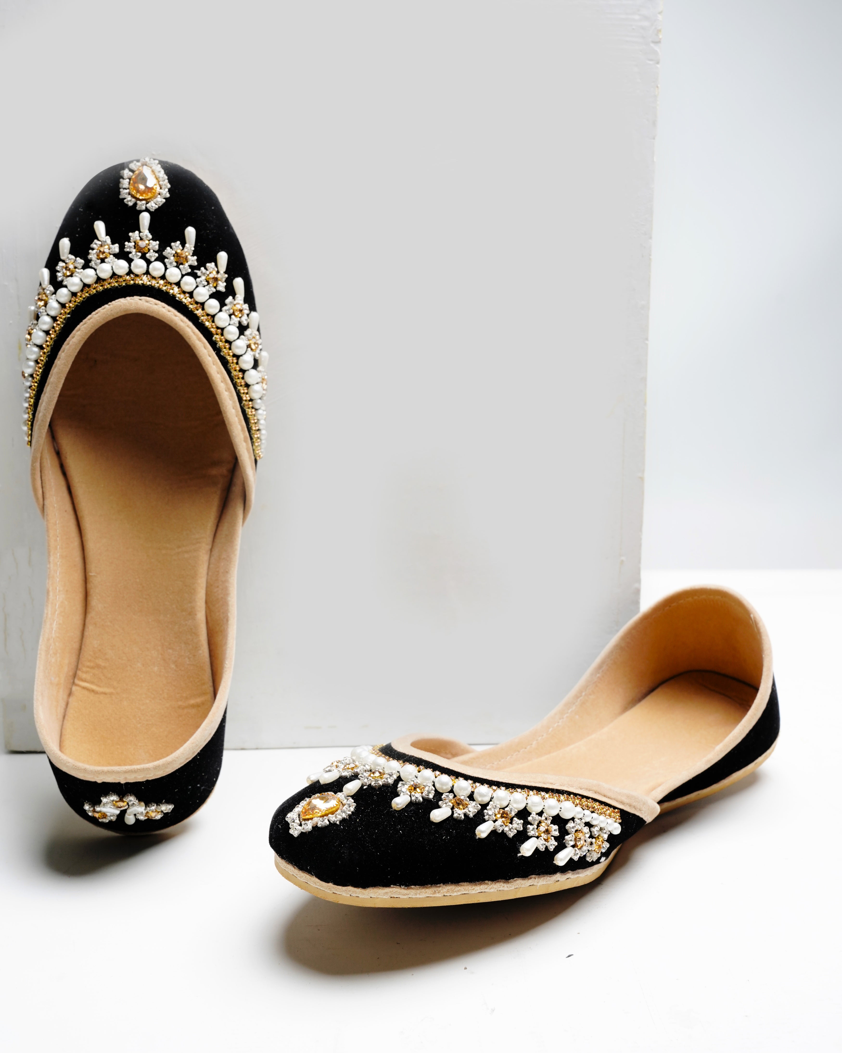 Nourey is a festive Khussa with black velvet base embellished in shades of gold, white and silver. The arch of the Khussa has a crystal design with the middle showcasing a statement motif.
